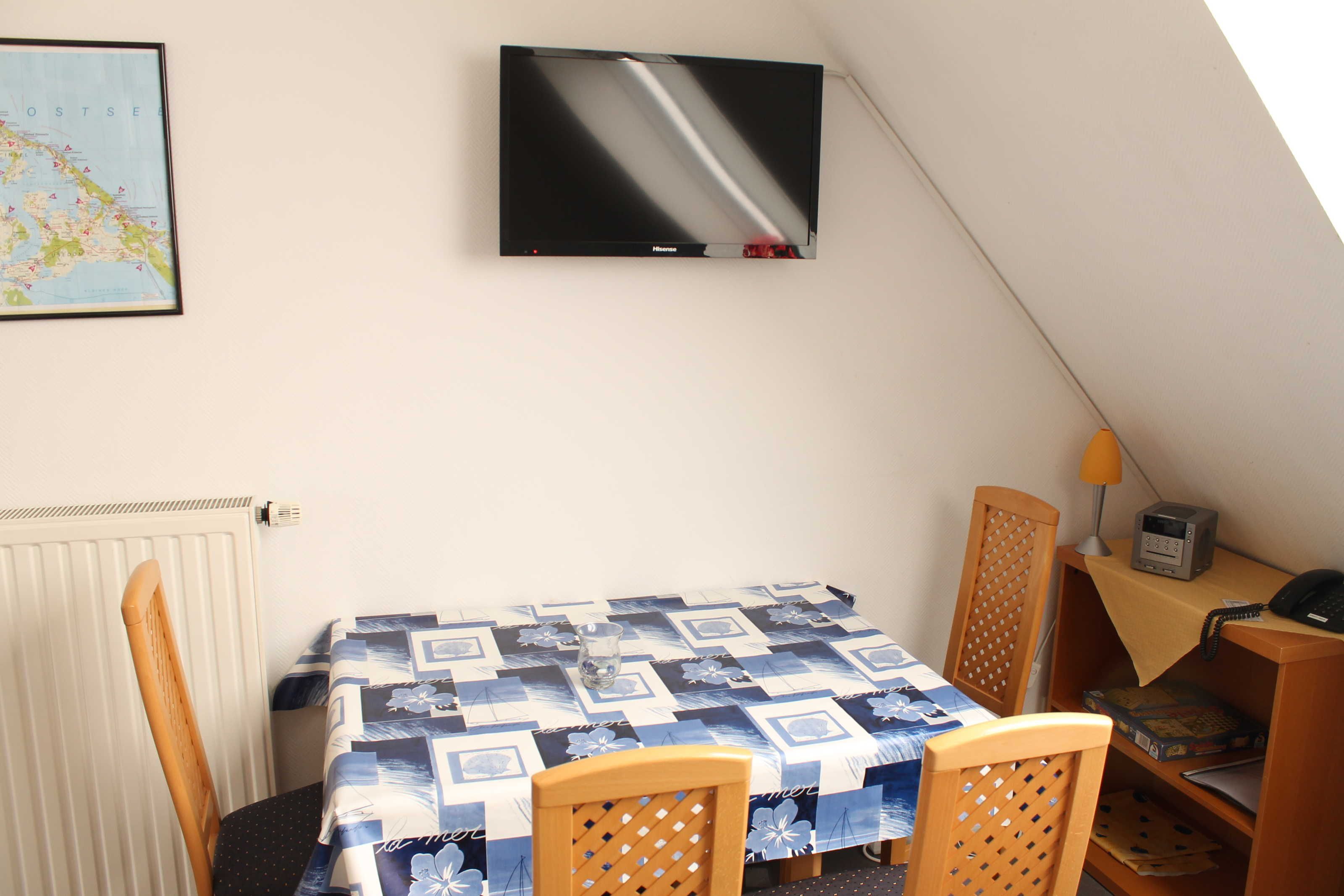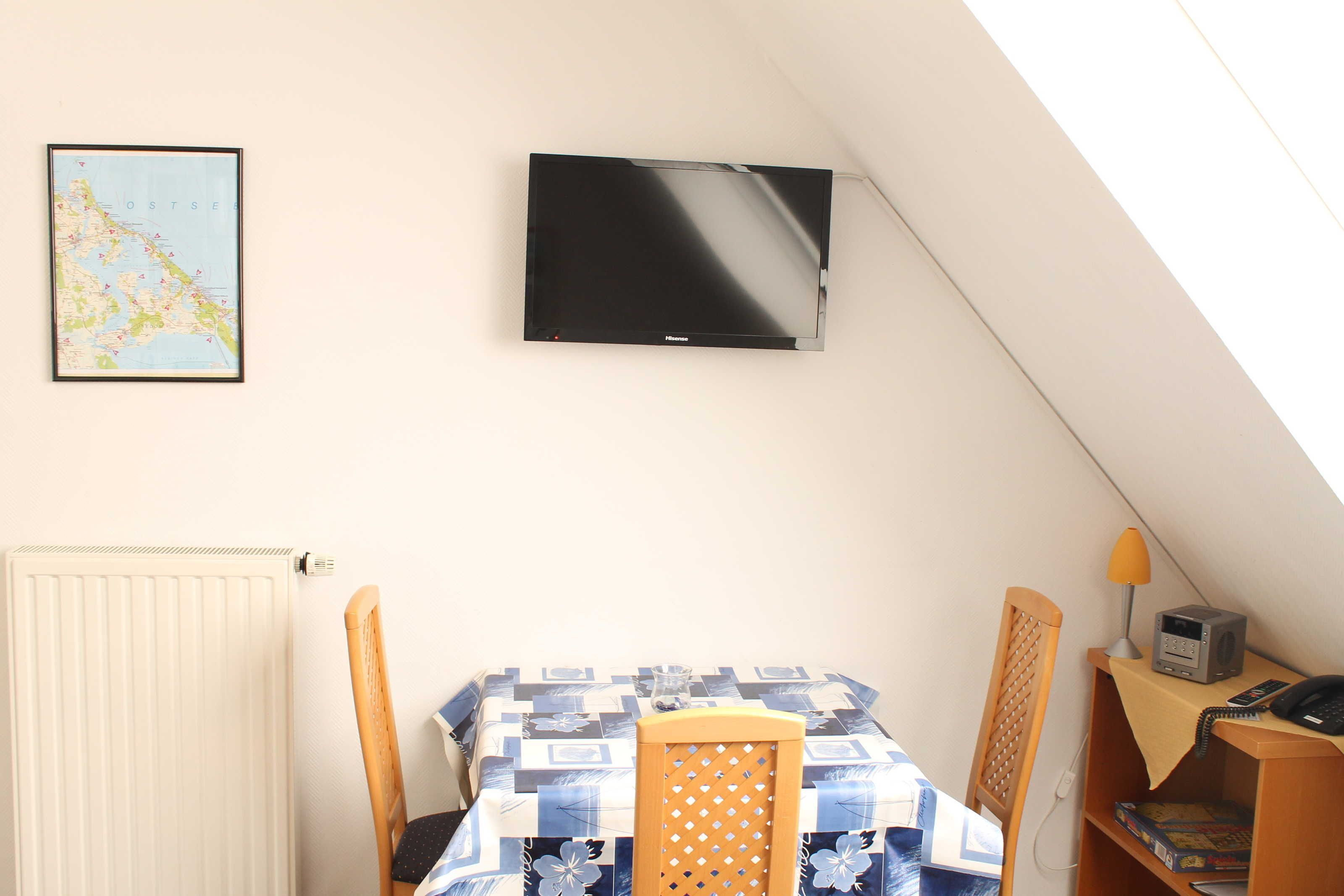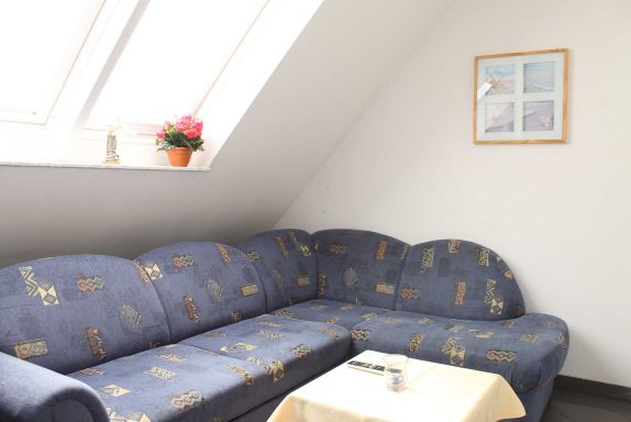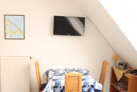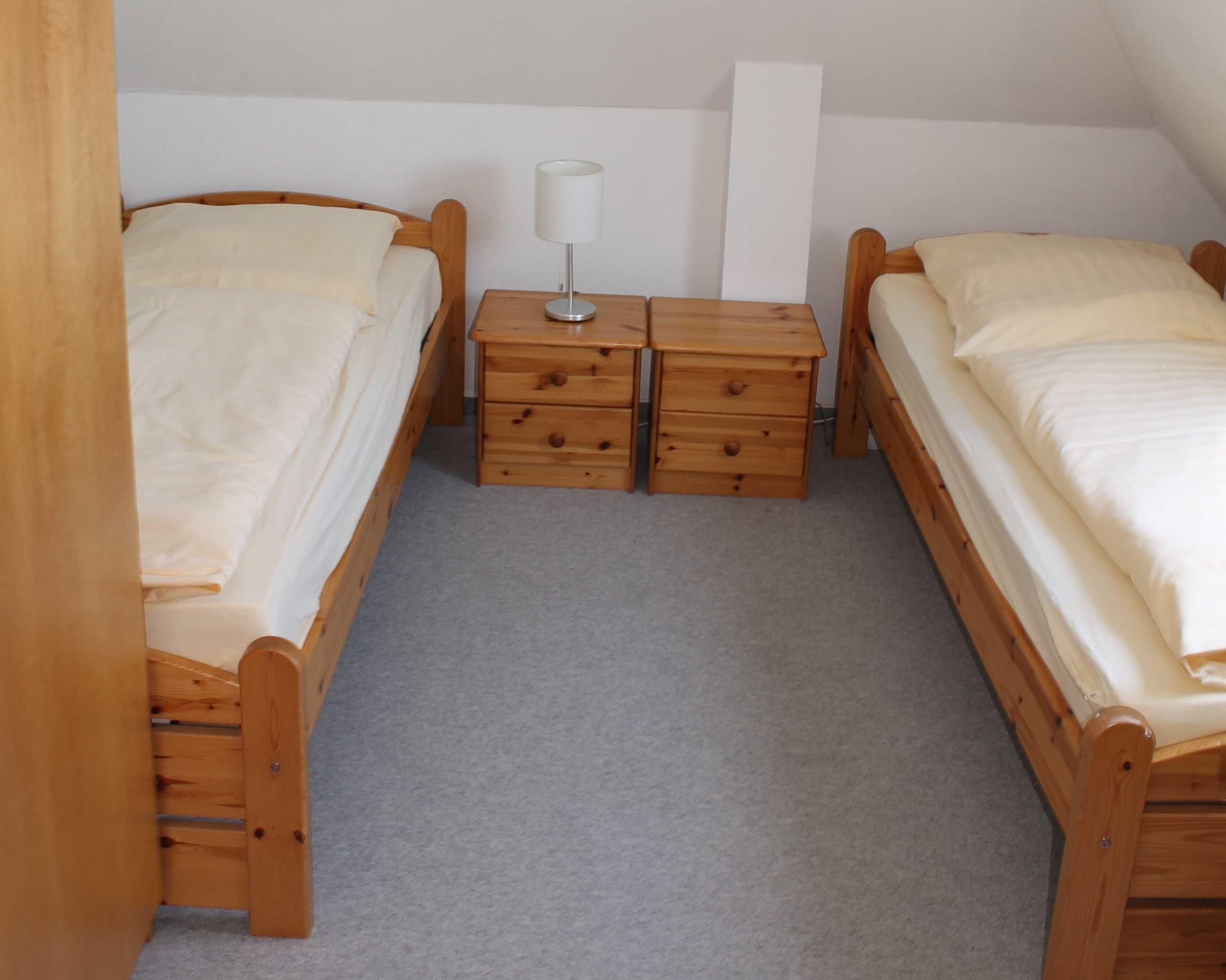Sie wohnen in einer 45 qm großen 3-Raum Komfort-Dachgeschoß-Wohnung für 4 Personen. Der helle Wohnbereich hat eine komfortable Wohnlandschaft mit Essbereich. Die angrenzende, offene Küchenzeile ist ausgestattet mit einen 2 Platten Kochfeld, Kühlschrank, Spülmaschine und Kaffeemaschine. Über eine Raumspartreppe (steile, gewendelte Treppe, nicht geeignet für Ältere & Kleinkinder) erreichen Sie die beiden Schlafräume. Ein Schlafraum verfügt über ein Doppelbett mit Kleiderschrank, das andere Schlafzimmer hat 2 Einzelbetten und einen Kleiderschrank. Das Bad verfügt über eine Dusche, Waschbecken und WC. Die Dachgeschosswohnung ist mit Direktwahltelefon, WLAN und LED TV ausgestattet. Auf dem Grundstück steht den Gästen eine Terrasse zur Verfügung. Die Erstausstattung Bettwäsche und Handtücher ist bereits inklusive.