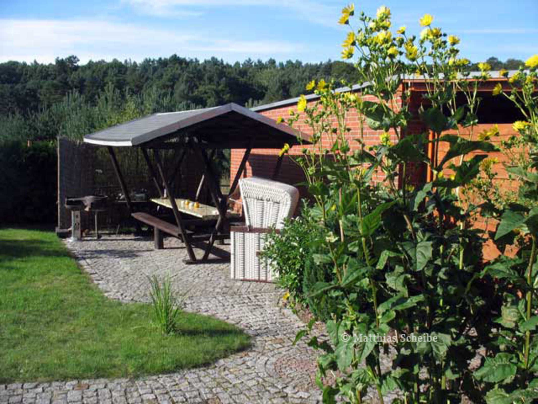Das großzügige Grundstück mit gemütlicher Sitzecke und Grillplatz lädt zum Verweilen ein.