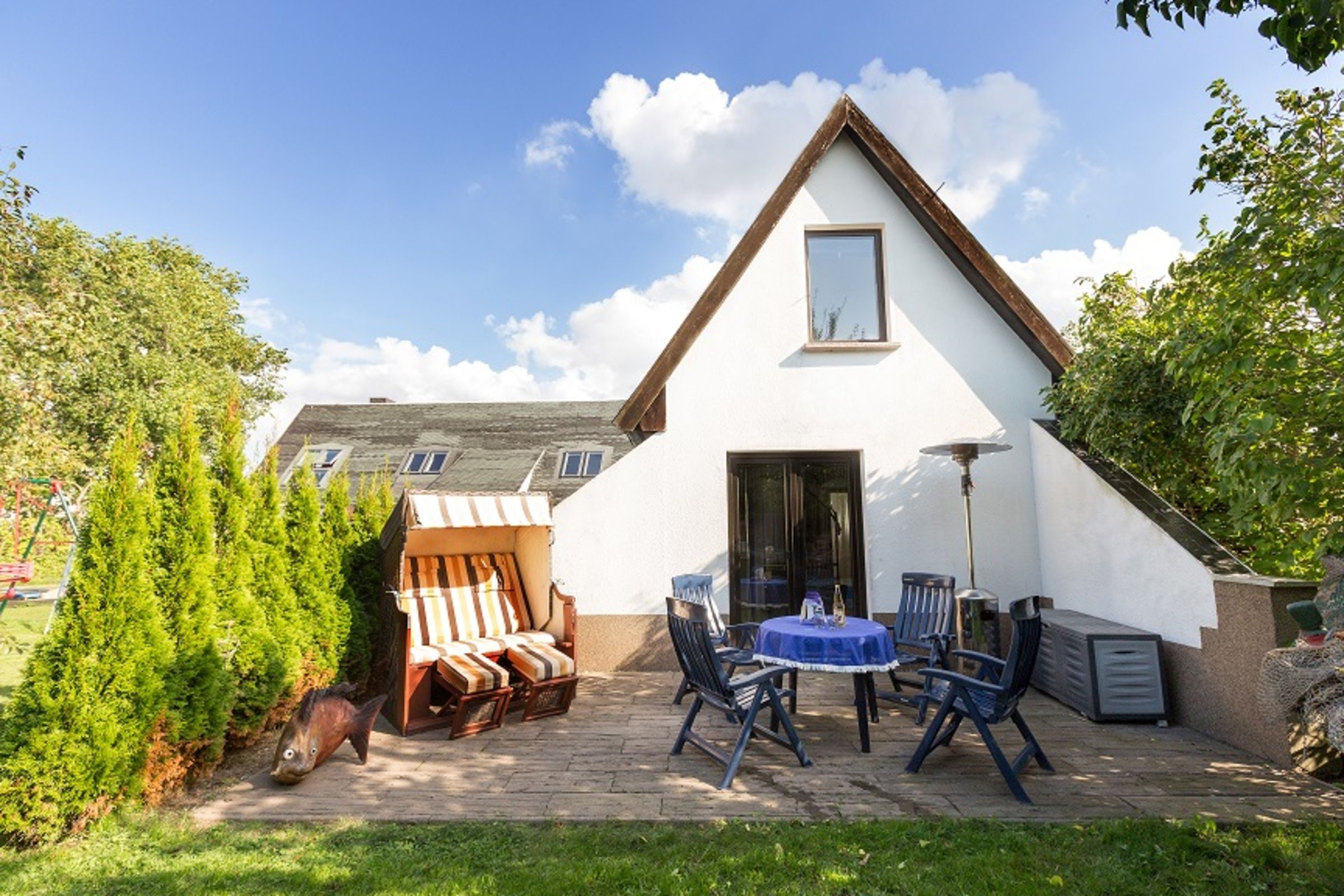 Maritim und modern möbliertes 2 Etagen-Ferienhaus (45 m²) mit 2 Sonnenterrassen und umgeben von alten Obstbäumen auf großem Gartengrundstück. Für 1 - 4 Pers. (1 Aufbettung 12,50 €/Nacht) - bei Unterbelegung (nur 1 Pers. 12,50 €/Abschlag pro Tag) Bitte beachten: schmale Wendeltreppe ins Obergeschoss!