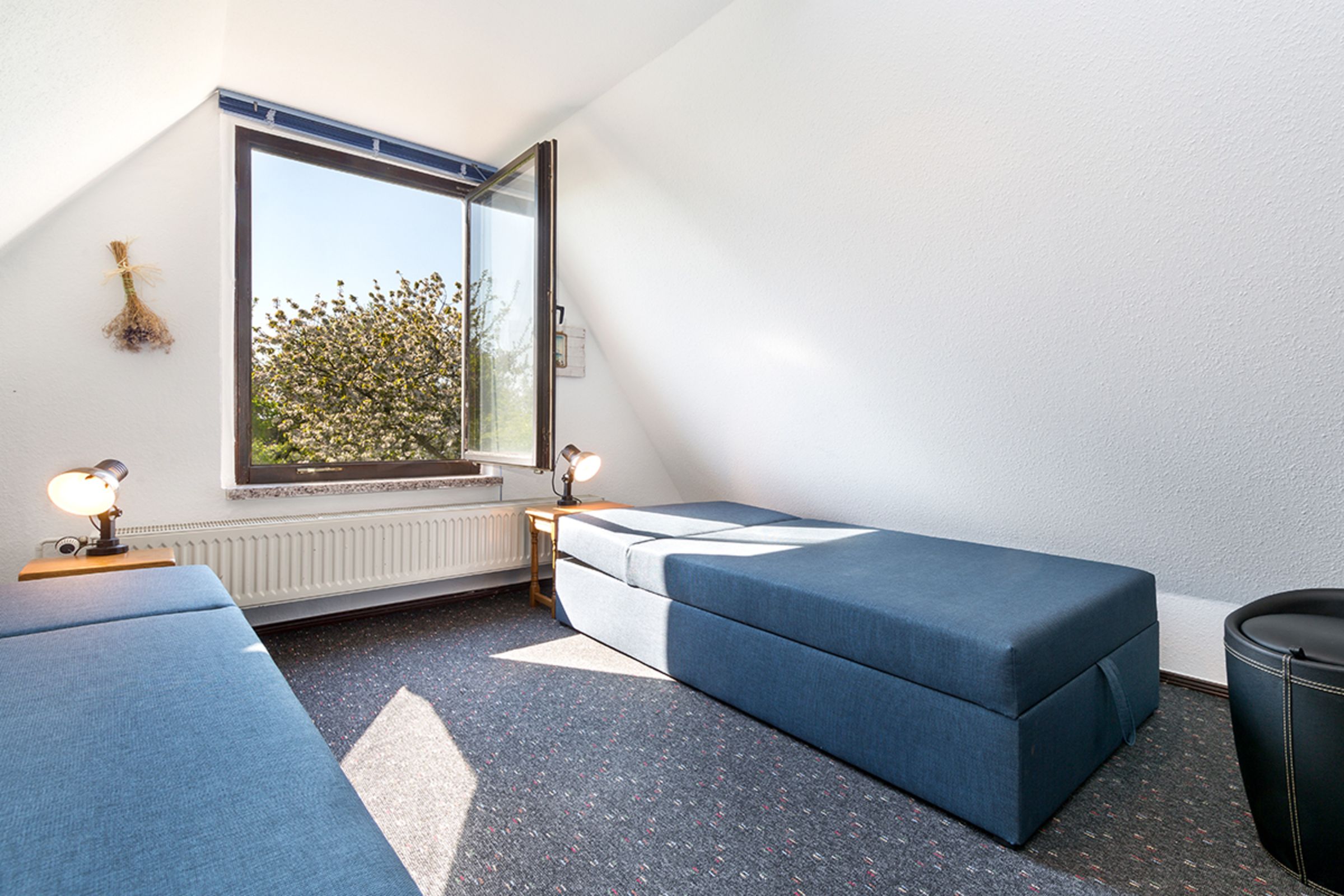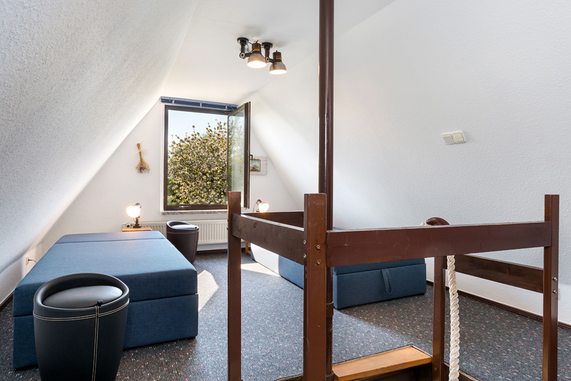 Obergeschoss: großes Schlafzimmer (offener Wendeltreppenzugang) mit zusammenschiebbaren Einzelliegen 0,80 x 2,00 m (Boxspringqualität), Schrank, Durchgang ins kleine Schlafzimmer -