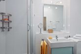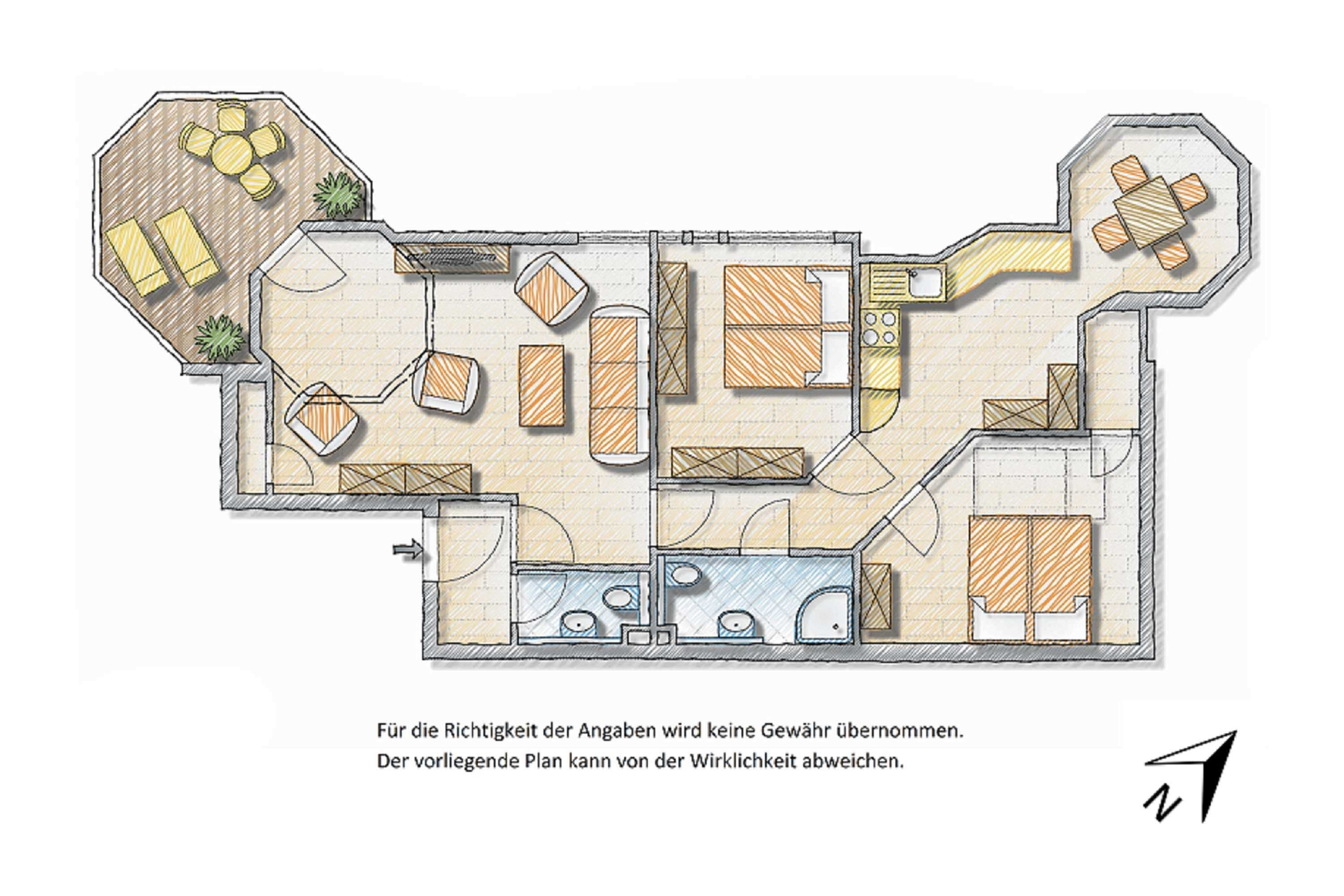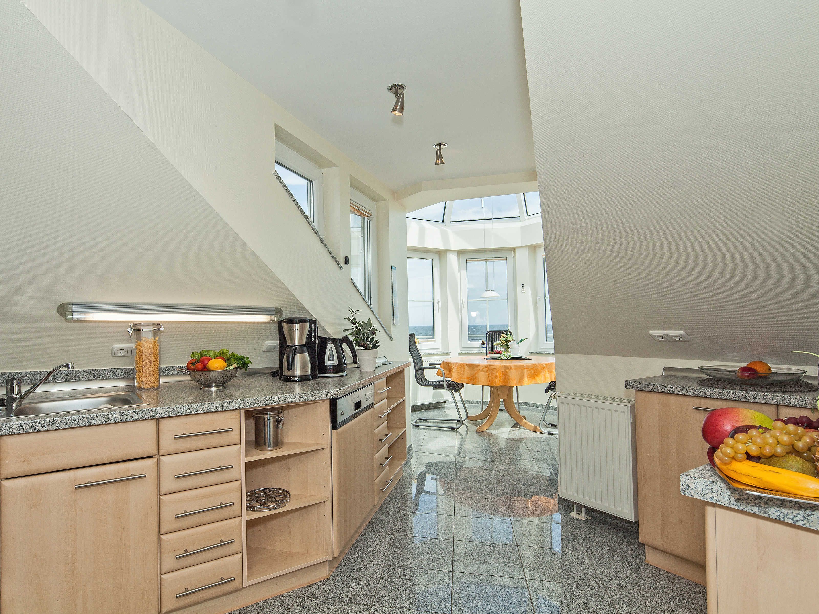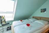 Diese Dachgeschosswohnung - hochwertig ausgestattet - ist aufgeteilt in ein Wohnzimmer, zwei Schlafzimmer, einen bestens ausgestatteten Küchenbereich, ein Badezimmer mit Dusche und ein Gäste-WC.