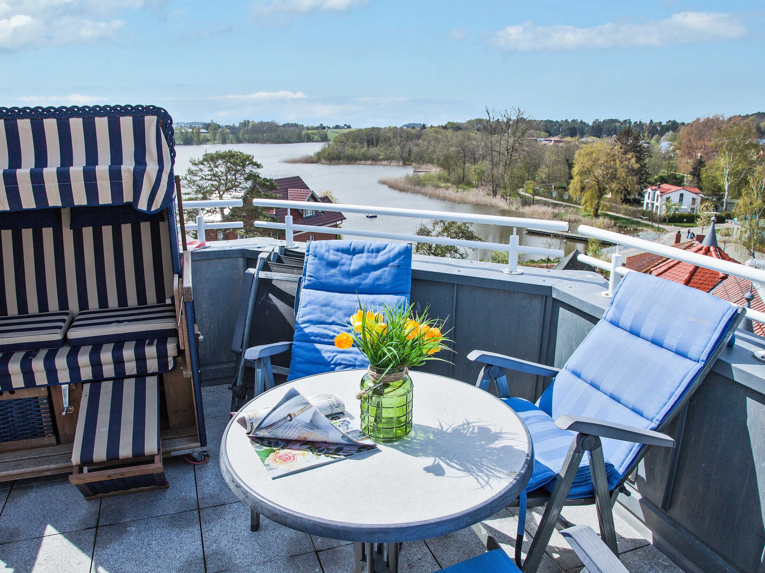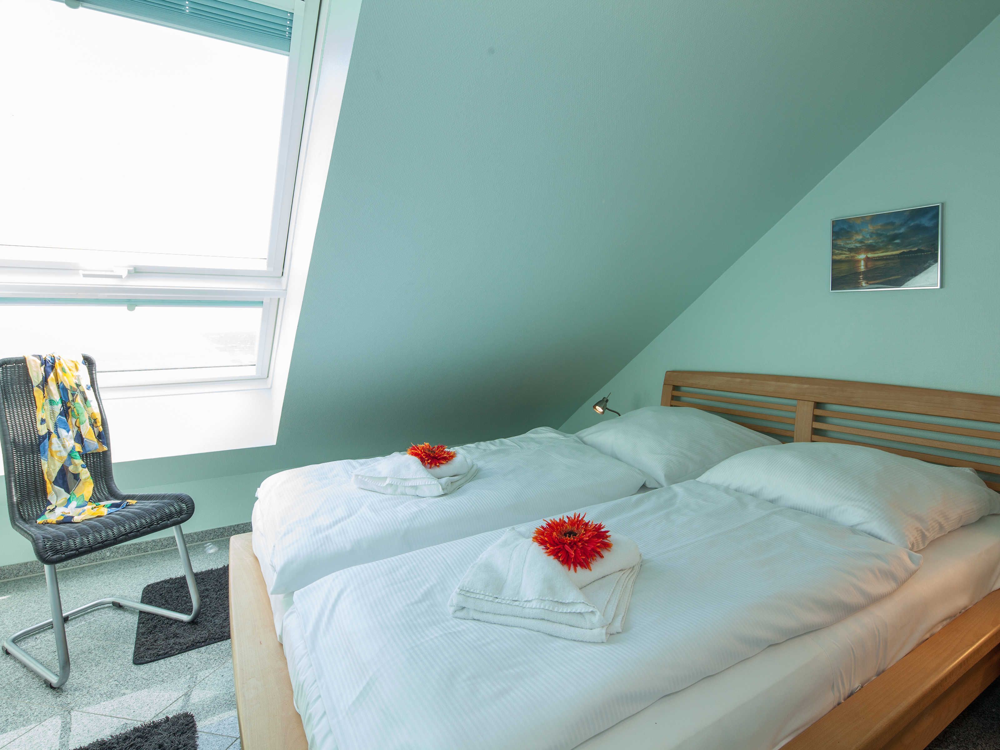 Aus dem angrenzenden Dachturm blickt man direkt auf den davor liegenden breiten, weißen Sandstrand und genießt die unverbaute Sicht auf die pommersche Bucht. Am Horizont kann man die Fahrt der großen Schiffe beobachten. Oder man genießt die Sicht von der südlich gelegenen, großflächigen Dachterrasse - hier steht auch ein Strandkorb für Sie bereit.
