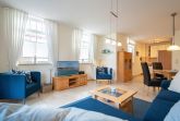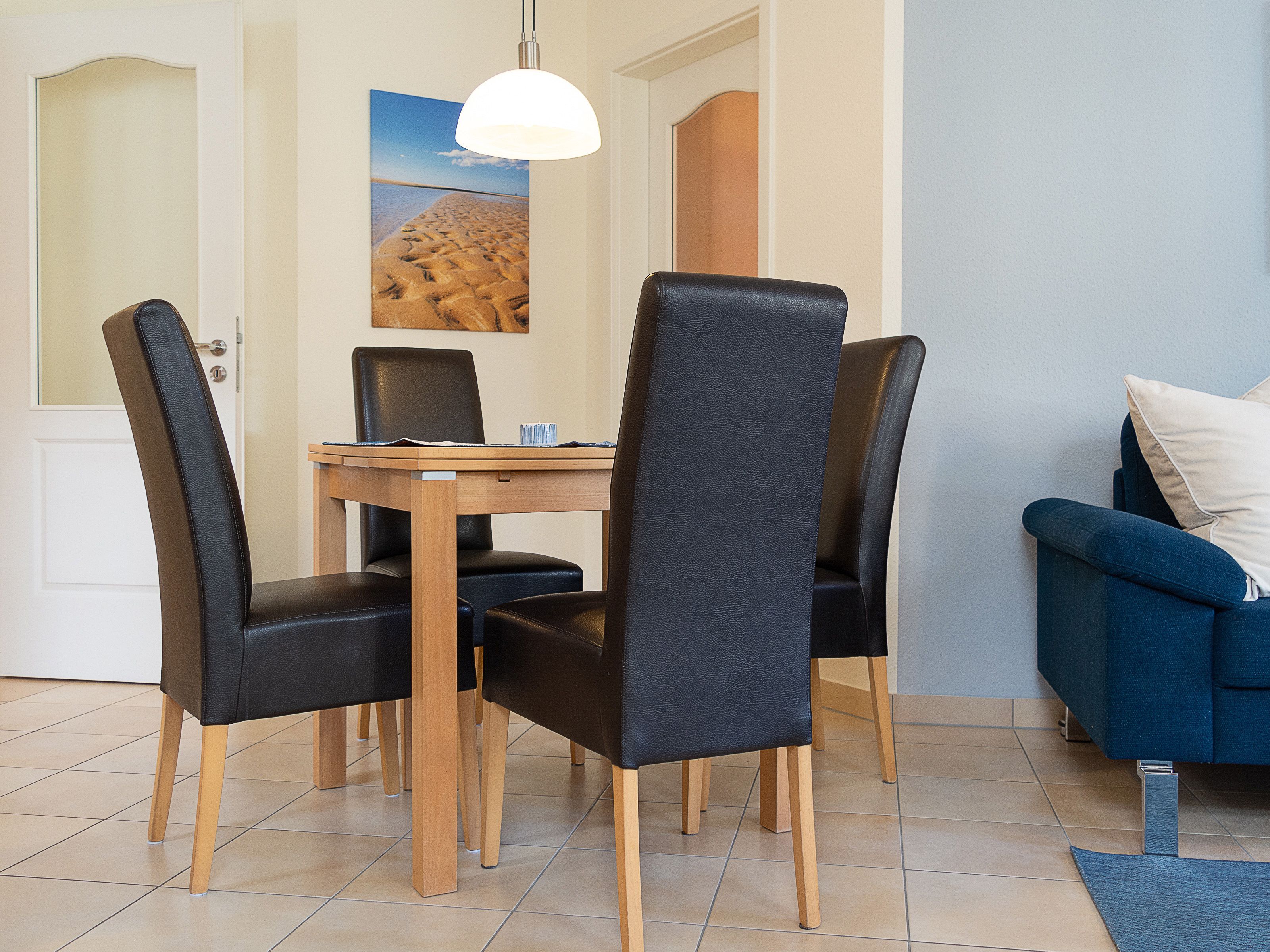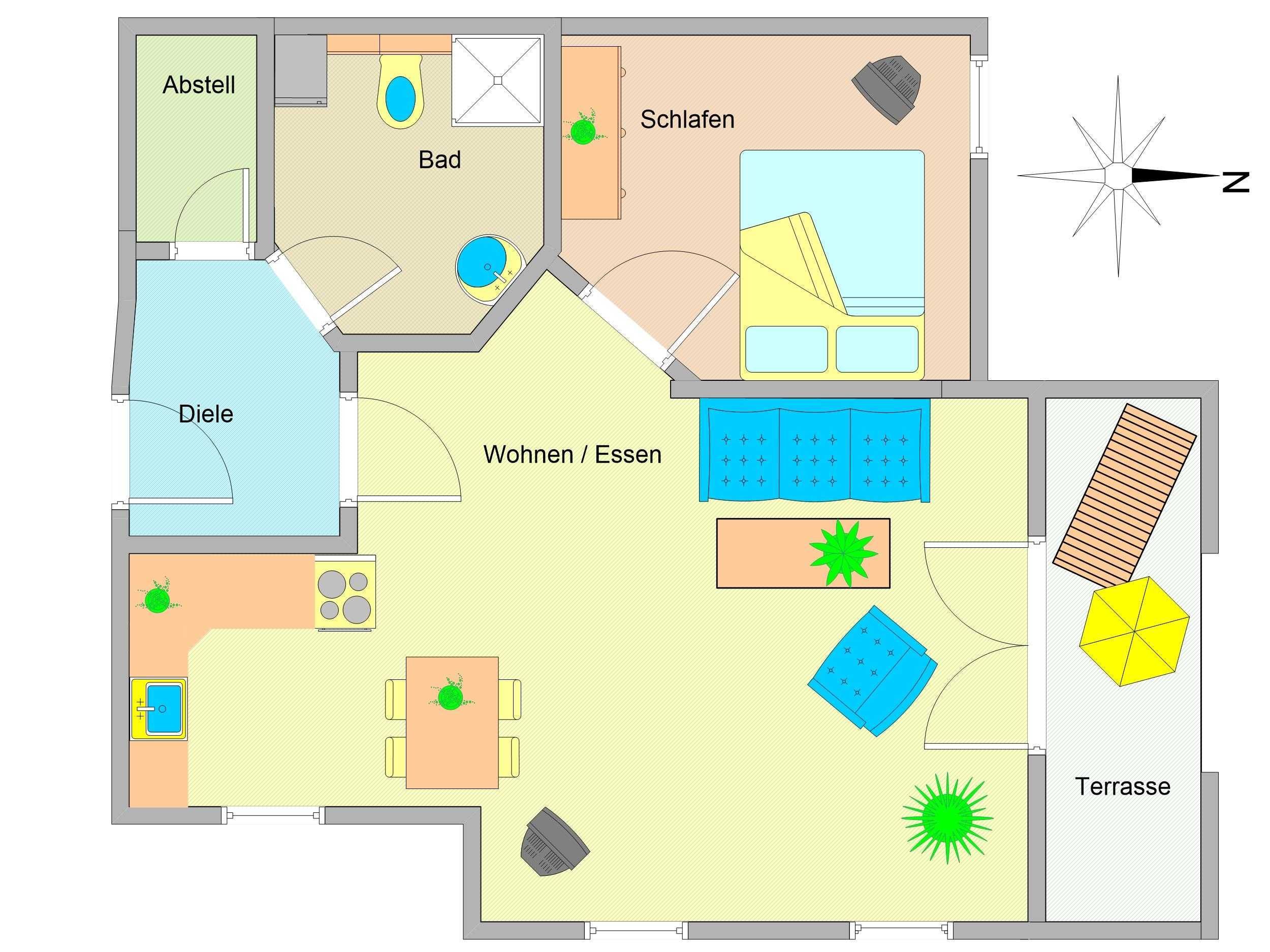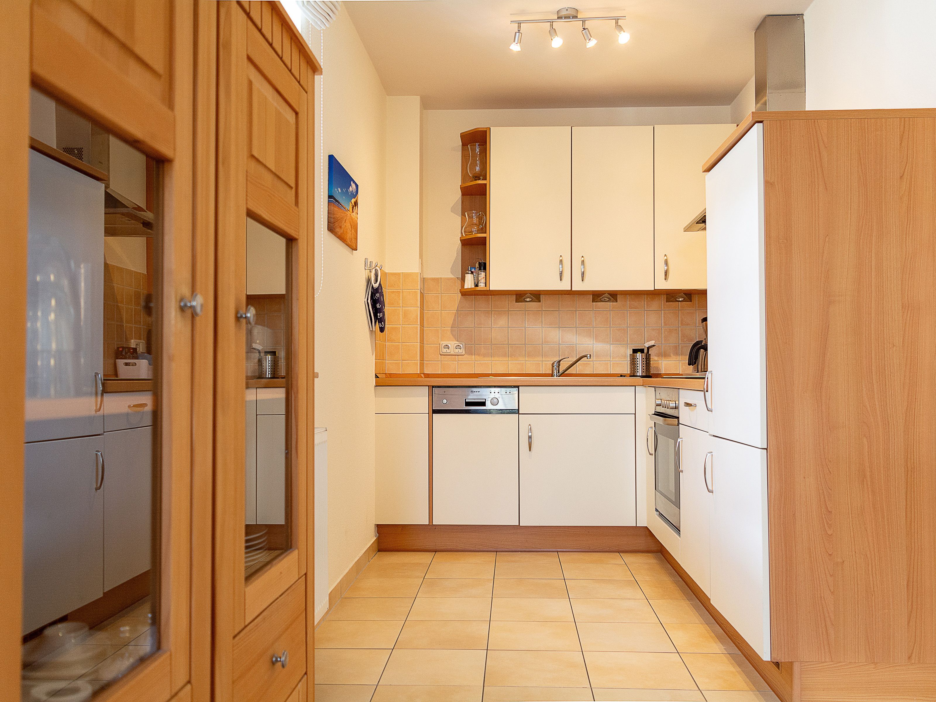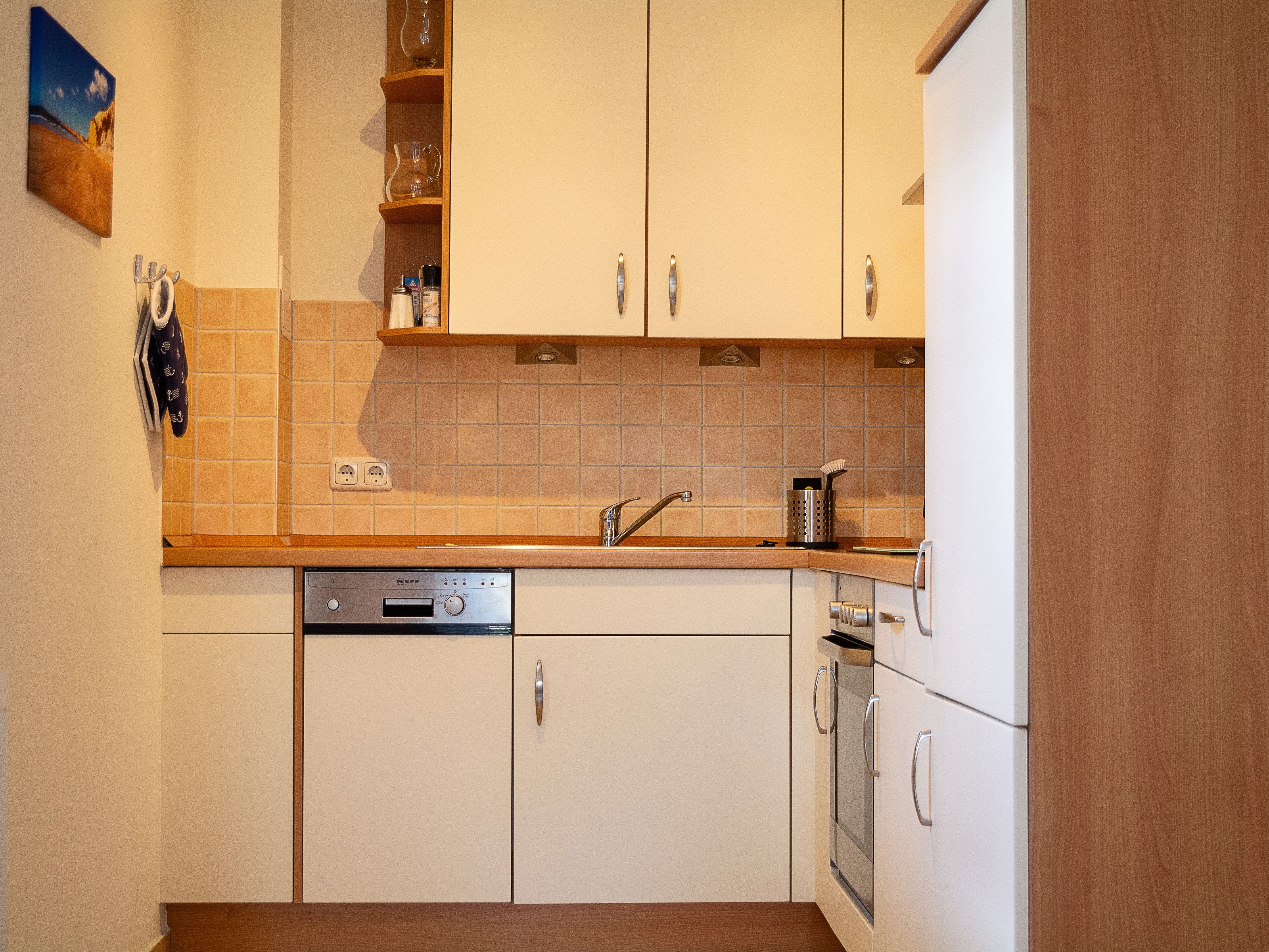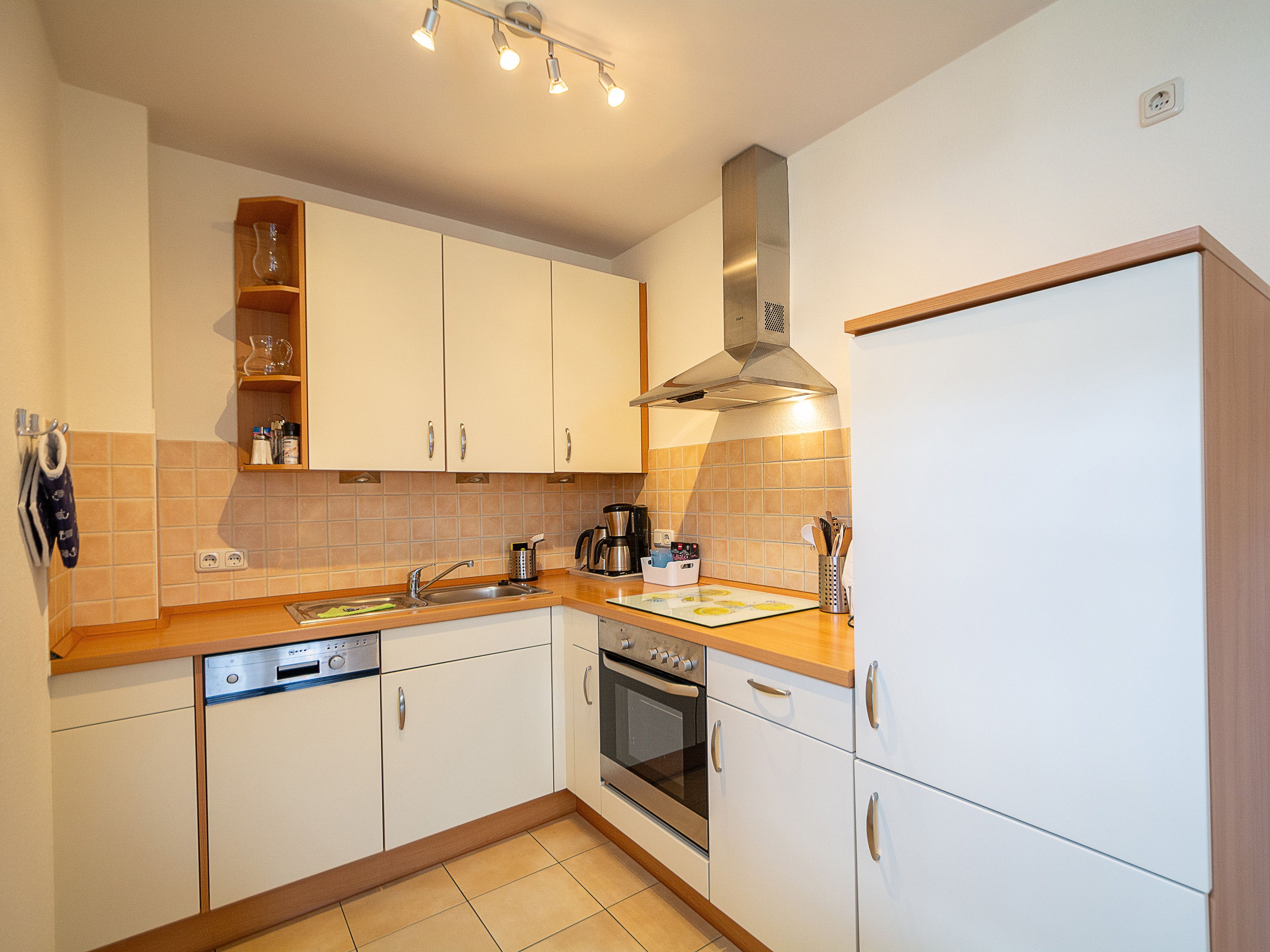 Sie wohnen in einer liebevoll eingerichteten und praktisch geschnittenen 2-Raum-Wohnung von ca.57qm Größe zuzüglich einer überdachten Terrasse. Die Wohnung befindet sich im Erdgeschoss, der KFZ-Stellplatz direkt vor der Tür. Der offen gestaltete Wohn- und Essbereich ist mit bequemer Sitzgarnitur, Radio und TV-Gerät eingerichtet. In der vollständig ausgestatteten Küche finden Sie u.a. Herd mit Backofen, Geschirrspüler, Kaffeemaschine, Toaster, Wasserkocher, Eierkocher sowie ausreichend Geschirr und Gläser. Im Schlafzimmer befindet sich ein großes Doppelbett (180x200cm) mit Komfortmatratzen und Allergiker-geeigneten Oberbetten. Das geräumige Bad verfügt über eine Dusche, Fön, Handtuchtrockner und eine Waschmaschine.