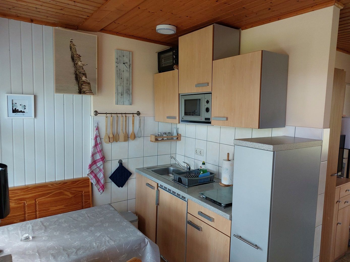 gut eingerichtete Pantryküche mit 2 Herdplatten, Wasserkocher, Geschirr, Besteck, Gläser, Mikrowelle, Kaffeemaschine, Toaster, Kühlschrank, Staubsauger, TV, Kinderreisebett und Hochstuhl