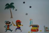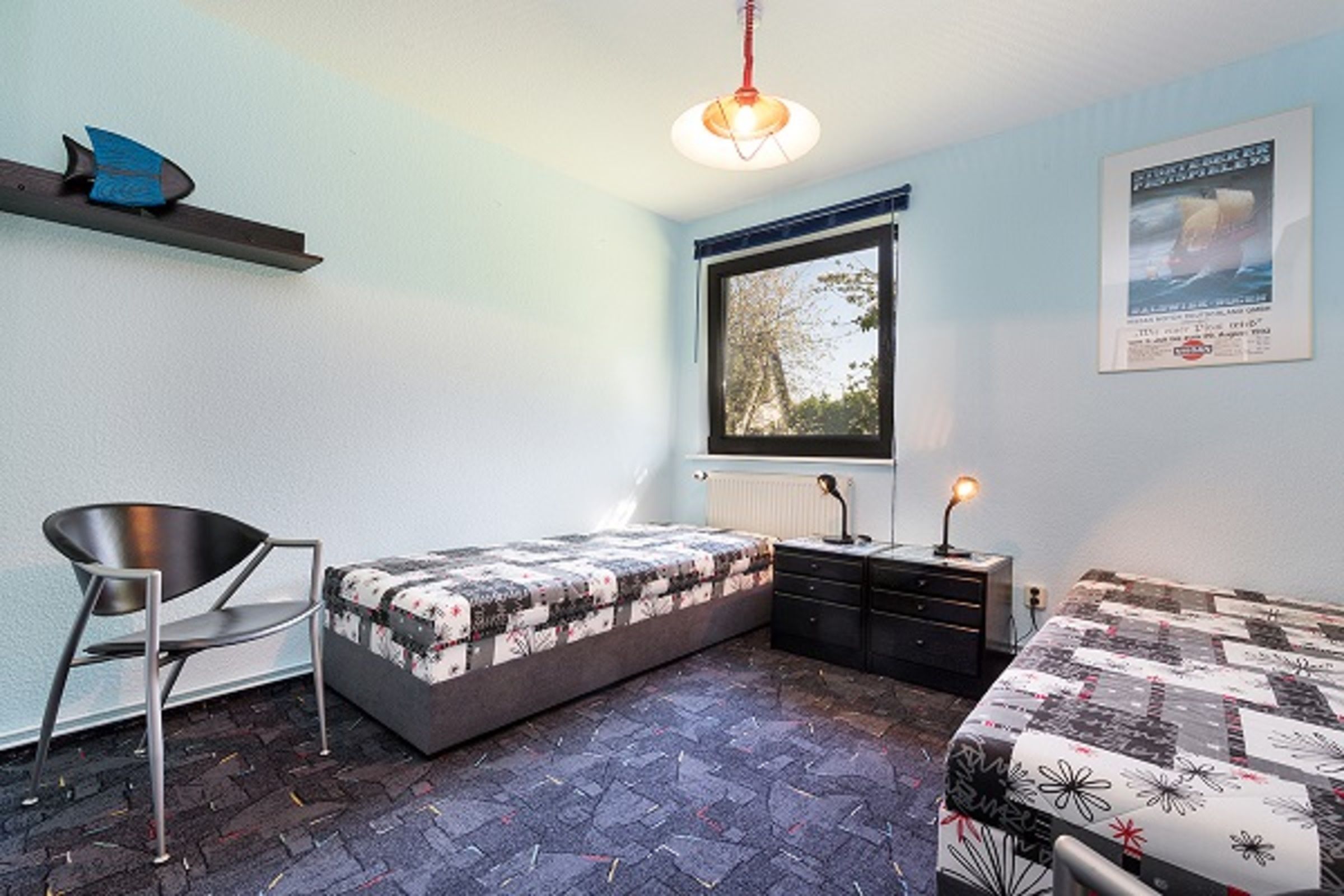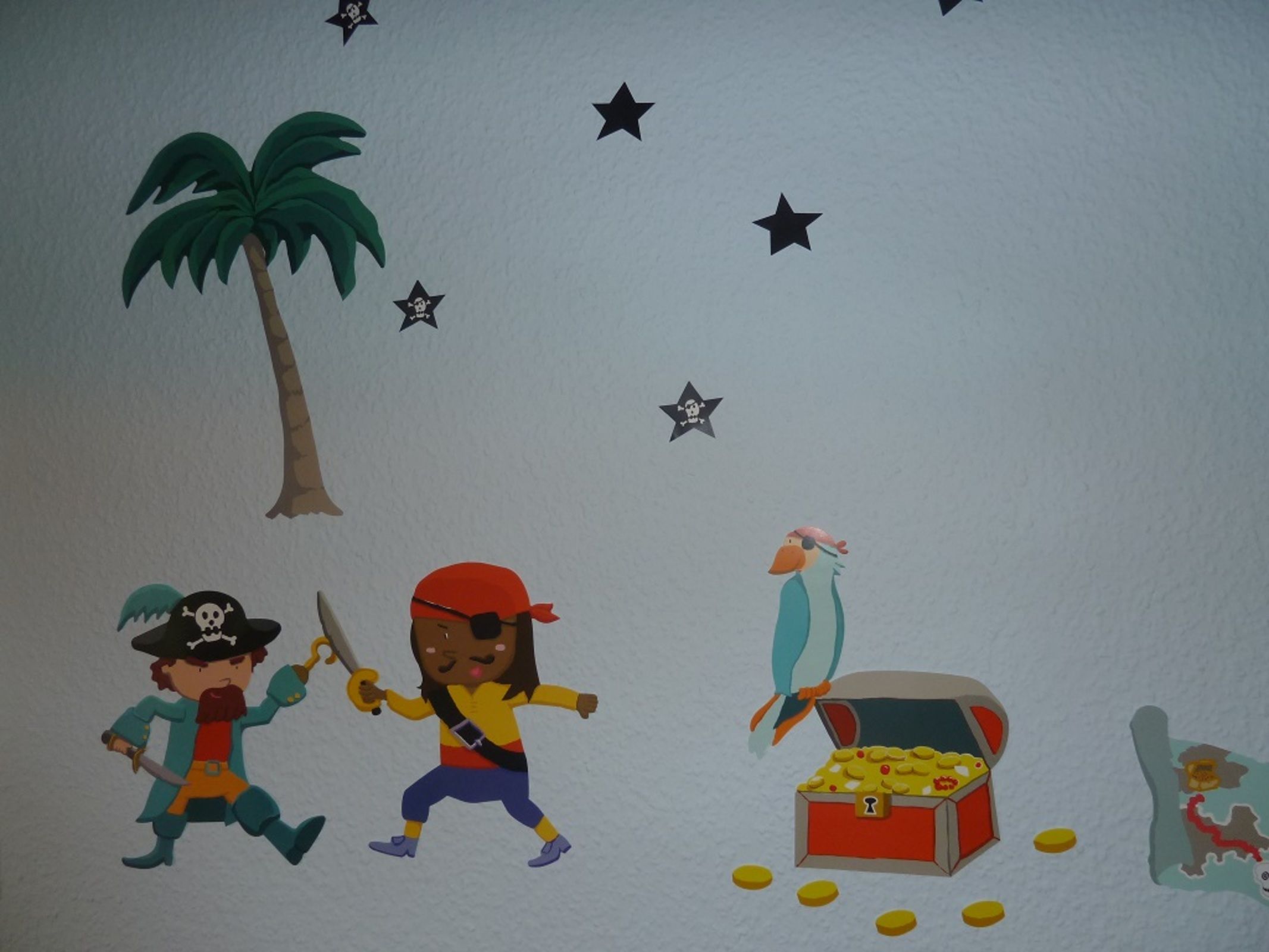 Kinderschlafzimmer mit 2 zusammenschiebbaren Schlafliegen (2,00 m x 0,80 cm Federkern), ggf. zus. Kinderbett, Schrank, Nachttische und Stühle, Piratendeko an der Wand