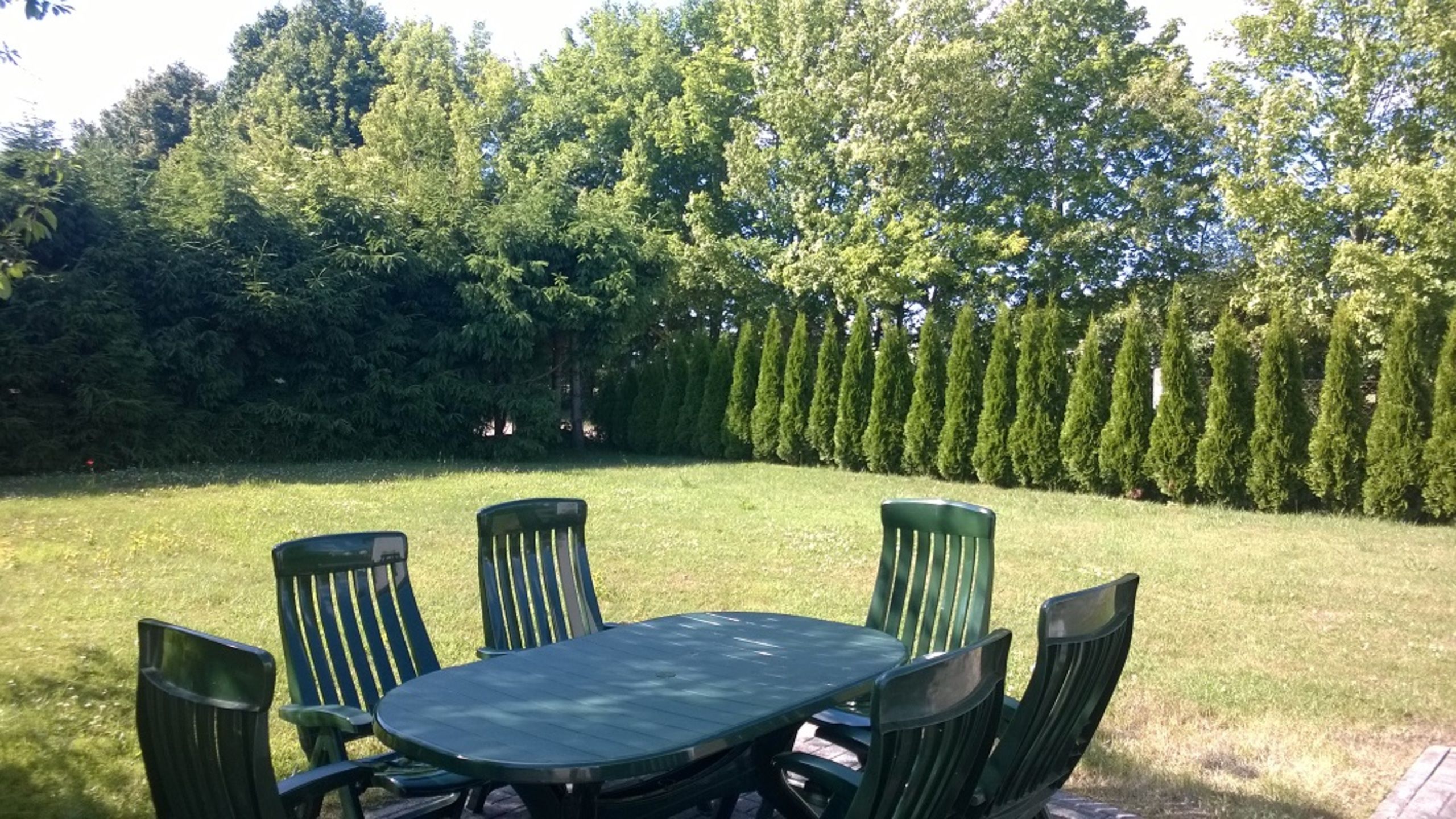 Sonnenterrasse umgeben von alten Obstäumen, Terrassenmöbel, Grill und Wärmestrahler