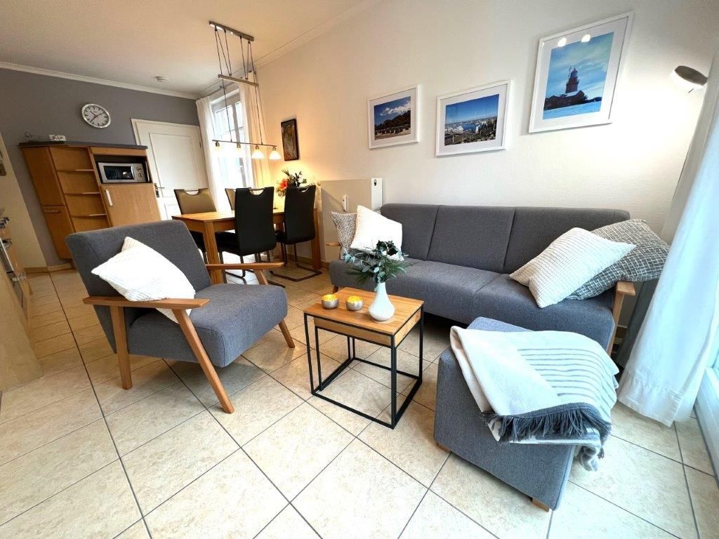 - Wohnbereich mit bequemer Couch und integrierter Küche