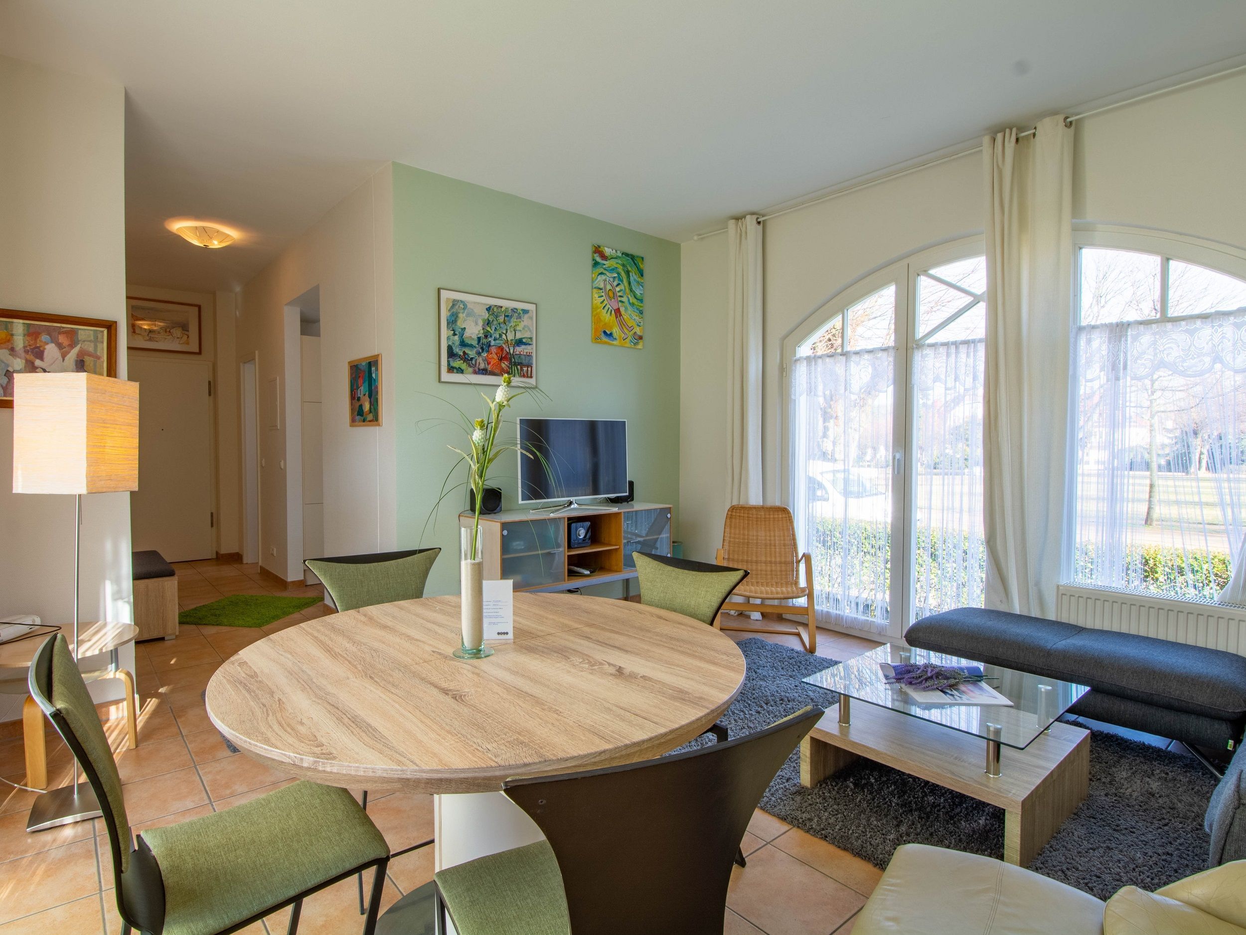 Das modern und geschmackvoll eingerichtete Wohnzimmer dieser Ferienwohnung ist ausgestattet mit bequemer Couchgarnitur, Stereoanlage und TV-Gerät sowie einem Esstisch für 4 Personen. Die angrenzende separate, offene Küche ist ausgestattet mit alle wichtigen Küchengeräten und -utensilien, die Sie im Urlaub an der Ostsee benötigen. Ein Herd mit Backofen, ein Geschirrspüler, eine Mikrowelle und ein Kühlschrank befinden sich in der Küche. Eine Kaffeemaschine, ein Wasserkocher und ein Toaster sowie genügend Koch- und Essgeschirr vervollständigen die Kücheneinrichtung.