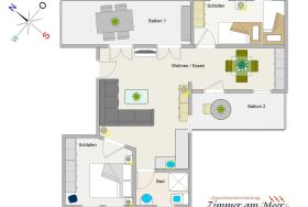 Sie erholen sich in einer wunderschönen 3-Raum-Wohnung von ca. 60 qm Größe, die sich im zweiten Obergeschoss der Villa Seeadler befindet. Der Wohnbereich ist ausgestattet mit Küchenzeile (Herd mit Backofen, Geschirrspüler, Kaffeemaschine, Mikrowelle, Wasserkocher), bequemer Sitzgruppe, Essecke und TV-Gerät. Die Wohnung verfügt über zwei Balkone, die vom Wohnbereich aus betreten werden können. Vom Balkon in Richtung Norden genießen Sie den Blick auf den Lindenpark. Der zweite Balkon zeigt in Richtung Süden und gibt den Blick auf den Stadtwald frei. Ein Schlafzimmer mit Doppelbett (160cm x 200 cm) und ein Schlafzimmer mit 2 Einzelbetten sowie das Bad mit Dusche und WC vervollständigen das Gesamtbild dieser Wohnung.