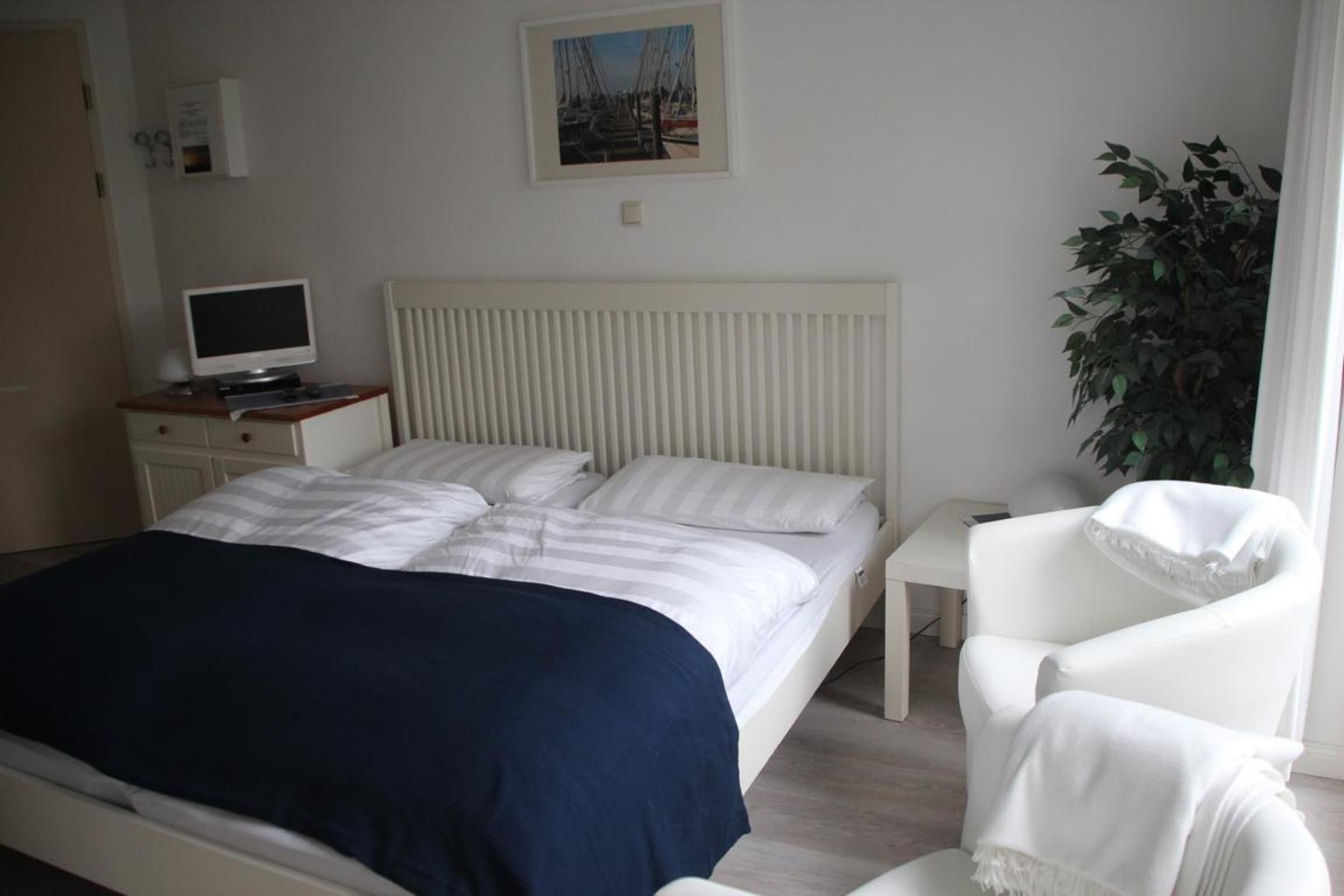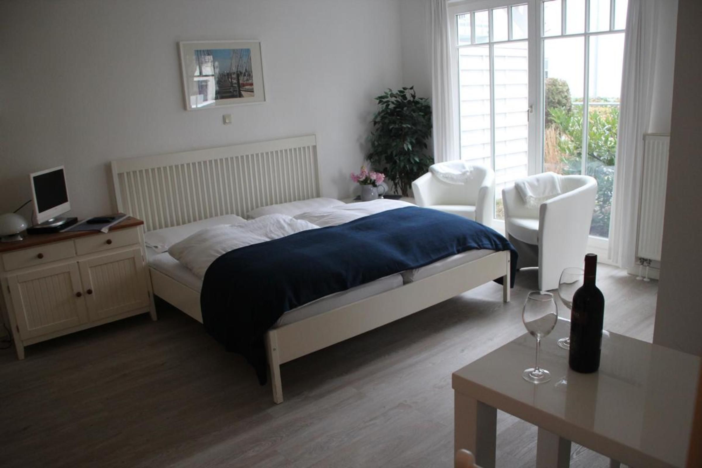 - Wohn/Schlafbereich mit Doppelbett, Kleiderschrank, TV und integrierter Küchenzeile