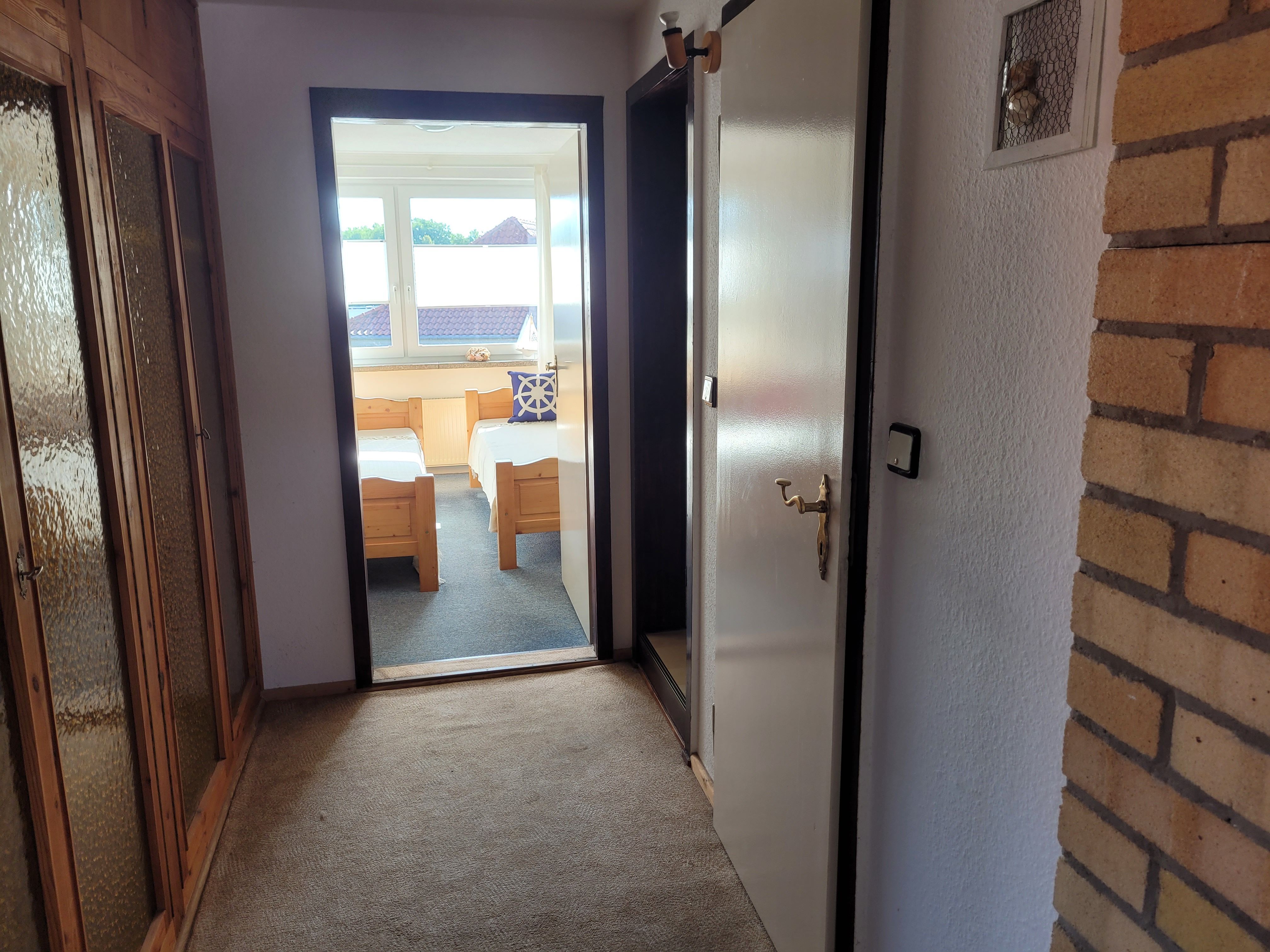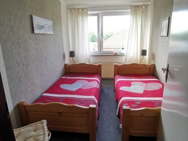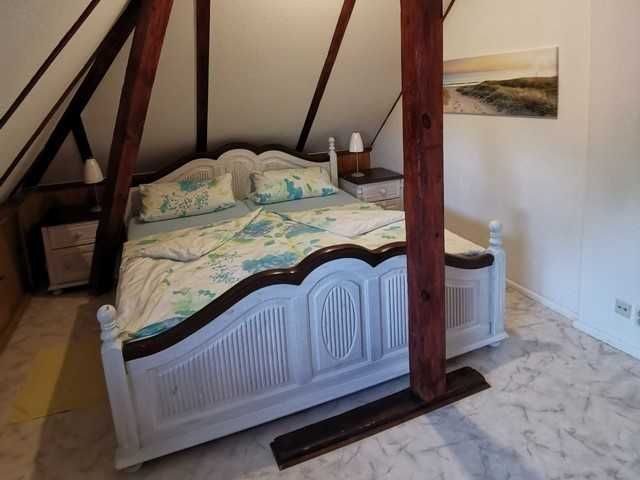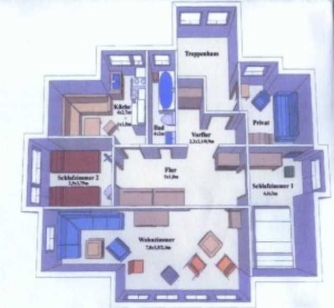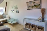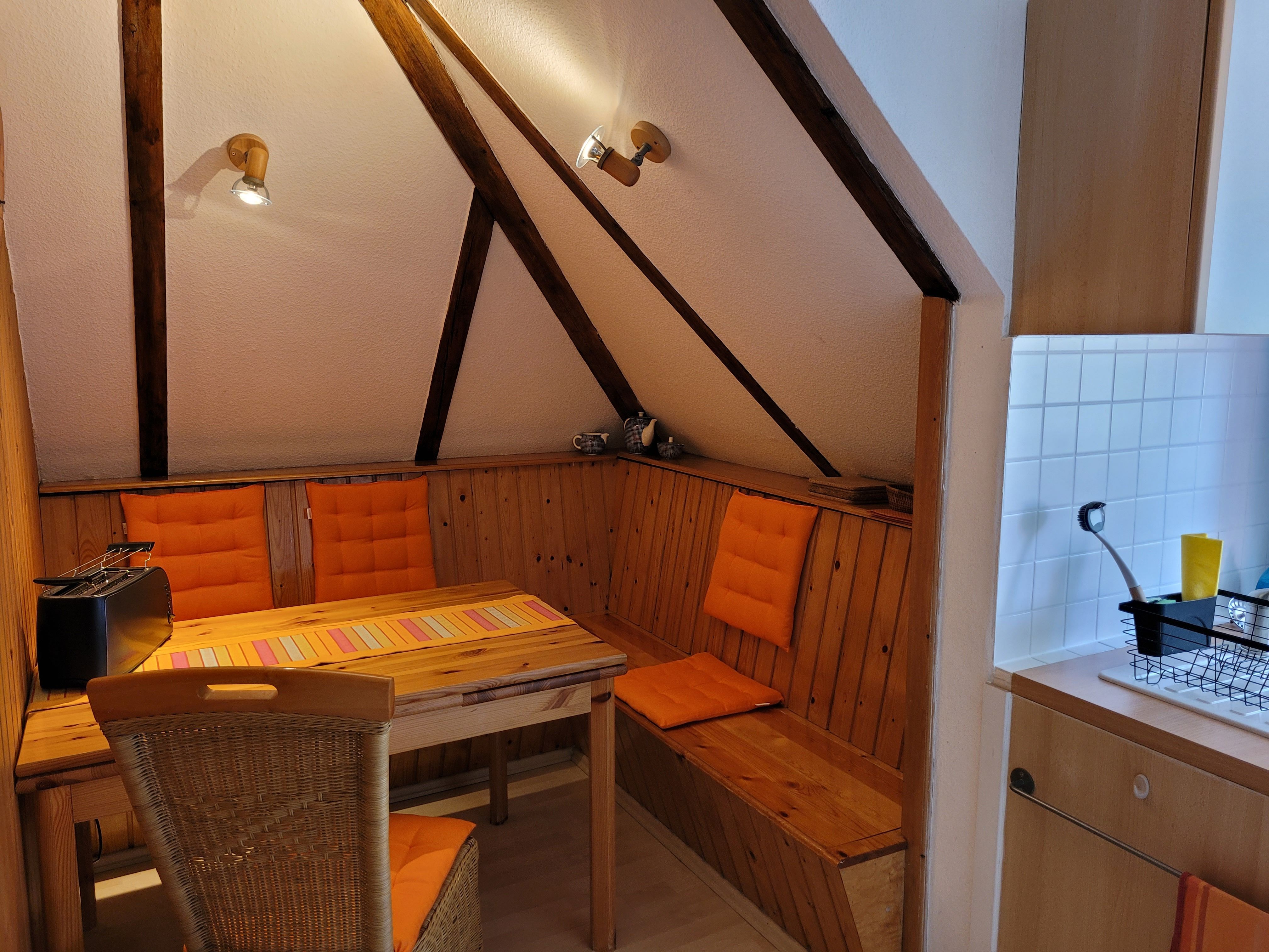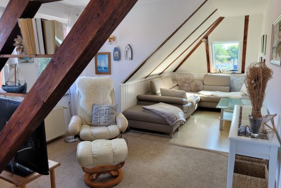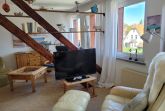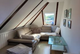 Unsere Ferienwohnung ist 56 qm groß, befindet sich im Dachgeschoß einer Stadtvilla und ist über die Treppe im Hausflur erreichbar. Sie besticht durch das tlw. sichtbare Gebälk und verfügt über ein Wohnzimmer mit Couch sowie separater Sitzgelegenheit, ein Schlafzimmer mit Doppelbett (180x200 mit getrennten Matratzen), ein Schlafzimmer mit zwei Einzelbetten, eine gut ausgestattete Küche mit gemütlicher Sitzecke, einen großen Flur mit zwei Einbauschränken und ein Bad mit Badewanne und Duschabtrennung.