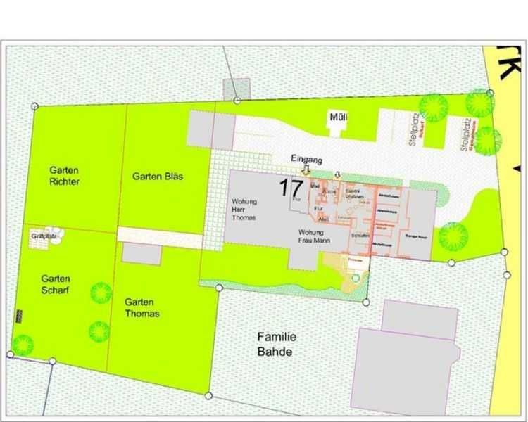 • der Garten vor der Wohnung ist an der Grundstücksgrenze mit dichten Sträuchern und Büschen abgegrenzt