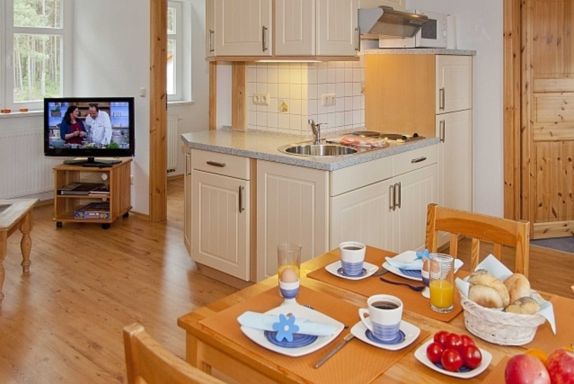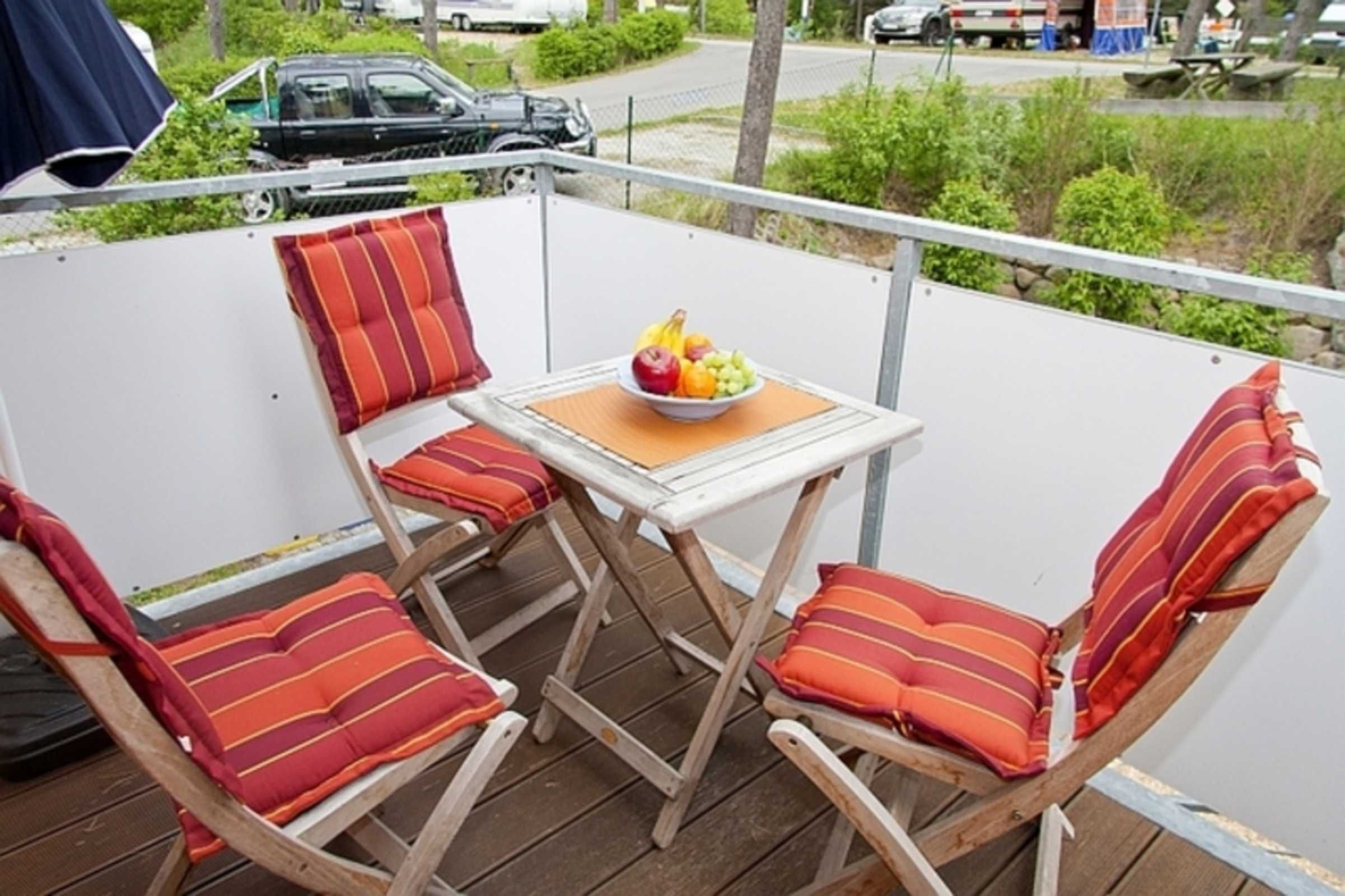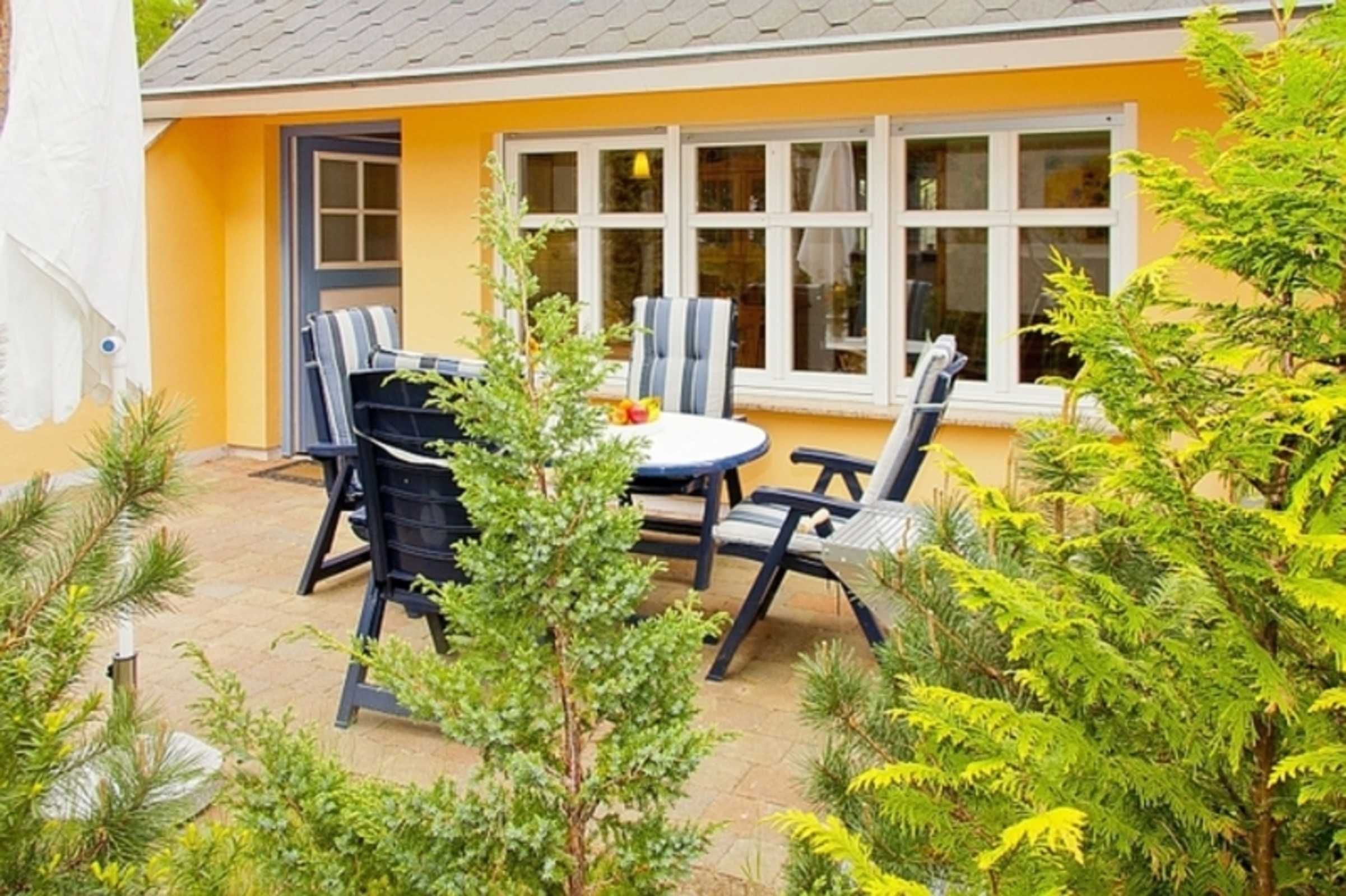 Das Wohnzimmer ist mit Doppelbettcouch,Radio/TV,Couchtisch,Rattansessel u. Essecke ausgestattet,das Schlafzimmer mit Doppelbett. Zur Küche gehören u.a.Herd u. Mikrowelle, Kühlschrank mit Gefrierfach, Geschirr. Zum Bad gehört Dusche,WC u.Waschtisch, Fön.Zur Fewo gehören Terrasse,Holzkohlegrill,Parkplatz