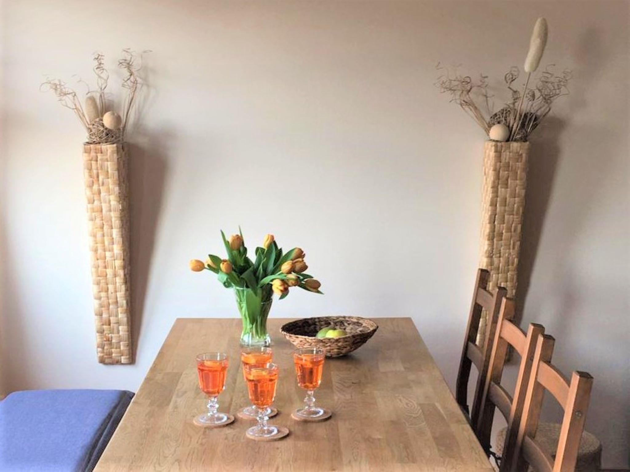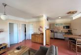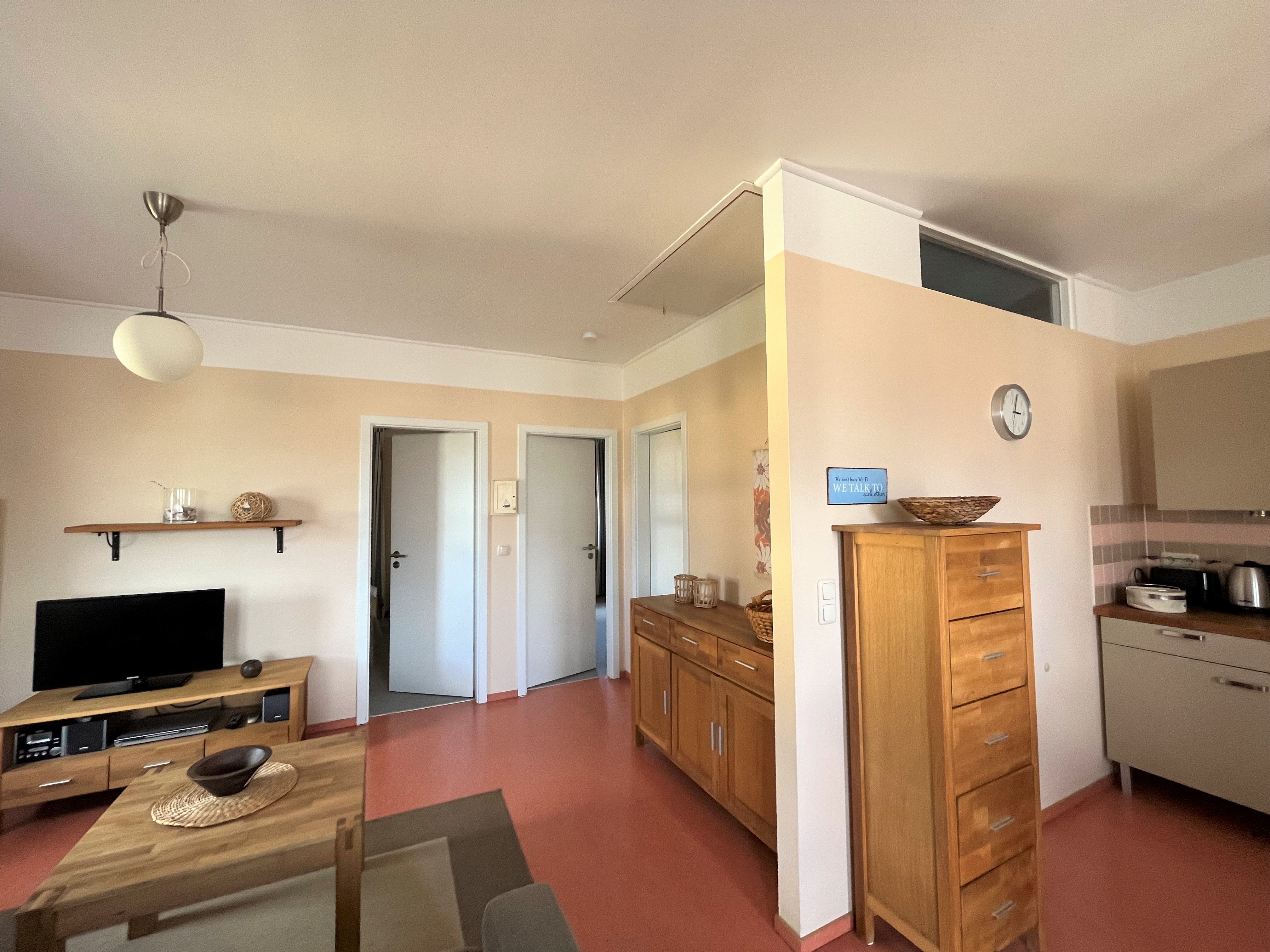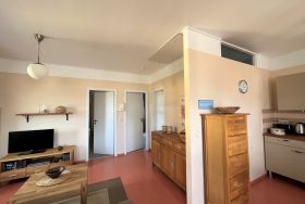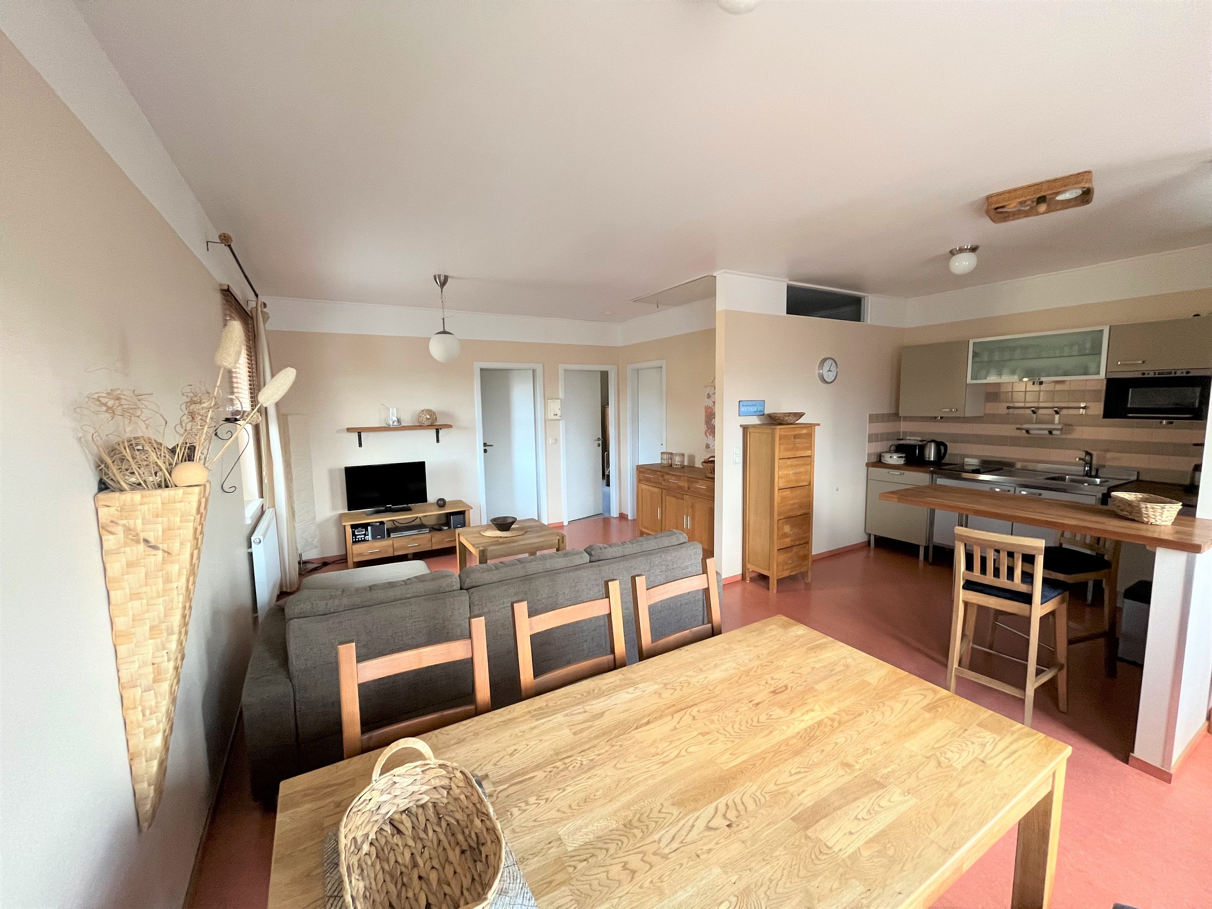 Die Wohnung, mit einer Fläche von 60 qm, verfügt über einen Wohnraum mit offenem Küchen- und Essbereich. Die Küche ist komplett mit Geschirrspüler, Kühlschrank mit Gefrierfach, Mikrowelle, Toaster etc. ausgestattet. Die beiden Schlafzimmer (1x Doppelbett und 1x 2 Einzelbetten) bieten Platz für 4 Personen. Das Bad ist mit Dusche/WC, Kosmetikspiegel und Fön ausgestattet.