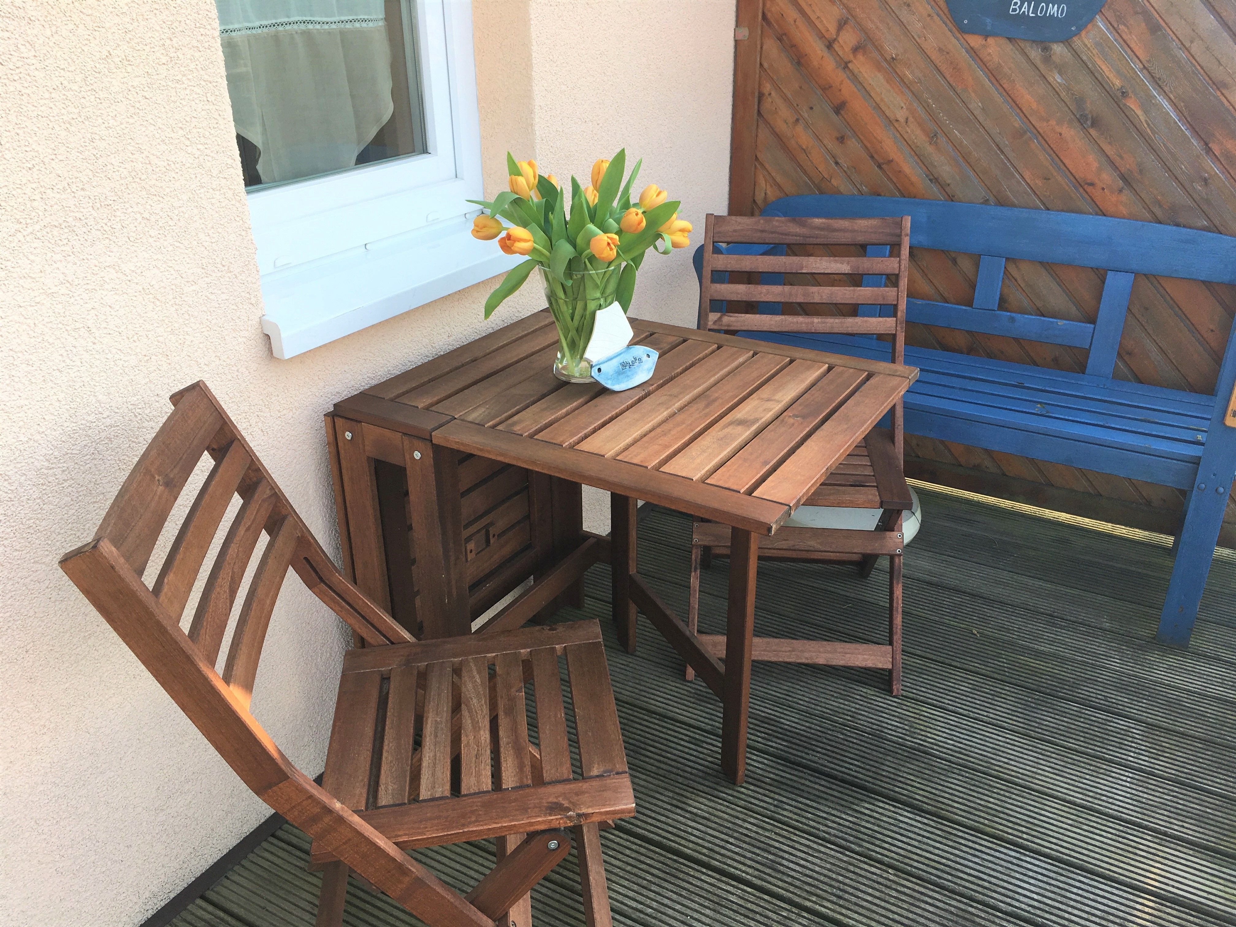 Der Balkon ist mit Sitzmöbeln ausgestattet.