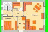 Im geräumigen Wohnzimmer steht eine gemutliche Doppel-Couch, ausserdem ist im Wohnzimmer eine vollausgestattetet Küche sowie ein Esszimmertisch für vier Personen integriert.