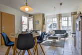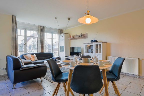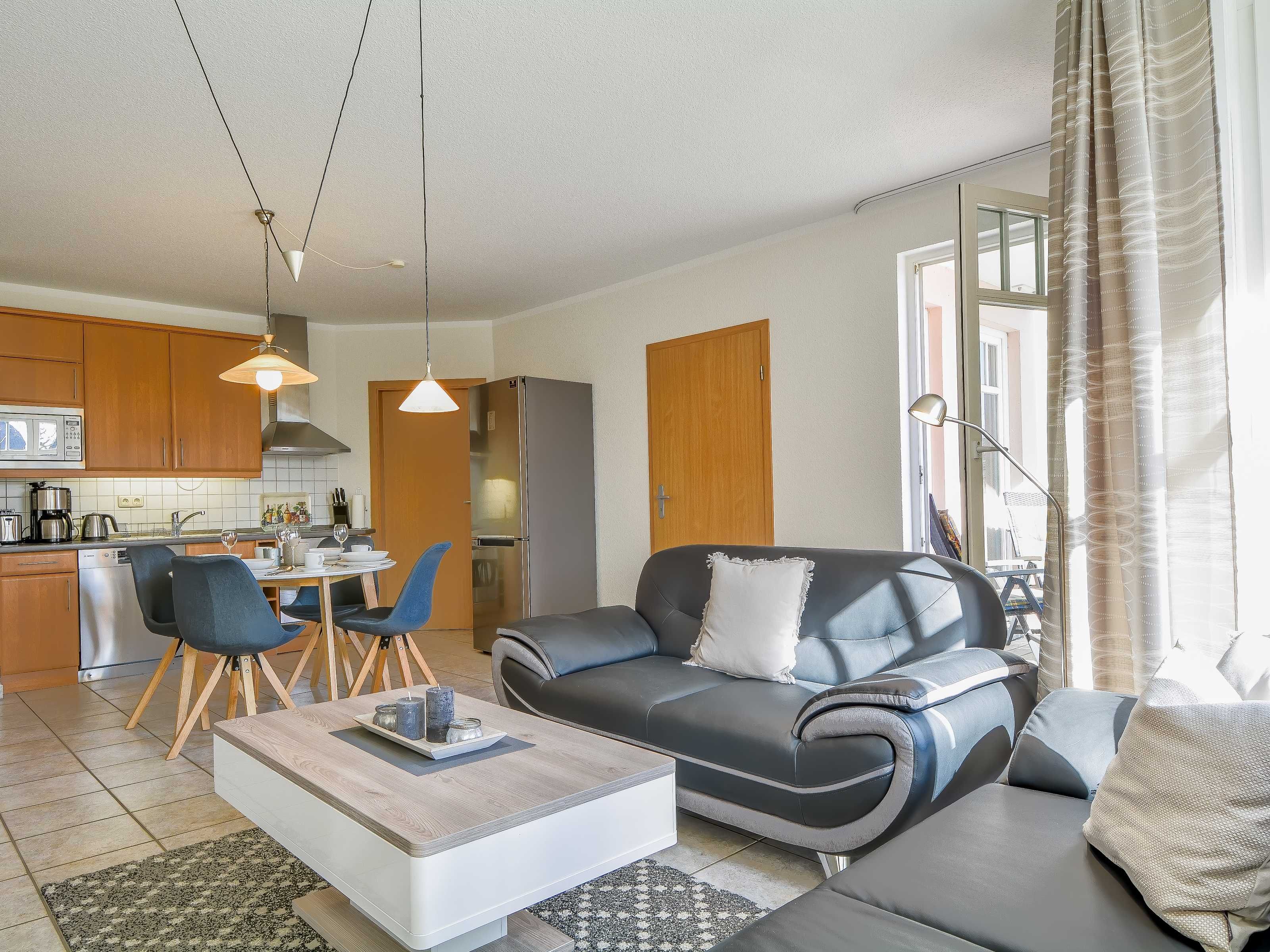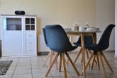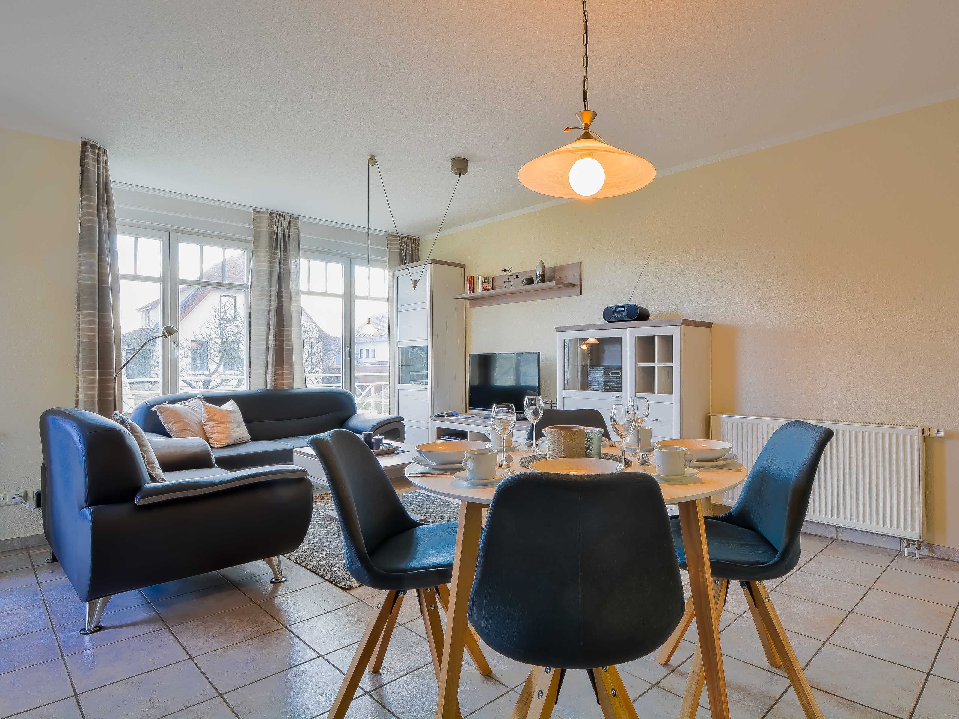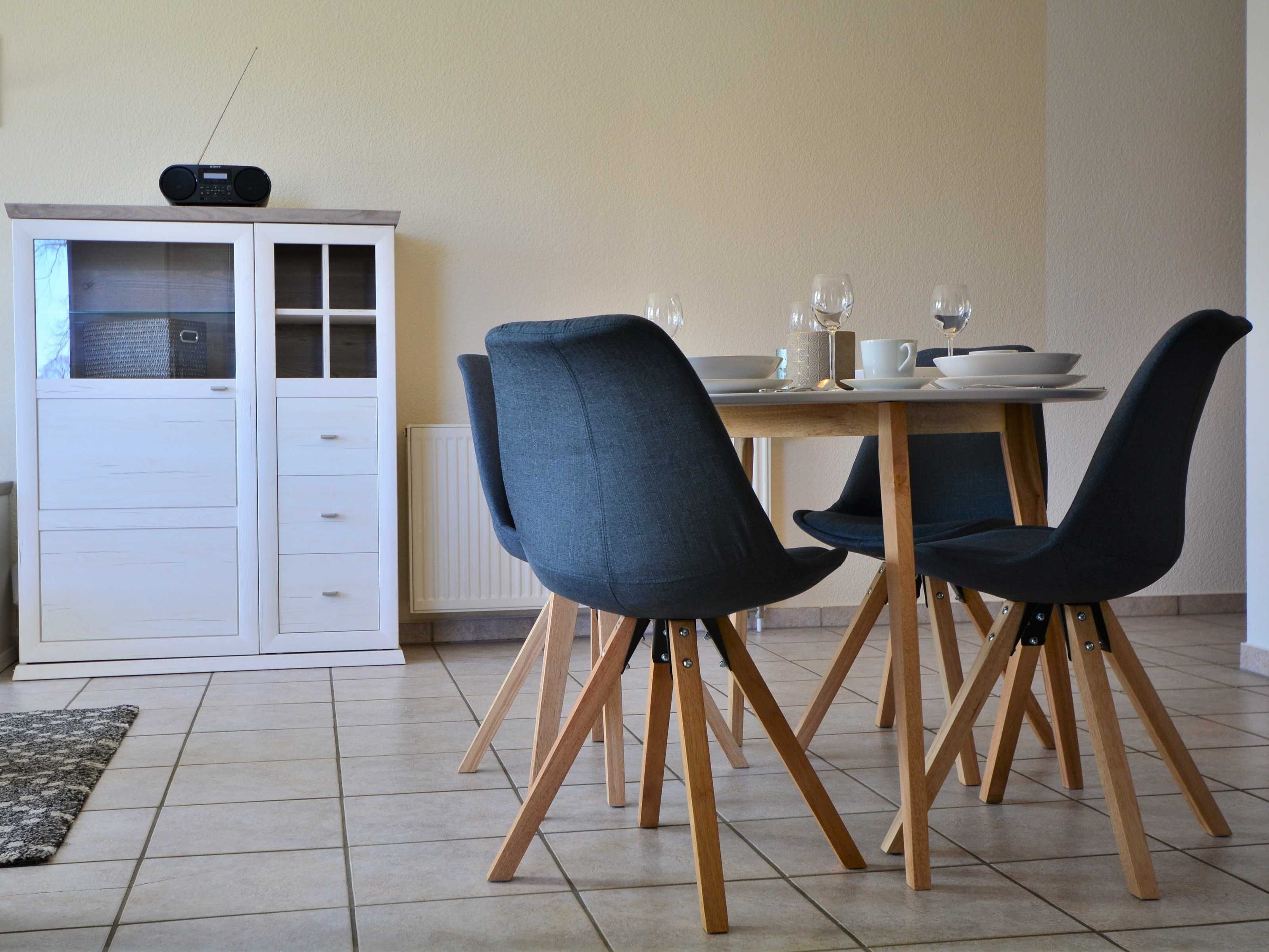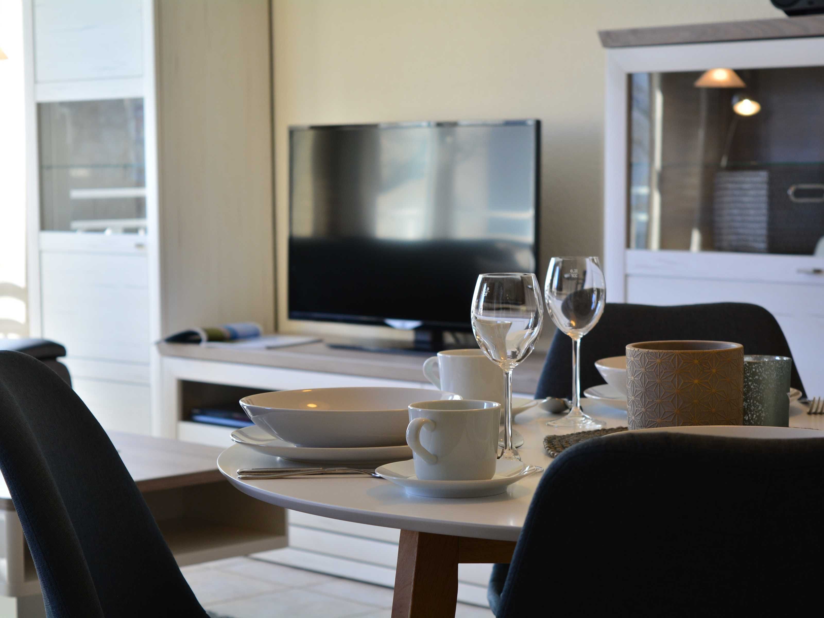 Im großzügigen Wohnraum der Ferienwohnung lädt Sie eine moderne Ledercouchgarnitur zu geselligen Abendstunden ein. Zu Ihrer Unterhaltung stehen Ihnen ein 39-Zoll-Flatscreen-TV, DVD-Player und eine Stereoanlage zur Verfügung. Der Essbereich ist im lichtdurchfluteten Wohnbereich integriert und bietet Ihnen viel Platz für Ihre Mahlzeiten.