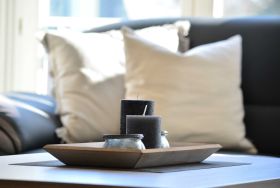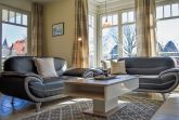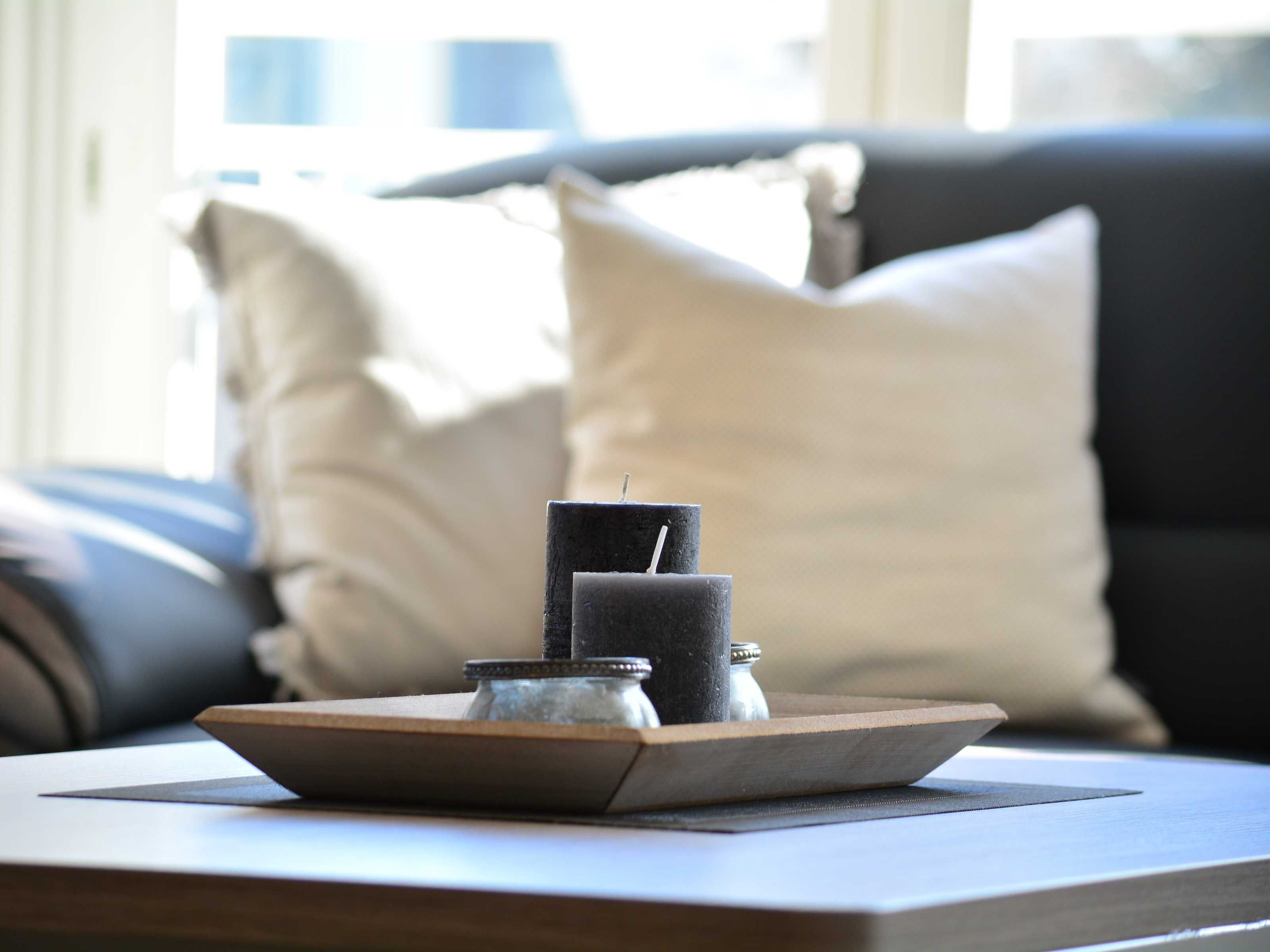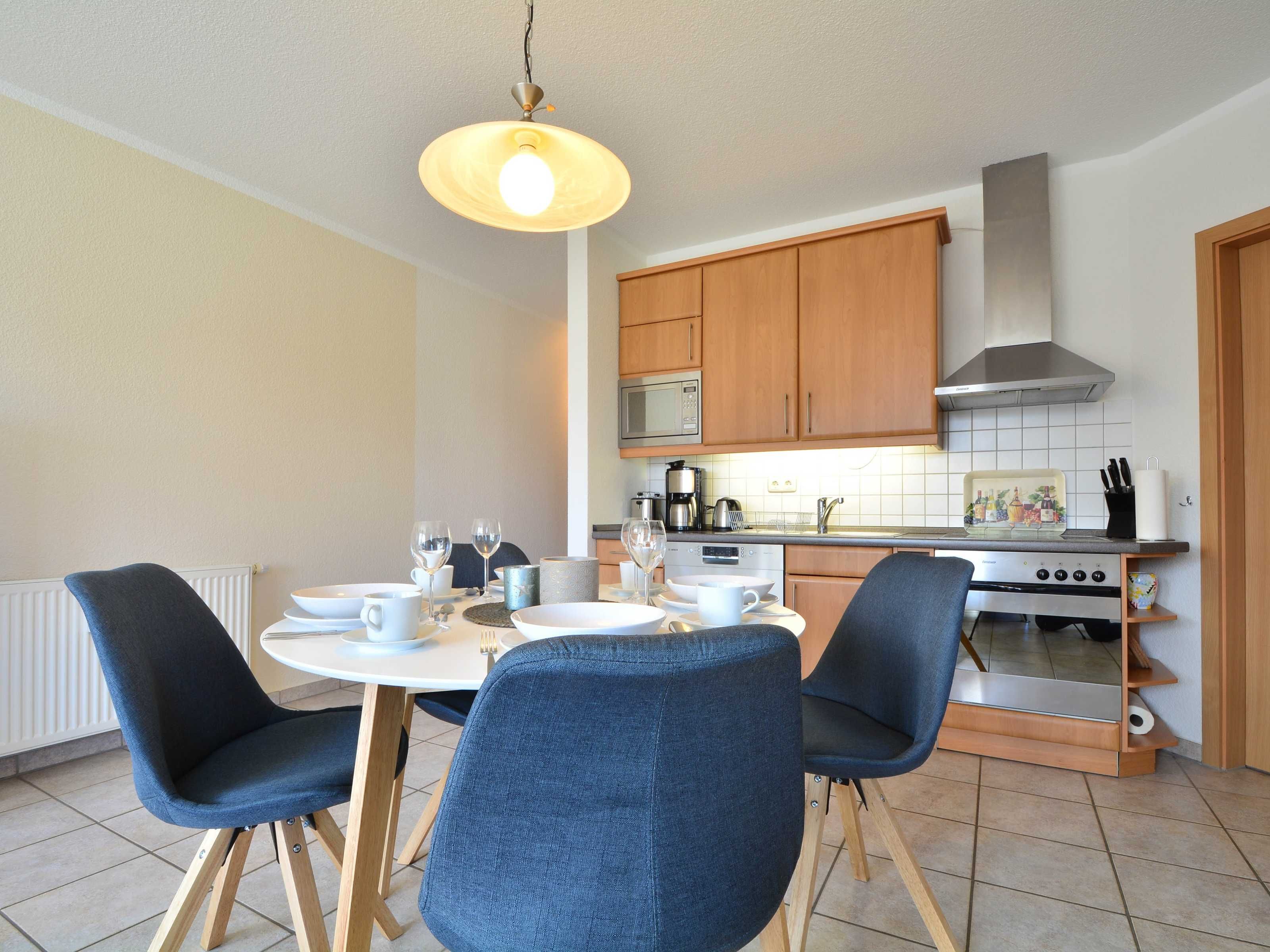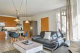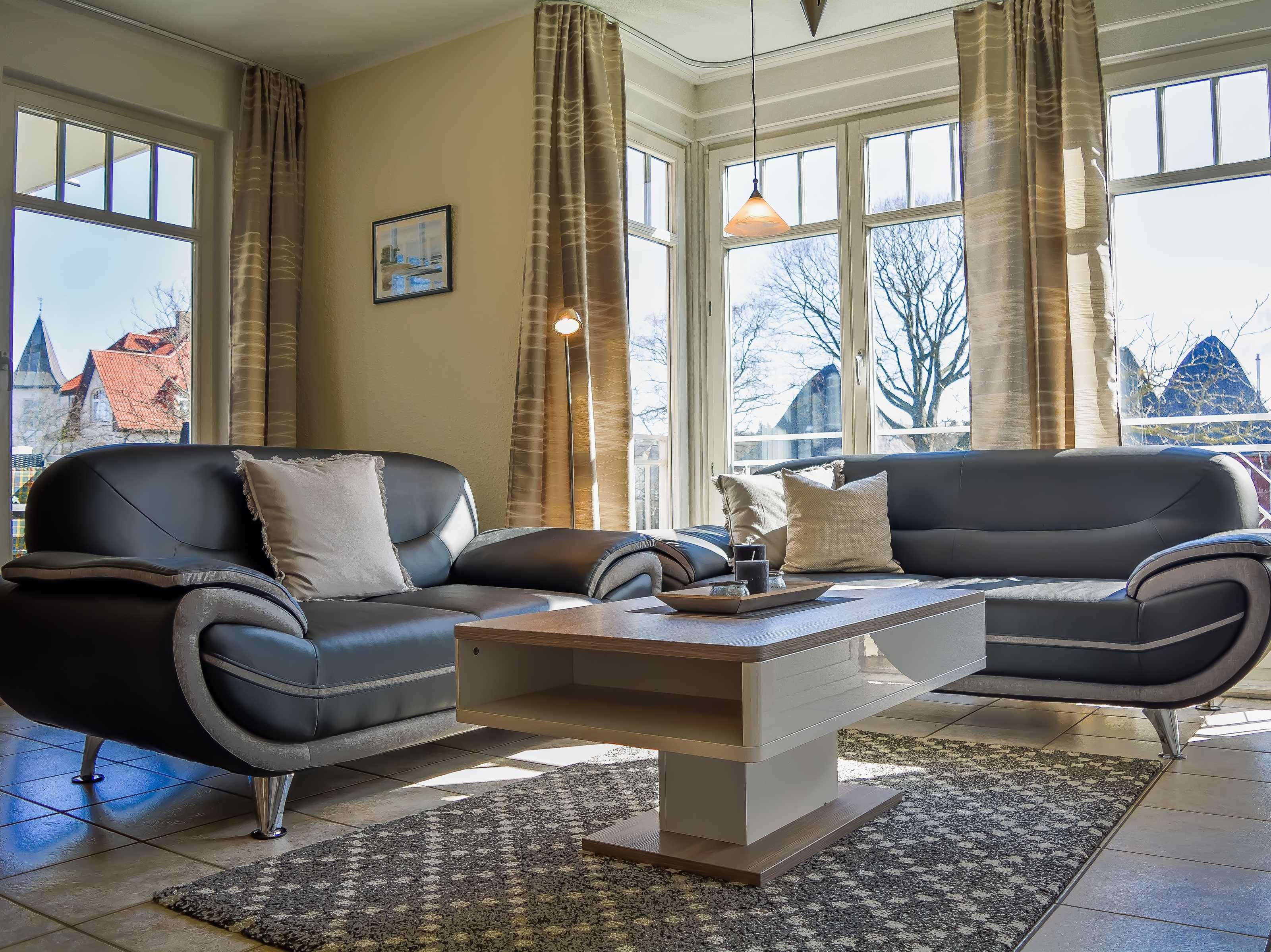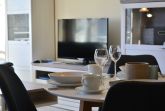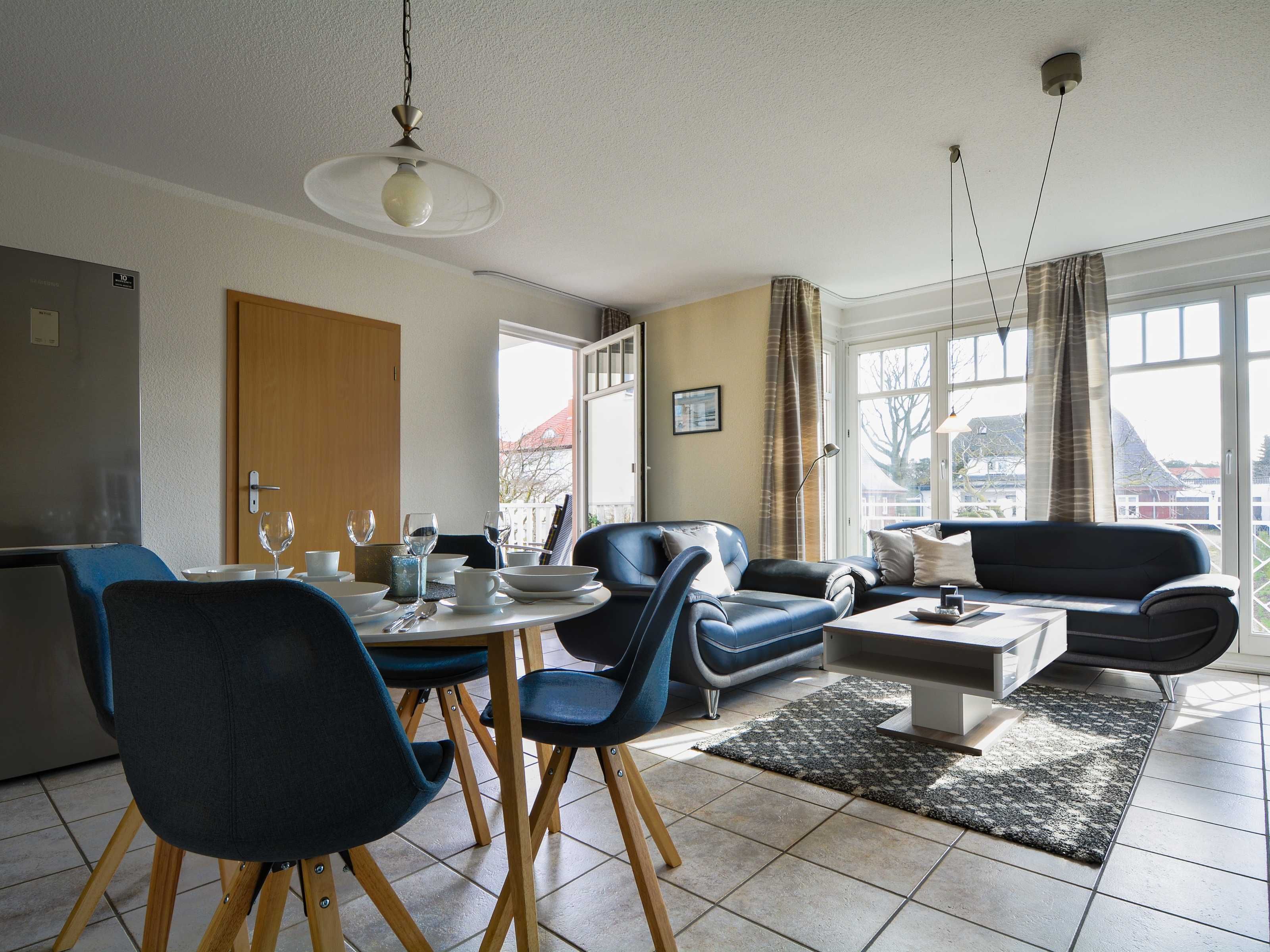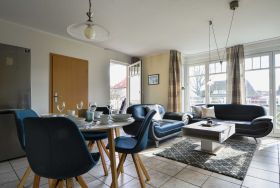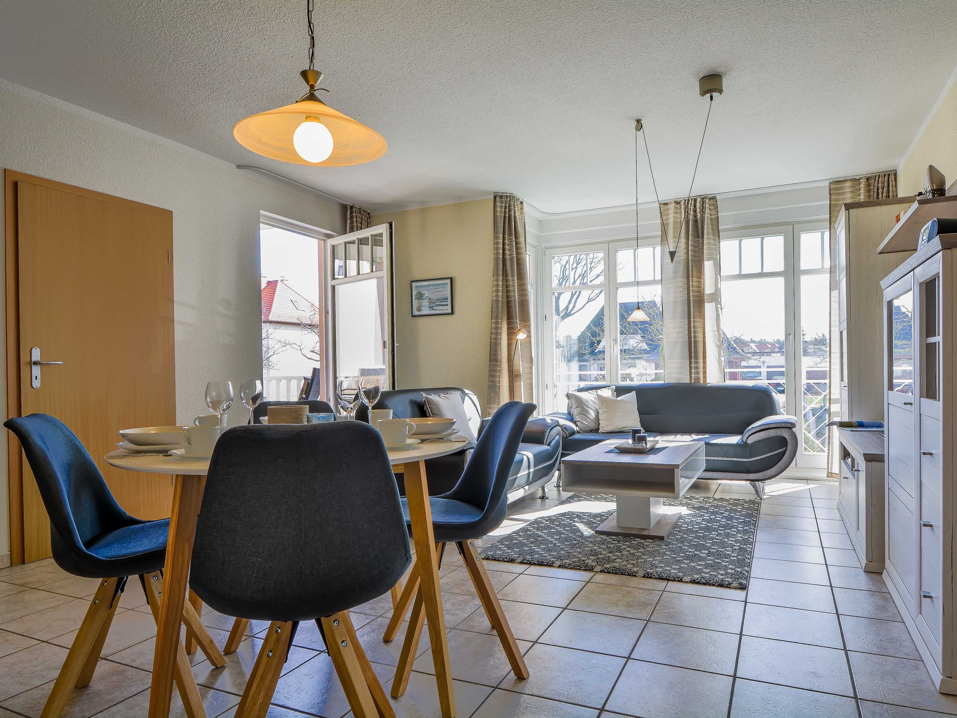 Im großzügigen Wohnraum der Ferienwohnung lädt Sie eine moderne Ledercouchgarnitur zu geselligen Abendstunden ein. Zu Ihrer Unterhaltung stehen Ihnen ein 39-Zoll-Flatscreen-TV, DVD-Player und eine Stereoanlage zur Verfügung. Der Essbereich ist im lichtdurchfluteten Wohnbereich integriert und bietet Ihnen viel Platz für Ihre Mahlzeiten.