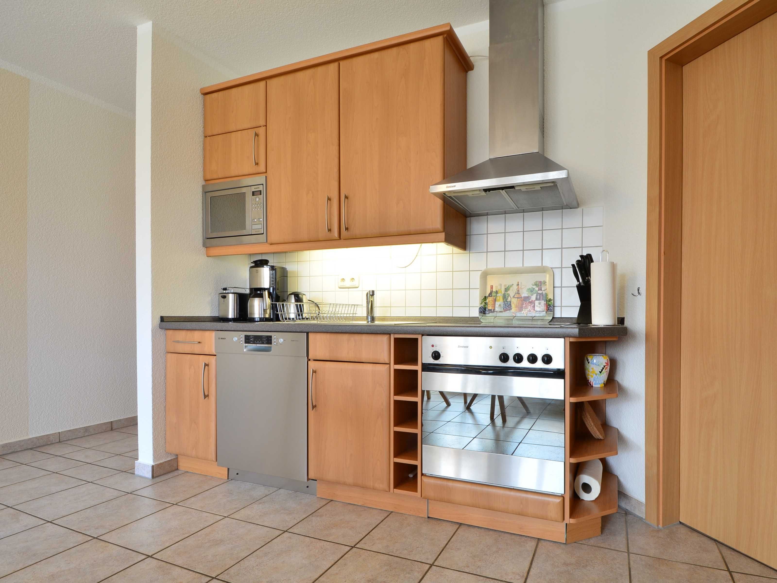 Die integrierte offene Küchenzeile hält für Sie alle wichtigen Küchengeräte und -utensilien bereit, die Sie für Ihr perfektes Dinner benötigen: Ein 4-Zonen-Cerankochfeld mit Dunstabzug und Backofen, eine Mikrowelle, ein Geschirrspüler sowie ein Kühlschrank mit Gefrierfach befinden sich in der Küche. Eine Kaffeemaschine, ein Wasserkocher und ein Toaster sowie genügend Koch- und Essgeschirr vervollständigen die Kücheneinrichtung.