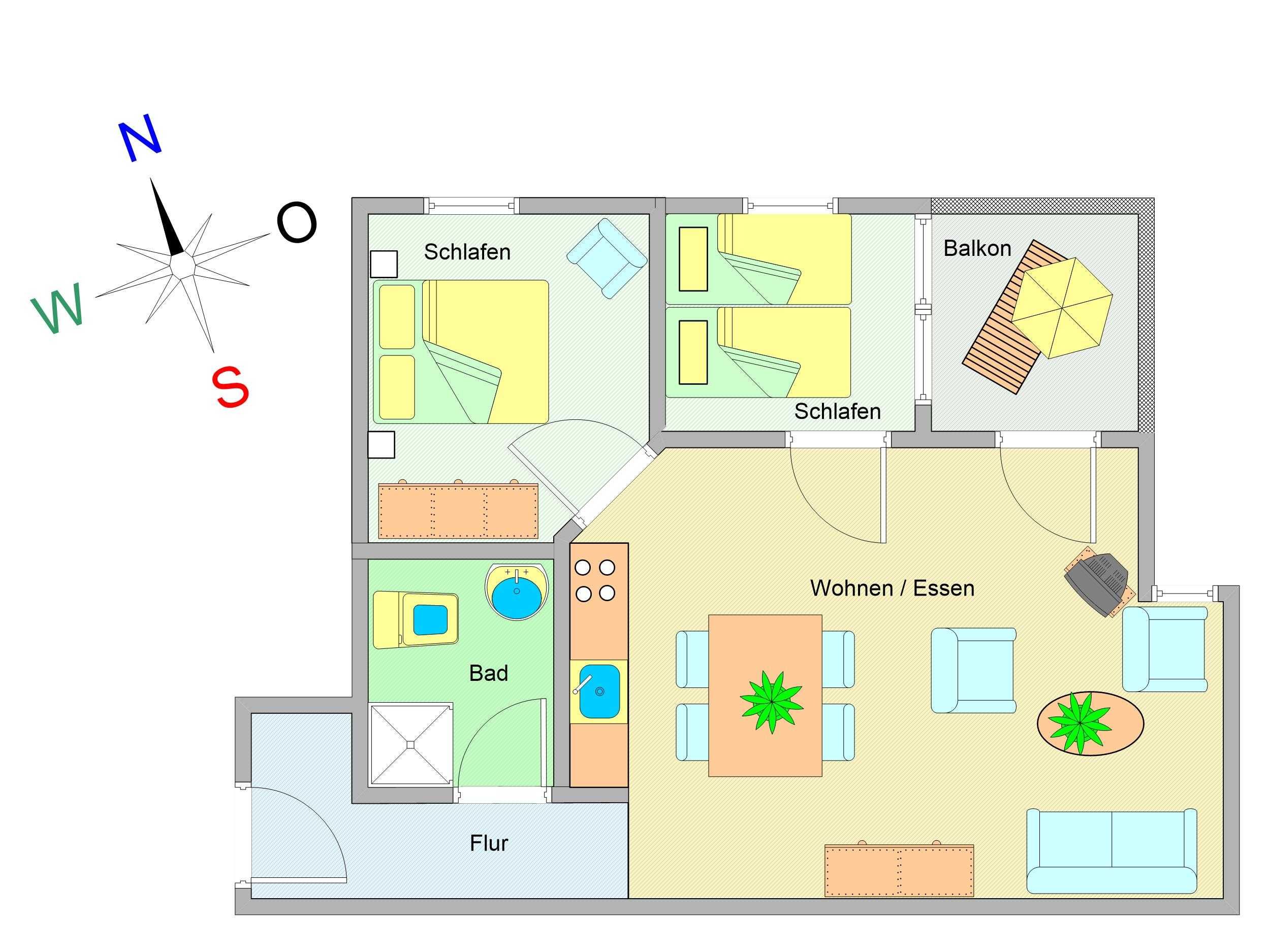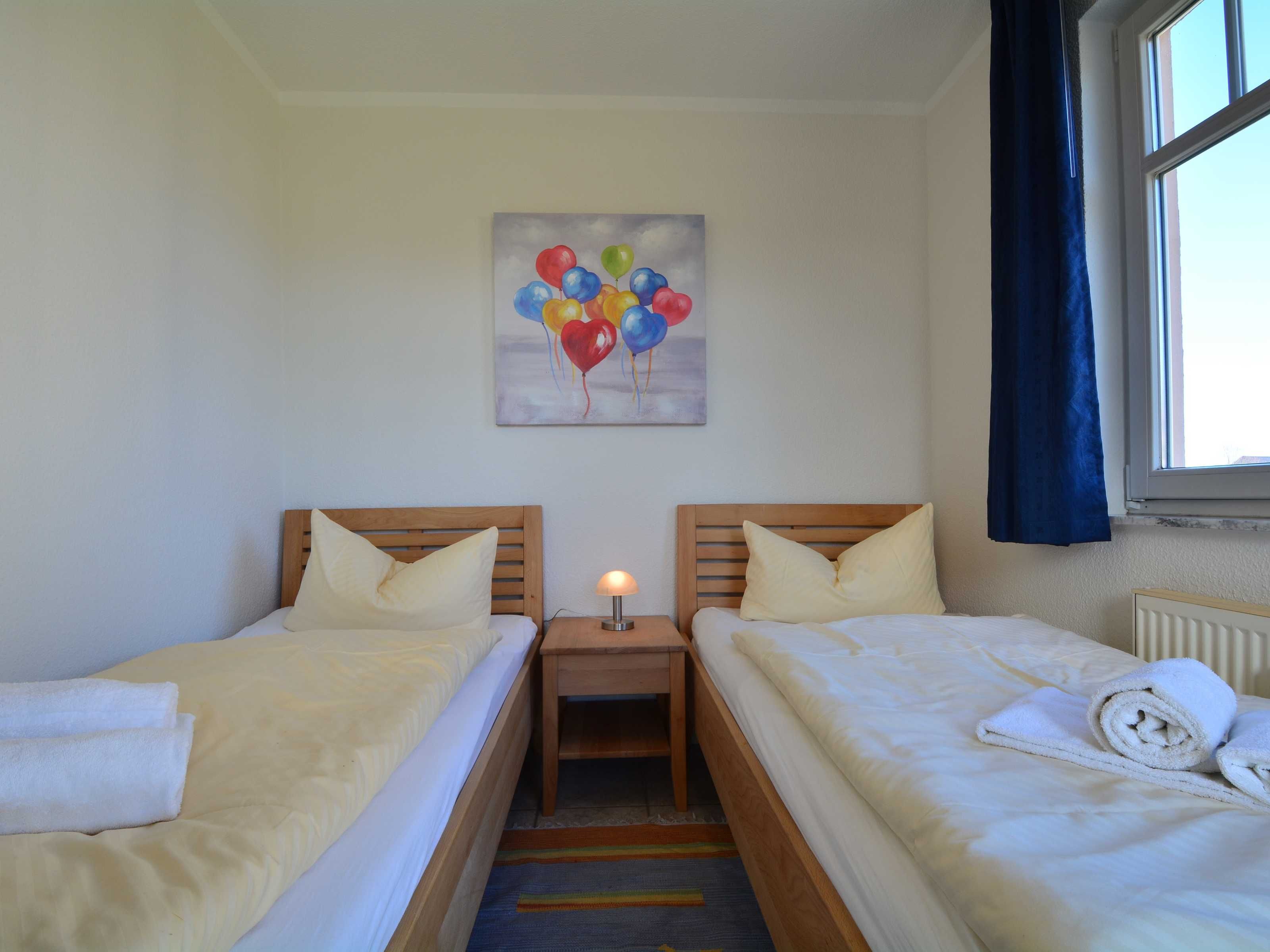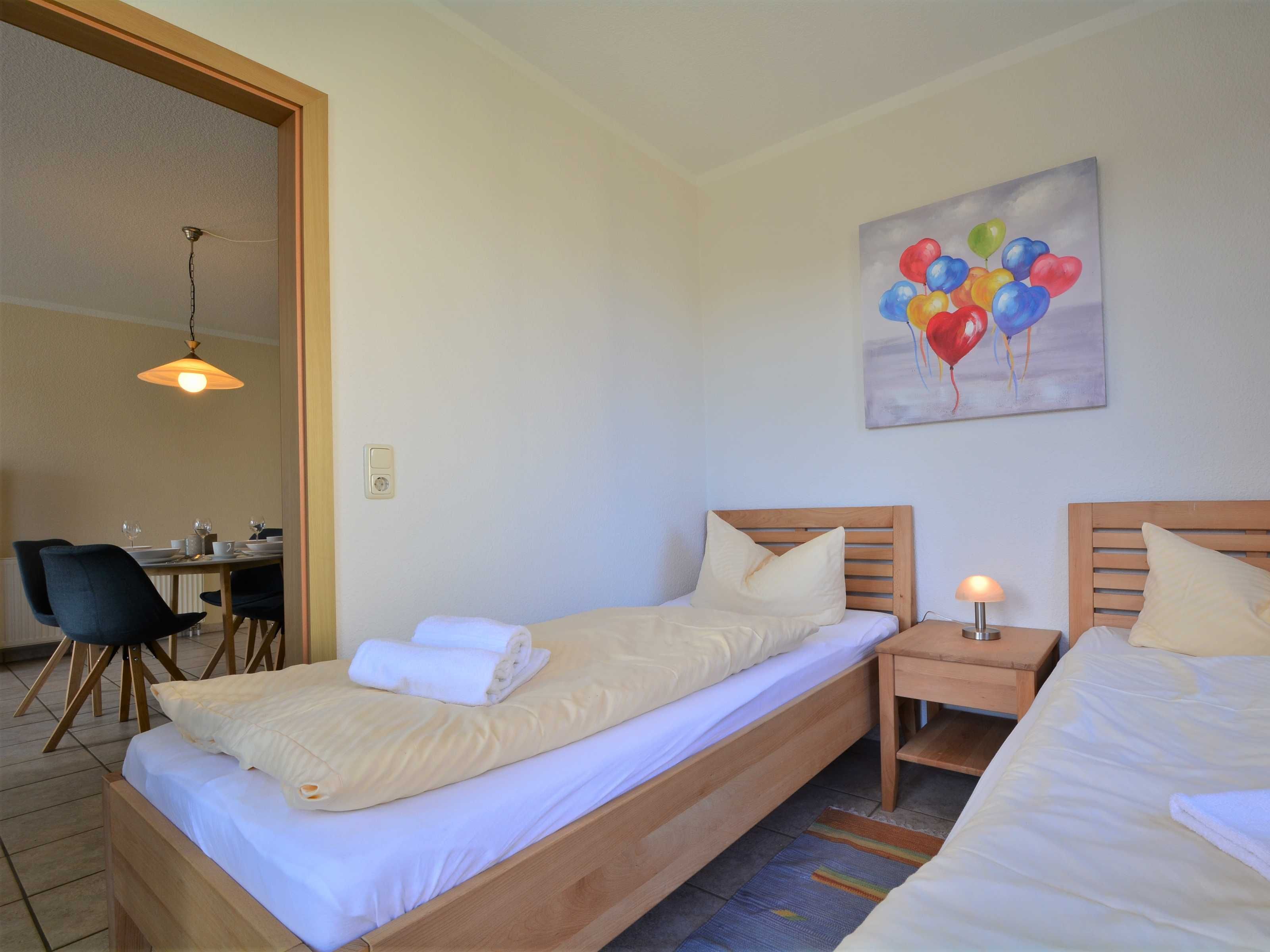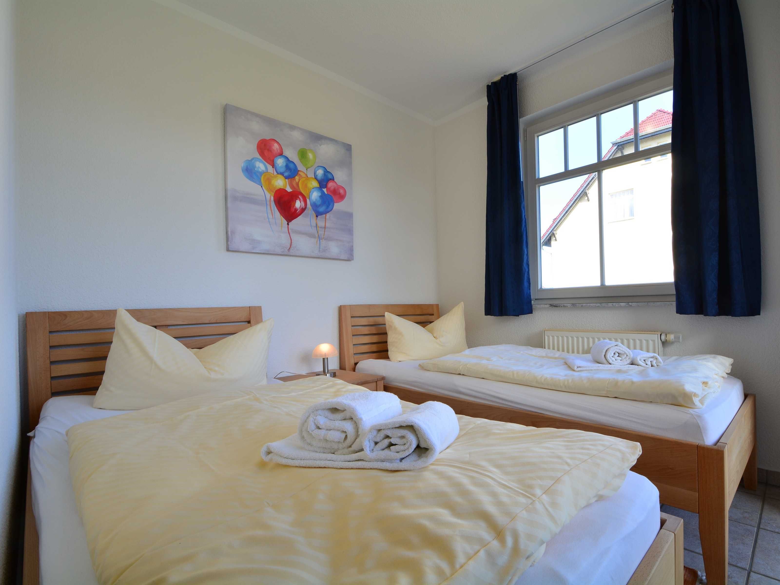 Im ersten Schlafzimmer lädt Sie ein komfortables Doppelbett (2 x 80cm x 200 cm) zur Nachtruhe ein. Der großzügige Kleiderschrank mit Ganzkörperspiegel bietet genügend Platz für Ihre Urlaubsgarderobe. Das zweite Schlafzimmer ist für Sie mit zwei Einzelbetten (jeweils 90cm x 200cm) versehen und bietet ebenfalls einen Zugang zum Balkon. Das Bad mit Dusche und WC vervollständigt das Gesamtbild dieser Wohnung.