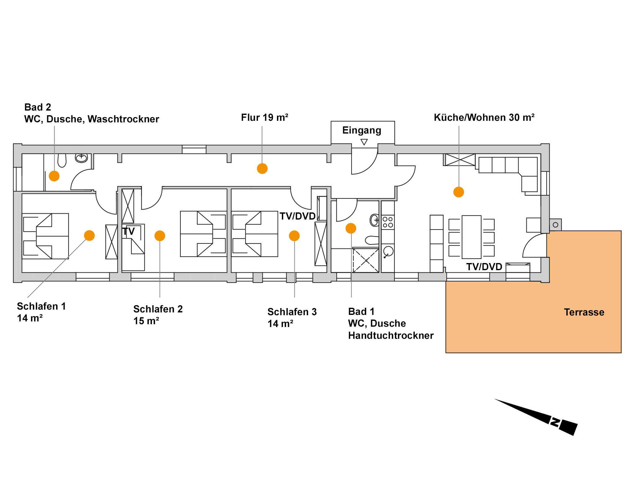 Auf über 100 qm barrierefreier Wohnfläche befinden sich 3 helle Schlafzimmer jeweils mit Doppelbett (1,80 m x 2,00 m) und 1x mit zusätzlichem Einzelbett, 2 Bäder und 1 Wohnzimmer mit offener Küche. Die ca.30 qm große, teilweise überdachte Süd-West-Terrasse lädt zum Grillen ein.