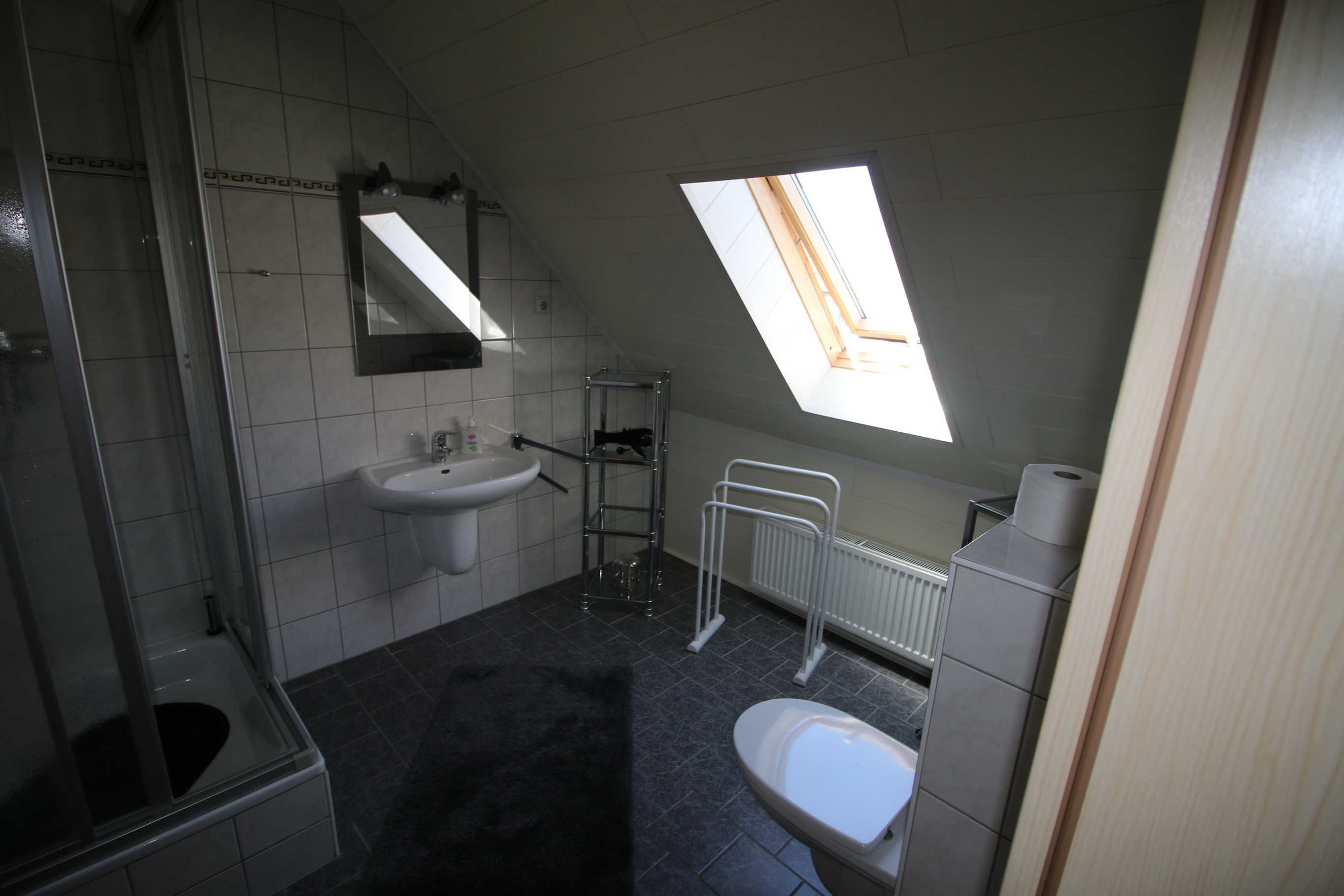 Über die Treppe gelangen Sie in das ausgebaute Dachgeschoss. Dort ist ein großes Schlafzimmer mit Doppelbett, ein weiteres Schlafzimmer mit 2 einzelnen Betten und das Badezimmer mit Dusche, Fön und WC zu finden.