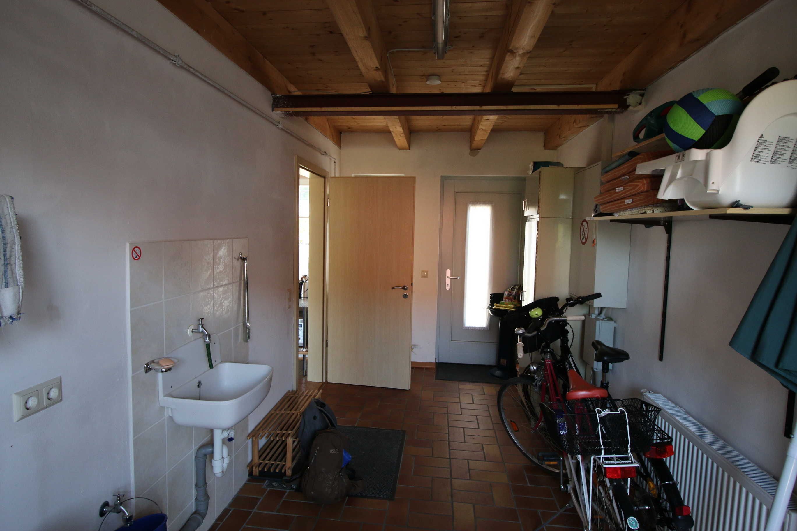 Verweilen Sie nach den Aktivitäten des Tages auf der großen Terrasse, von der aus das schöne Wohn- und Esszimmer direkt zu erreichen ist. In der kleinen Küche finden Sie alles, was man für die Zubereitung von Speisen benötigt Kühlschrank, Ceranfeld (4 Platten), Grill-Mikrowelle, Toaster, Wasserkocher, Kaffeemaschine und eine Küchenmaschine. Im Erdgeschoss befinden sich noch ein kleiner Flur, ein Gäste-WC und der Hauswirtschaftsraum mit Fahrrädern. Gern können Sie auch ein eigenes Fahrrad dort sicher unterstellen.