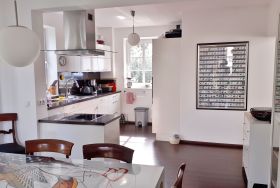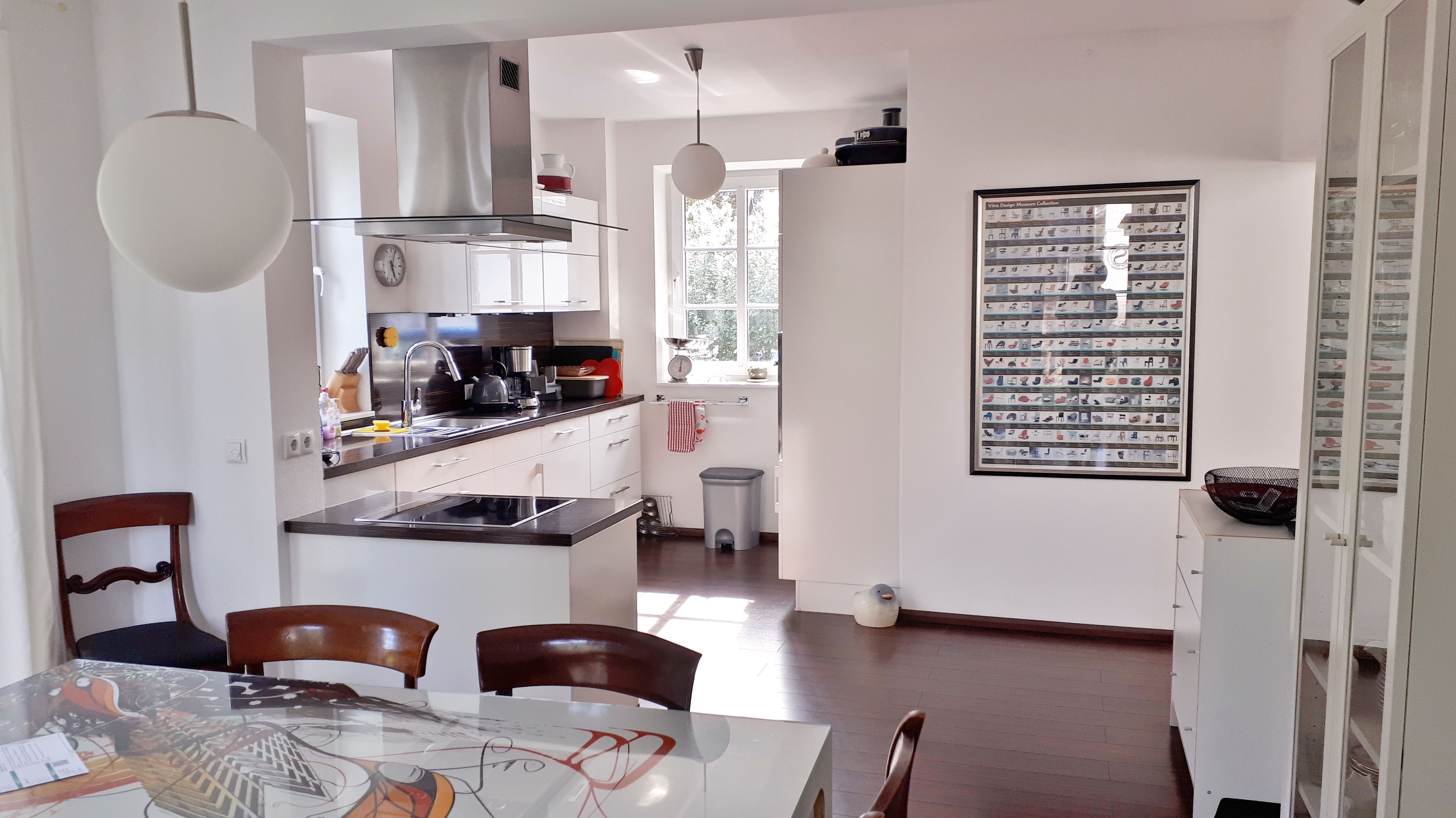 // Voll ausgestattete, moderne Küche mit Ceran-Kochfeld und Backofen, Geschirrspüler, Gefrierschrank, Mikrowelle, Dunstabzug, Kaffeemaschine, Wasserkocher, Eierkocher, Schneidemaschine und Toaster und vielen Accessoires