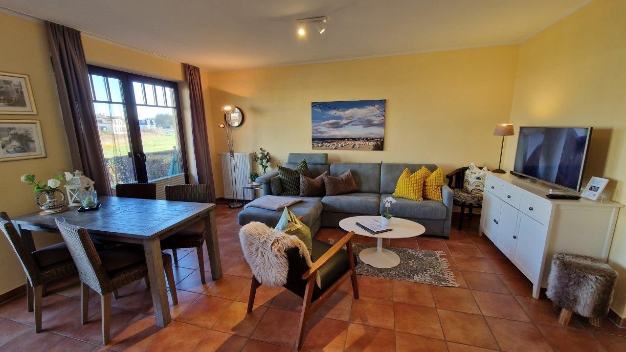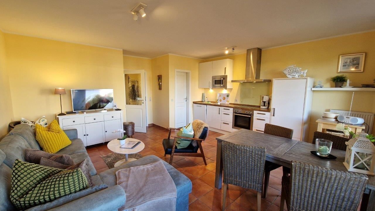 - in der Parterre/Aufzug - überdachte, möblierte Terrasse zur Meerseite - Autostellplatz Nr. 1.8 - Tiefgarage (Einfahrtshöhe 2,00 m) - Fahrradkeller - Sauna inkl., Waschmaschine u. Trockner gegen Gebühr - Nichtraucherappartement! Keine Haustiere! - WLAN-Bereitstellung kostenfrei (ohne Gewähr) - Wohn/Schlafbereich mit Schlafcouch, integrierter Küchenzeile und Essplatz - Küche - Herd mit Backofen, Mikrowelle, Kühlschrank mit Gefriermöglichkeit und Geschirrspüler - 1. Schlafzimmer mit Doppelbett und Kleiderschrank (kein Platz für ein Kinderreisebett) - DU/WC und WC separat
