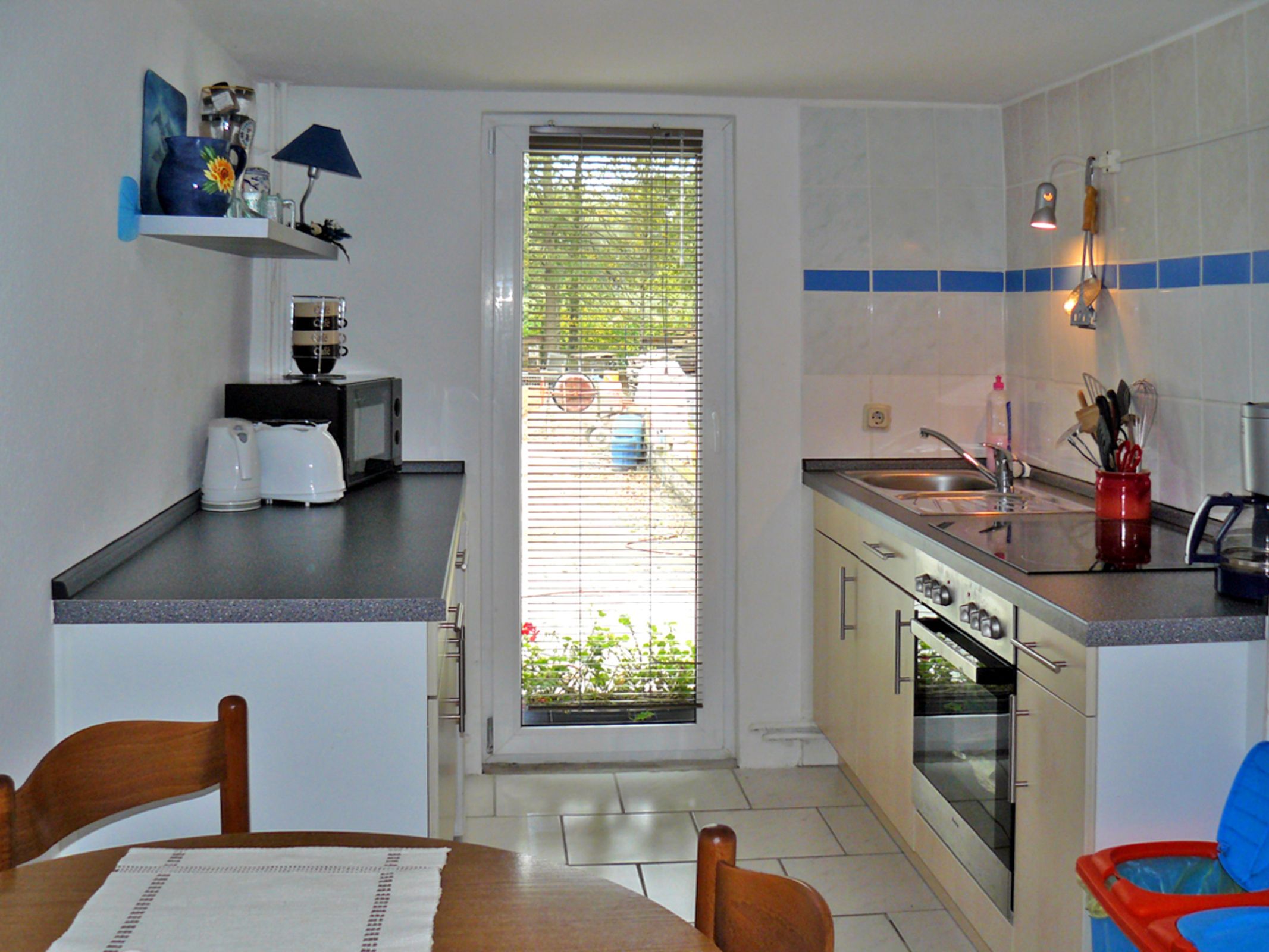 In der separaten Küche gibt es mit einer Essecke, Radio, Ceranherd mit Backofen, Kombi-Mikrowelle mit Grill, Toaster, Kaffeeautomat, Wasserkocher und großem Kühlschrank alles was das Herz begehrt. Für alle Gäste steht eine Gefriertruhe im Außenbereich zur Verfügung.