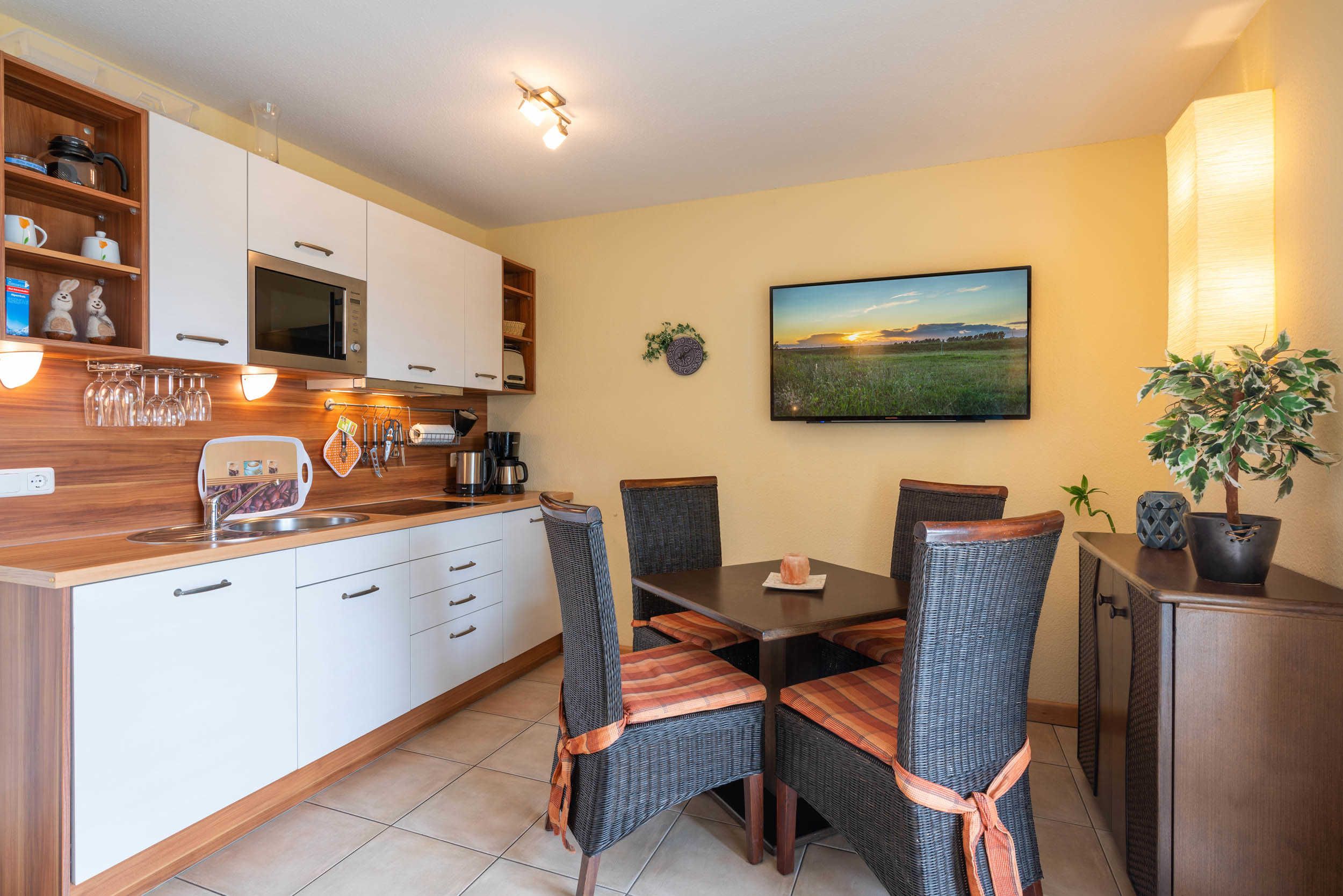 Die Wohnung ist sehr gemütlich mit Rattanmöbeln und Kaminofen eingerichtet, sowie mit reichlicher Küchenausstattung für Selbstversorger. Die Wohnung ist ohne Stufen erreichbar.