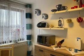 Die ca. 50 m² große Ferienwohnung im Obergeschoß bietet 2 Personen ausreichend Platz. Sie besteht aus einem Wohnraum mit Sitzgruppe dem Schlafraum mit dem Doppelbett. Die Küche ist in einem sep. Raum. Bad mit Dusche und WC.