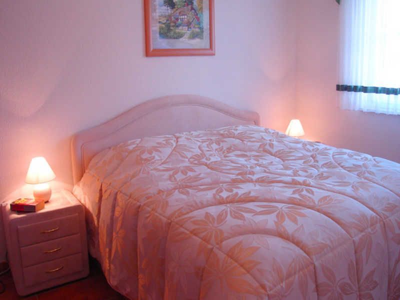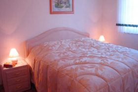 Das Schlafzimmer wurde ebenfalls geschmackvoll eingerichtet. Hier befinden sich ein Kleiderschrank, Nachttische mit Leselampen sowie das große Ehebett für einen erholsamen Schlaf.