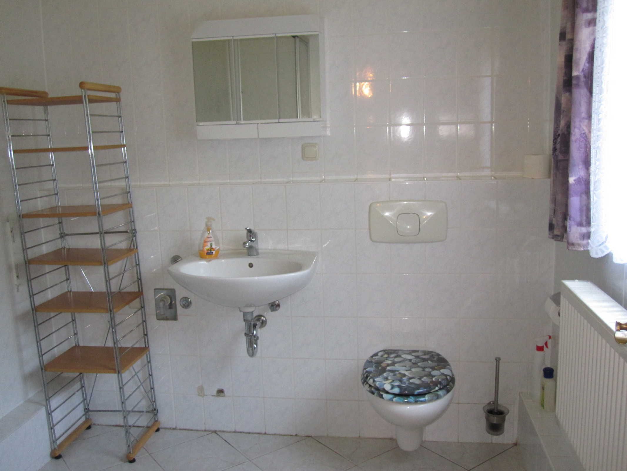 Bad mit Dusche, WC, Waschbecken und Fenster