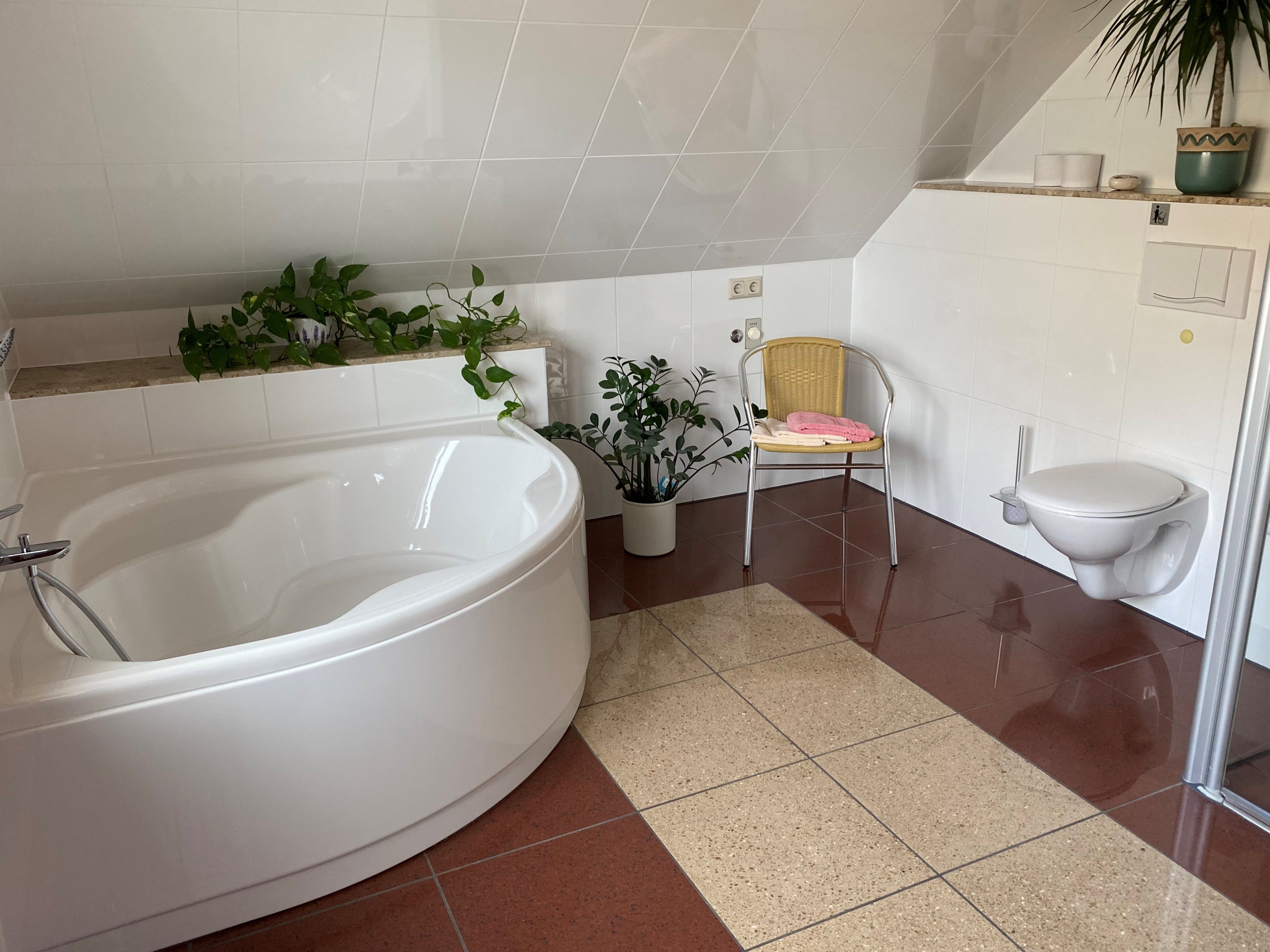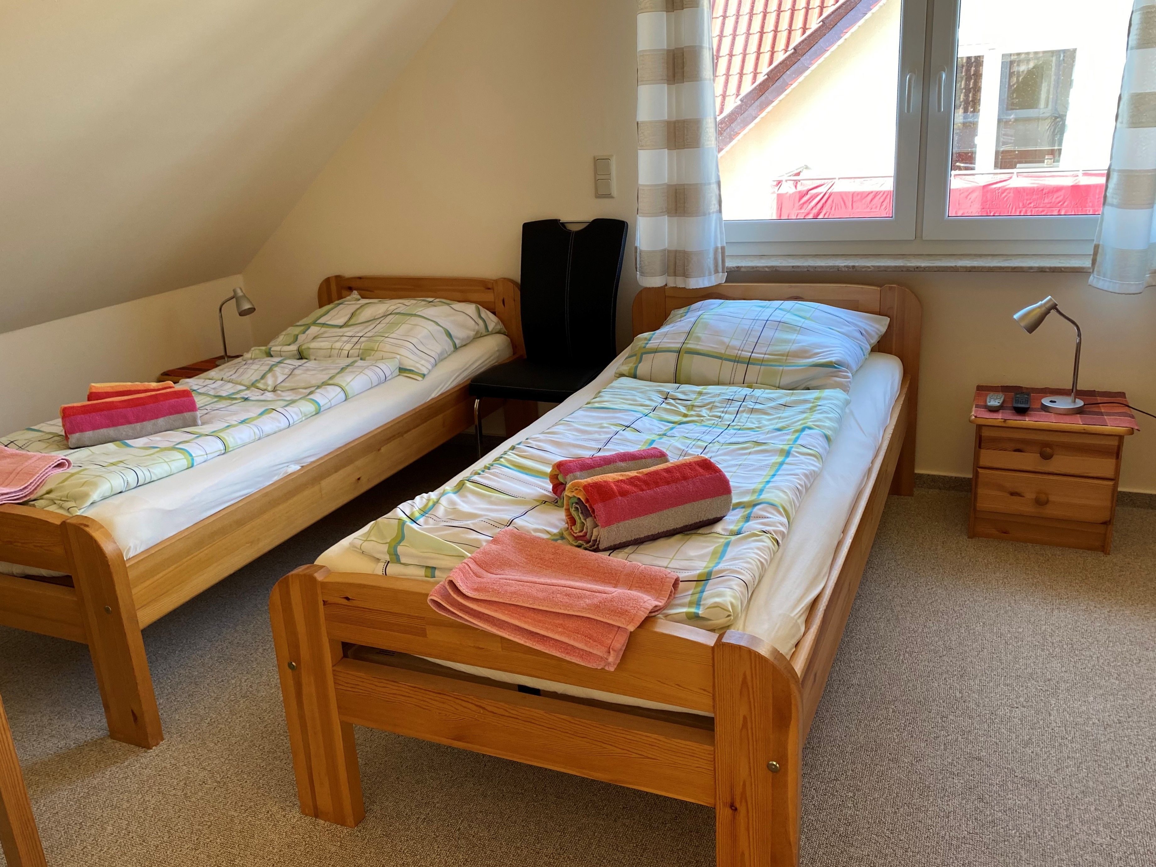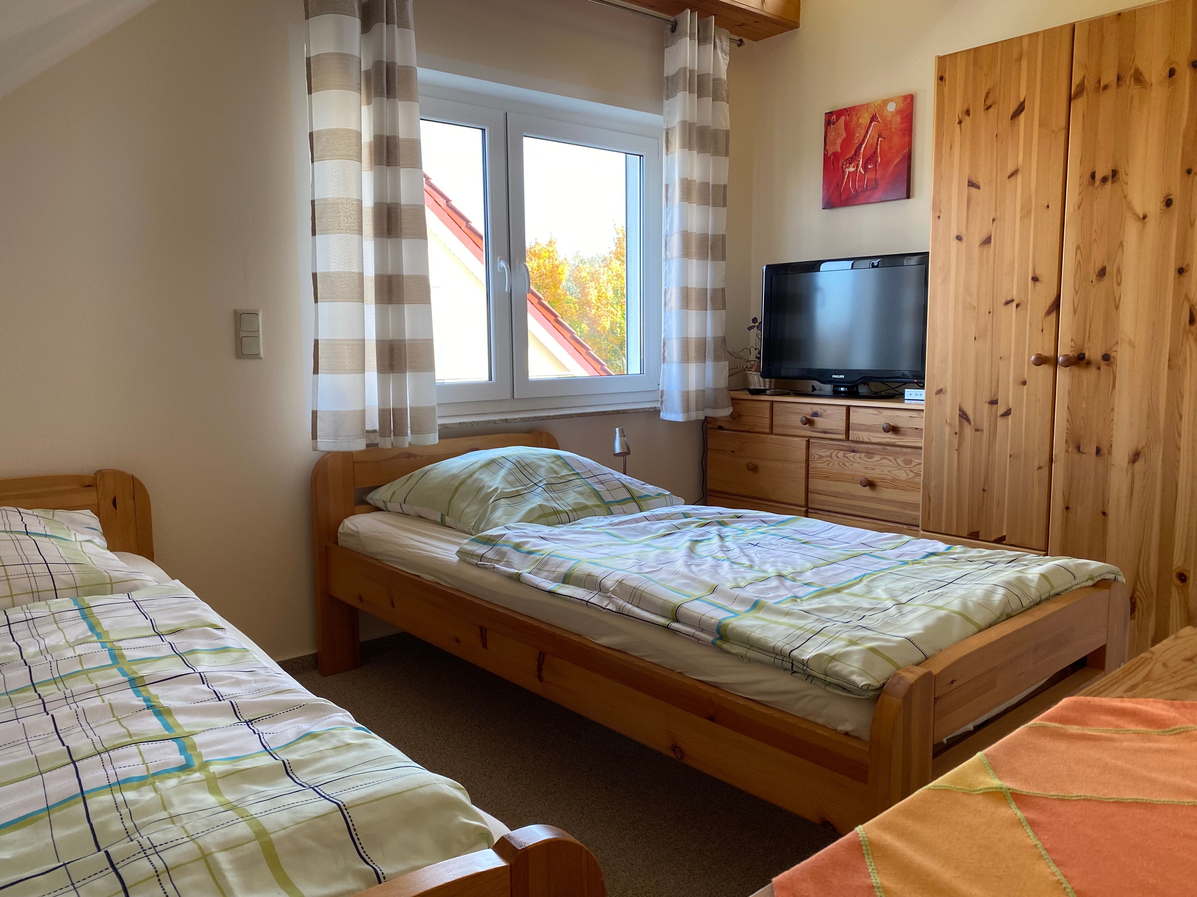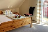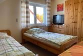 Unsere Ferienwohnung ist 90 qm groß und liegt im Obergeschoss eines Ferienhauses. Sie verfügt über ein großes Wohnzimmer, ein Schlafzimmer mit Doppelbett (nicht trennbar), ein Schlafzimmer mit zwei Einzelbetten, Küche und ein großes Bad mit Doppelwaschtisch, Dusche, Eckbadewanne und WC. Die Aufbettung für die 5. Person erfolgt auf einer ausklappbaren Schlafcouch im Wohnzimmer.