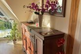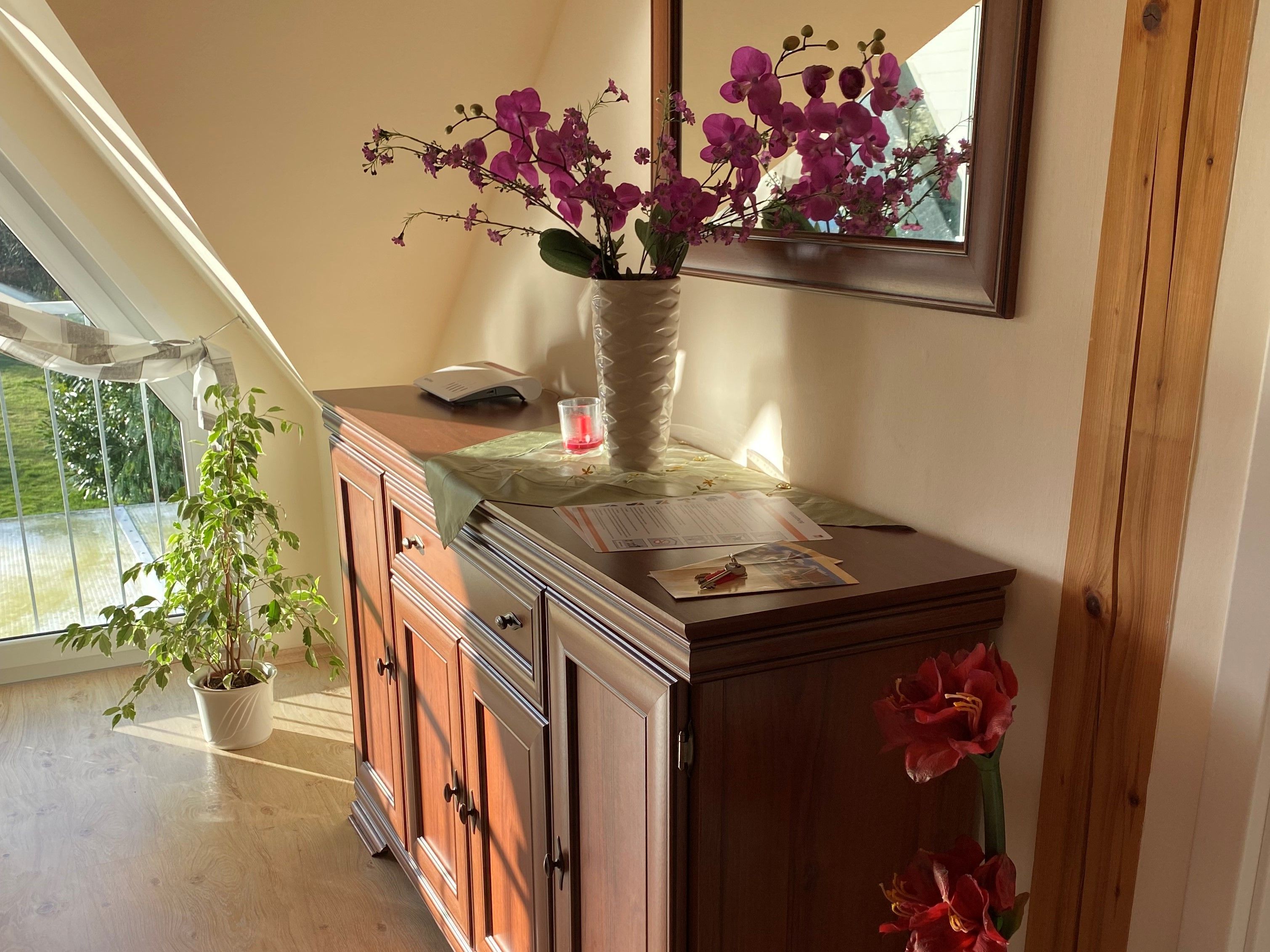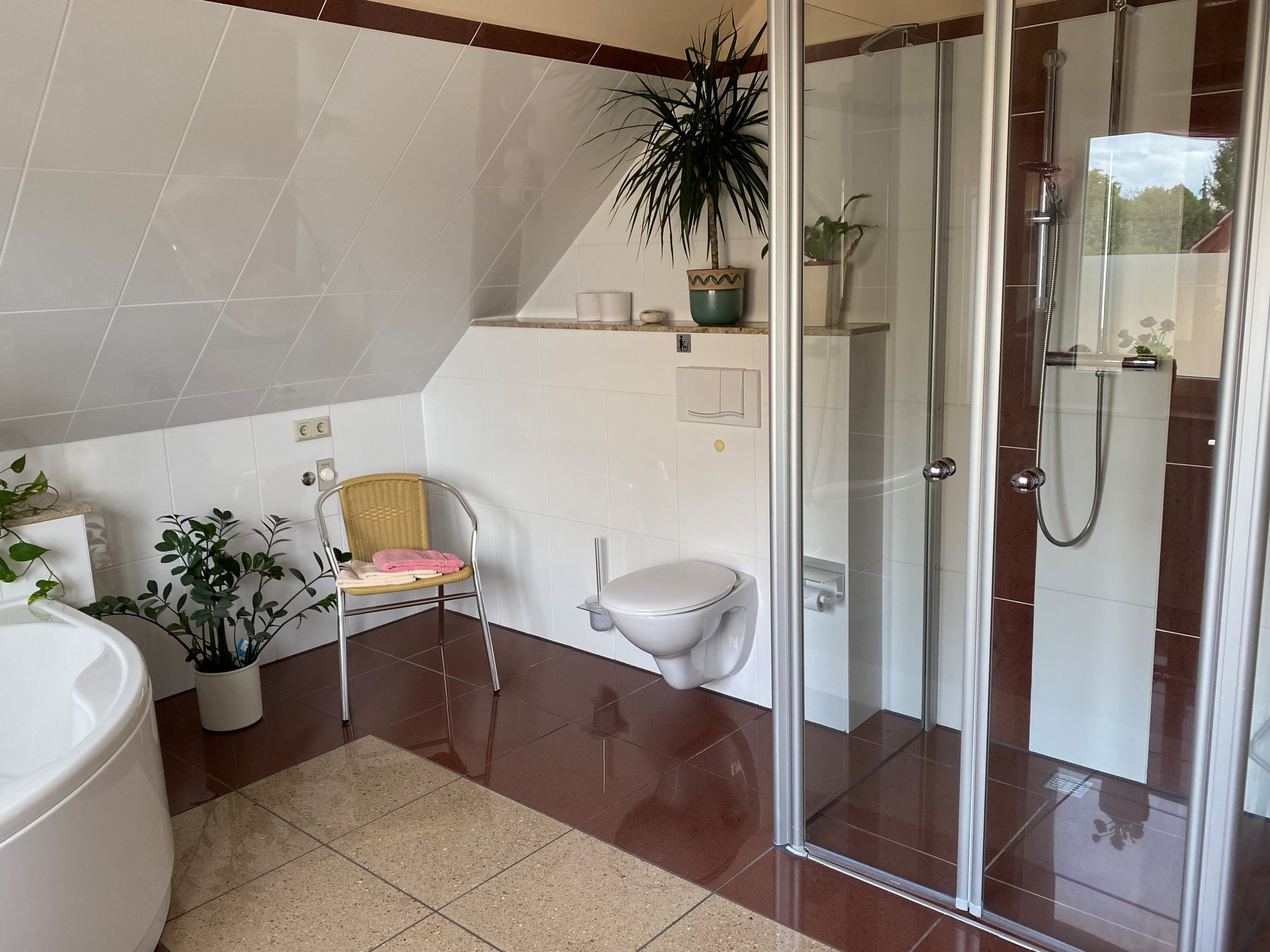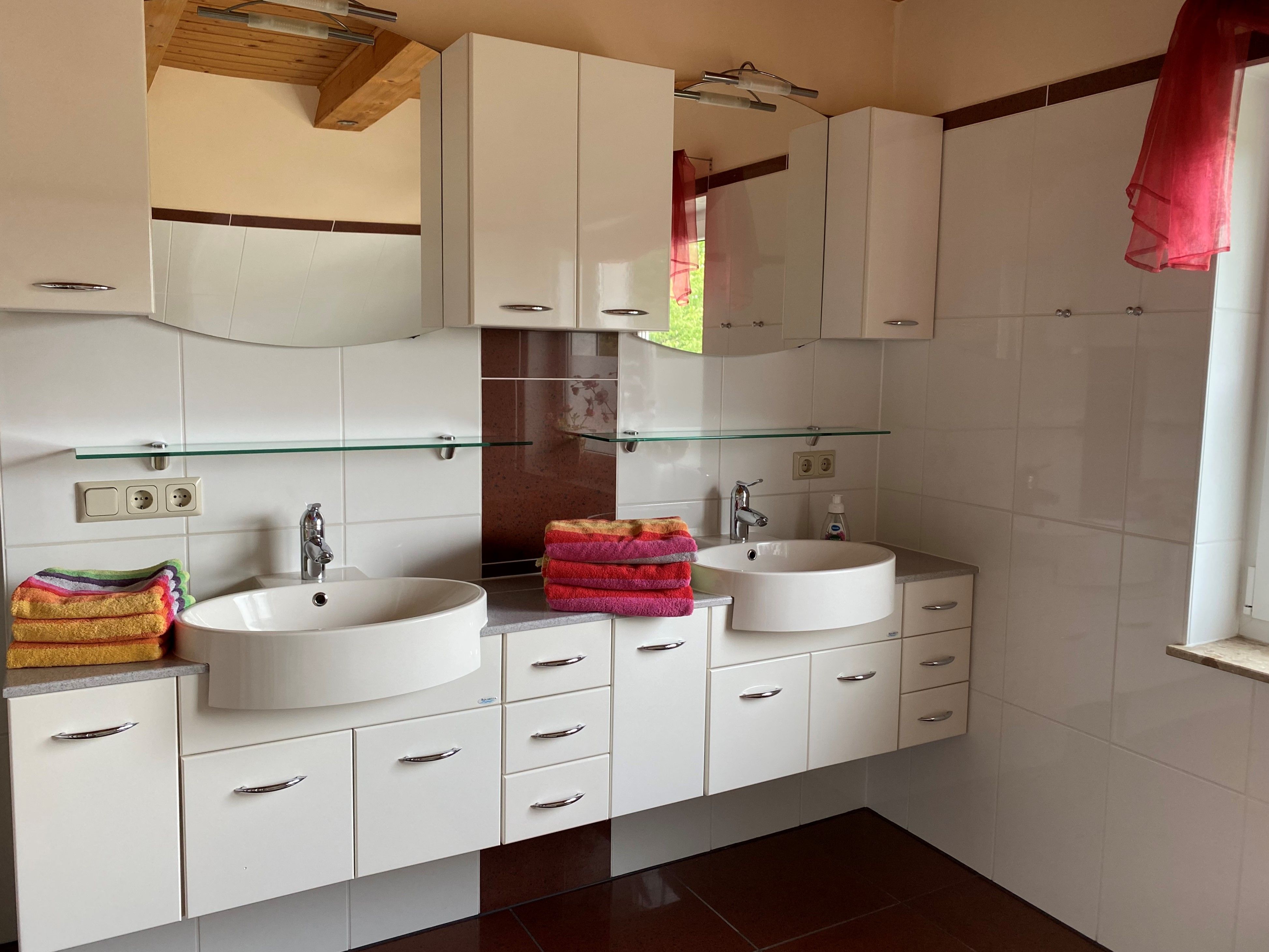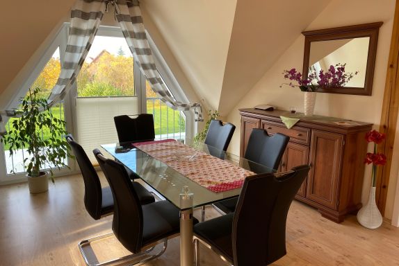 Unsere Ferienwohnung ist 90 qm groß und liegt im Obergeschoss eines Ferienhauses. Sie verfügt über ein großes Wohnzimmer, ein Schlafzimmer mit Doppelbett (nicht trennbar), ein Schlafzimmer mit zwei Einzelbetten, Küche und ein großes Bad mit Doppelwaschtisch, Dusche, Eckbadewanne und WC. Die Aufbettung für die 5. Person erfolgt auf einer ausklappbaren Schlafcouch im Wohnzimmer.