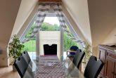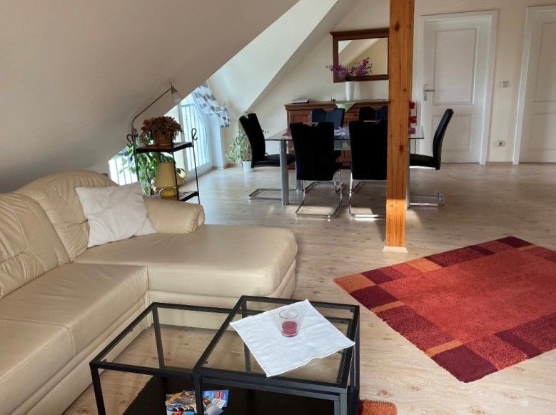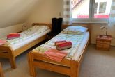 Unsere Ferienwohnung ist 90 qm groß und liegt im Obergeschoss eines Ferienhauses. Sie verfügt über ein großes Wohnzimmer, ein Schlafzimmer mit Doppelbett (nicht trennbar), ein Schlafzimmer mit zwei Einzelbetten, Küche und ein großes Bad mit Doppelwaschtisch, Dusche, Eckbadewanne und WC. Die Aufbettung für die 5. Person erfolgt auf einer ausklappbaren Schlafcouch im Wohnzimmer.