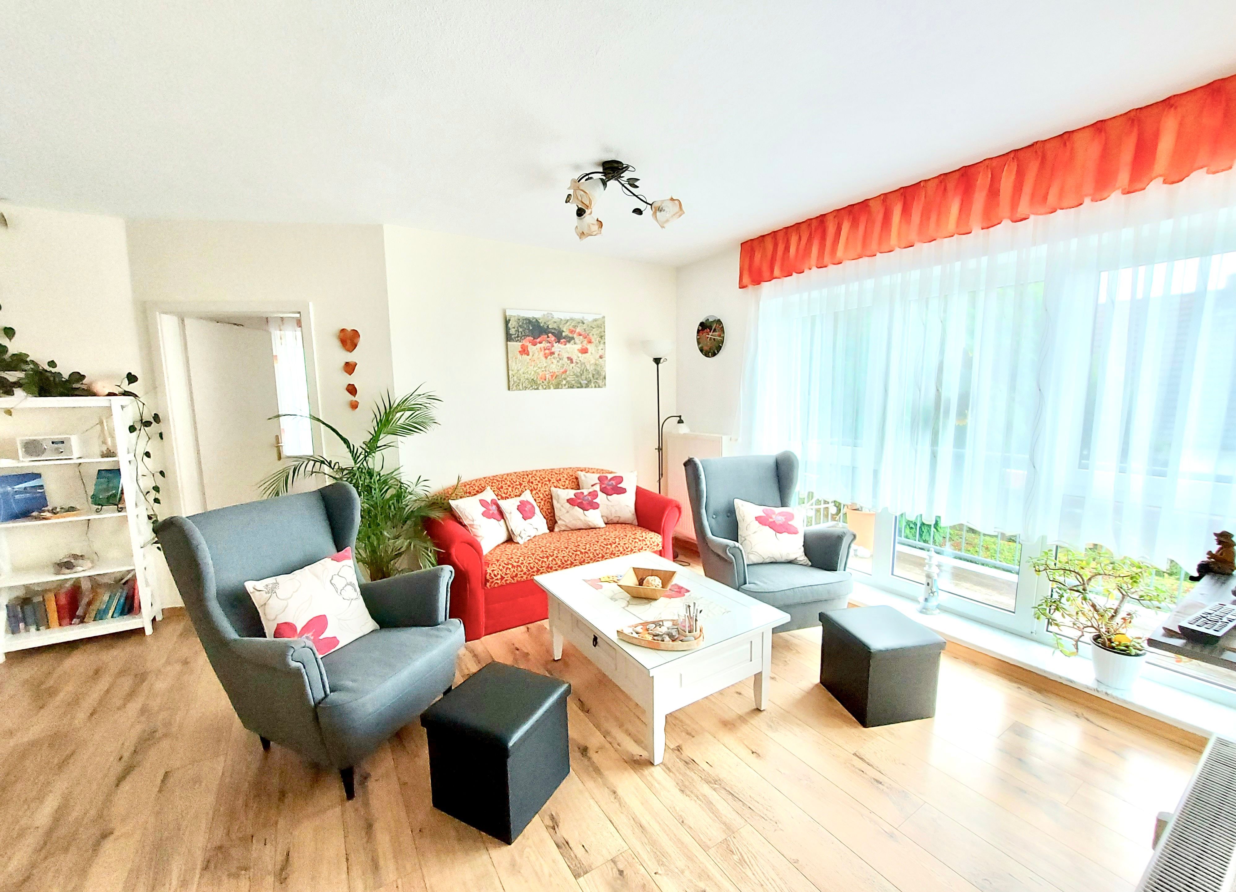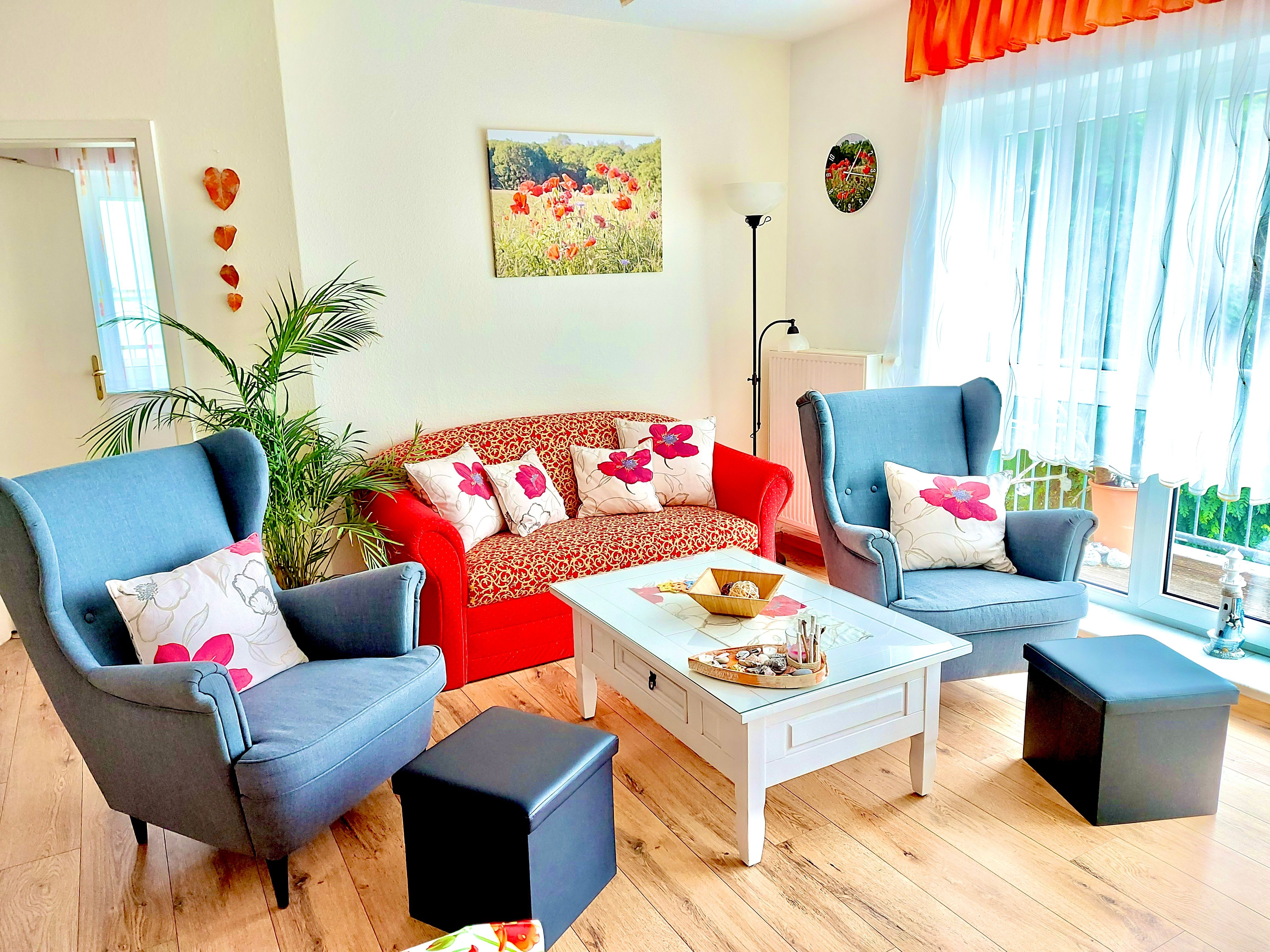 Ferienwohnung Mohnblume, Sassnitz. Diese Komfort-Ferienwohnung befindet sich in bevorzugter Lage am Hochufer im ersten Stock eines gepflegten Apartmenthauses in ruhiger Lage aber sehr Zentral. Sie verfügt über einen großen lichtdurchfluteten Wohnraum mit 2 gemütlichen Sofas, und einem Sessel, die zum Sat.- Fernsehen oder zum Musikhören einladen,oder gehen sie von hier auf den Balkon mit schönen Holzmöbeln Sitzkissen und Sonnenschirm und geniessen zb. leckeren Fisch den sie gerade am Hafen direkt vom Fischer geholt haben und in der kompletten Einbauküche mit allem Komfort , wie Geschirrspüler,Mikrowelle,Ceranfeld,Kühl-Gefrierkombi usw mit Freude zubereiten können.Angrenzend ist der Esstisch mit 4 gemütlichen Stühlen.Die Nacht geniessen sie im grosszügigen Schlafzimmer mit Doppelbett und 2. Balkon und im zweiten Schlafzimmer mit 2 Einzelbetten.Im Bad erwartet sie zum Entspannen eine Wanne. Auch ihr Auto hat einen eigenen PKW-Stellplatz auf dem Hof. Fahrradständer vorhanden. Bettwäsche inklusive. Handtücher bitte selbst mitbringen.