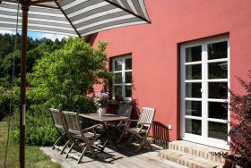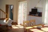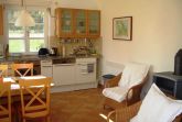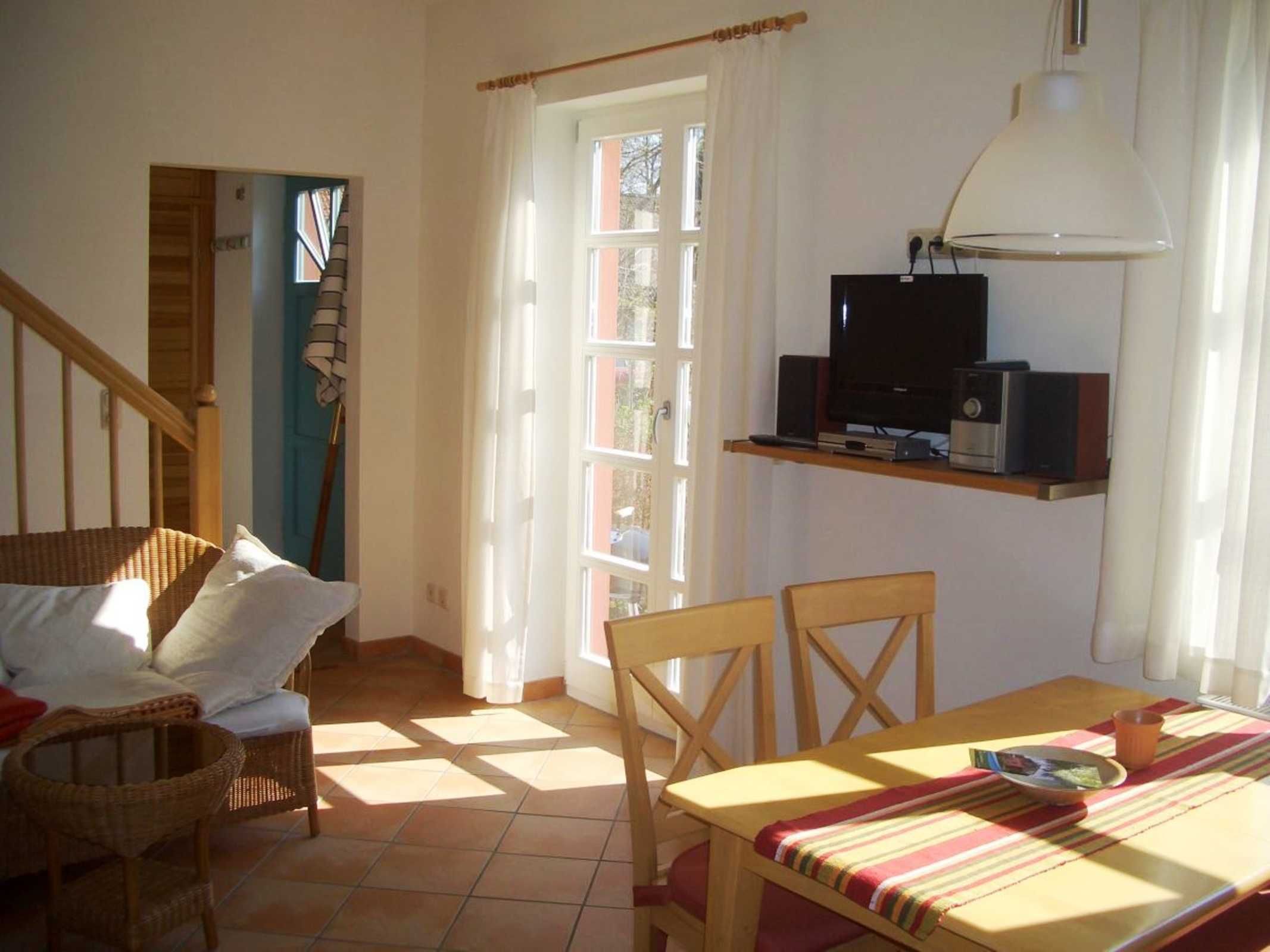 Das Wohnzimmer verfügt über eine Korbmöbel-Sitzecke mit kleinem Flachbildfernseher, einen großen Esstisch für 4 Personen, Kaminofen und Fußbodenheizung.