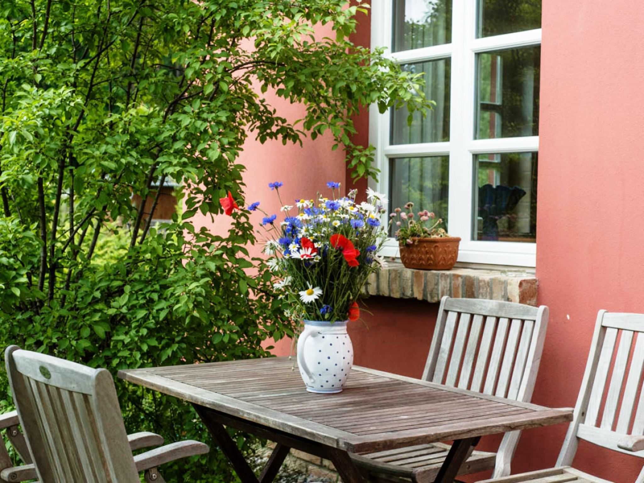 Das Ferienhaus nimmt knapp die Hälfte eines nach altem ortstypischem Vorbild gebauten Reetdachhauses, in der ruhigen Ortsmitte von Morgenitz ein. Es grenzt unmittelbar an die ehemalige Töpferei Danegger. Das Haus selbst korrespondiert in Farbe und Schilfdach mit dem Töpferanwesen, dem ehemaligen Morgenitzer Gutshaus.