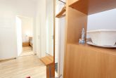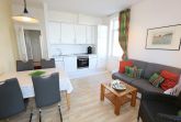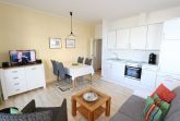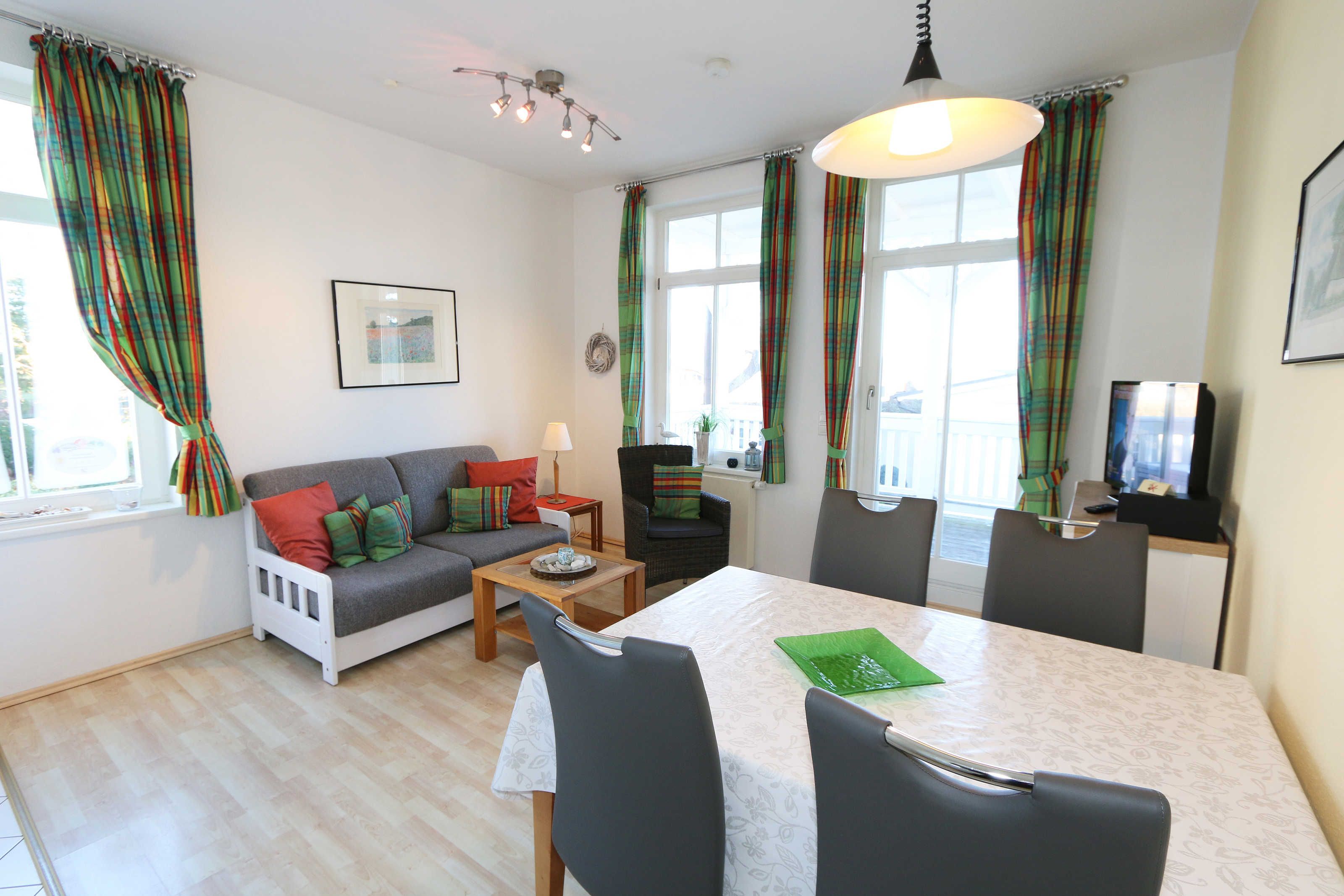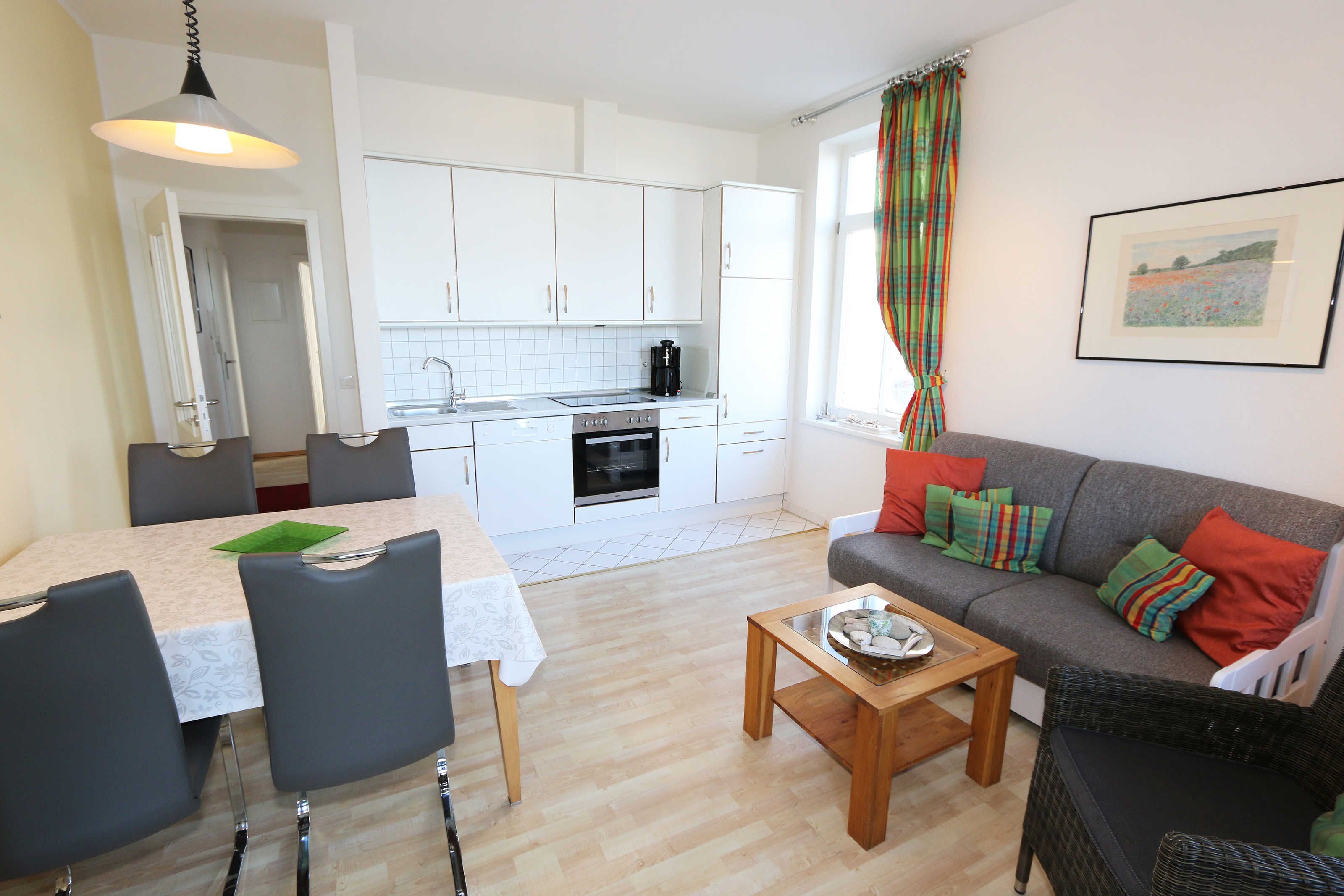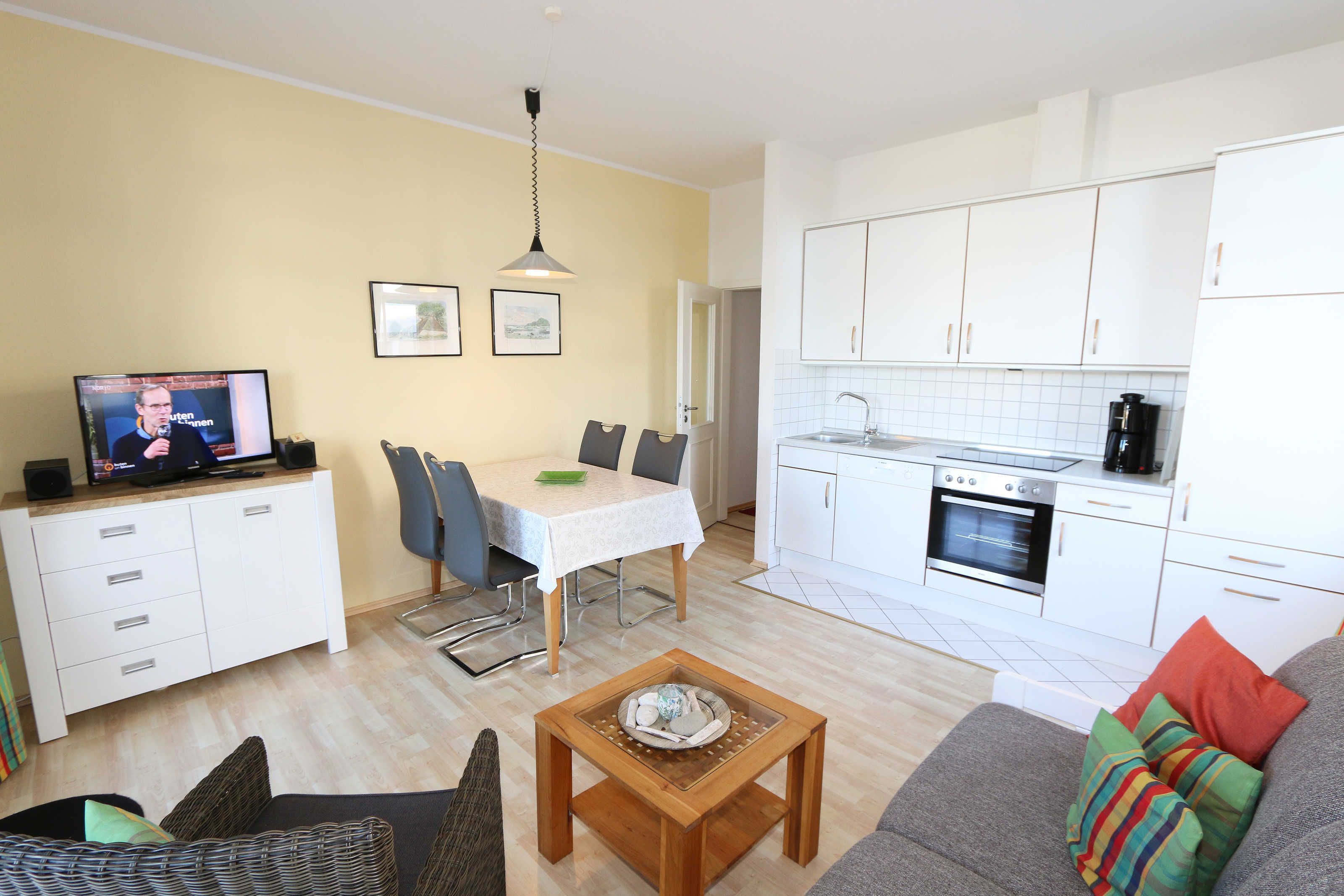 Die liebevoll eingerichtete 2- Raumferienwohnung ist eine Nichtraucherwohnung und bietet ausreichend Platz für 2 bis 4 Personen. Die Wohnfläche umfasst ca. 45 m². Der kombinierte Wohn- Essbereich ist mit einer komplett ausgestatteten Küchenzeile versehen, die über einen Geschirrspüler, Kühlschrank mit Eisfach, Cerankochfeld, Backofen, Kaffeemaschine, Toaster, Wasserkocher, diversen Küchenutensilien sowie einen Esstisch mit 4 Stühlen verfügt. Angrenzend bietet Ihnen der Wohnbereich eine Couchecke (Aufbettung für 3./4. Person 1,50m x 2,00m) mit Sessel, Couchtisch, Leselampe sowie eine Anrichte mit Smart-TV (81 cm Diagonale), Video/Blu-Ray-Player und DAB-Radio. Vom Wohnbereich aus gelangen Sie auf den ca. 10 m² bestuhlten und überdachten Balkon. Von hier aus haben Sie Blick auf die Ostsee, wo Sie Ihren Tag bei einem Glas Wein ausklingen lassen können. Das Tageslichtbad erreichen Sie durch den Flur wo eine Dusche, Kosmetikspiegel, Fön, WC und ein Waschtisch das Ganze abrunden. Das separate Schlafzimmer ist mit einem Doppelbett (1,80m x 2,00m), Nachtischkonsolen und Kleiderschrank ausgestattet. Ein kleiner Abstellraum steht Ihnen zusätzlich in der Wohnung zur Verfügung wo Sie auch ein Bügelbrett/Bügeleisen vorfinden. Die Räumlichkeiten sind mit Fliesen und Laminat verlegt worden. Ein WLAN-Zugang ist für Sie Inklusive. Ein PKW-Stellplatz (Nr.08) ist für Sie vorhanden sowie eine Fahrradunterstellmöglichkeit im Keller. Im Nebengebäude können Sie eine Waschmaschine und einen Trockner gegen eine Extragebühr nutzen. Die Erstausstattung eines Wäschepaketes (komplette Bettwäsche, 1 Duschhandtuch, 2 kleine Handtücher, 2 Geschirrhandtücher) können Sie bis 14 Tage vor Anreise gegen einen Aufpreis dazu buchen oder durch eigene ergänzen.