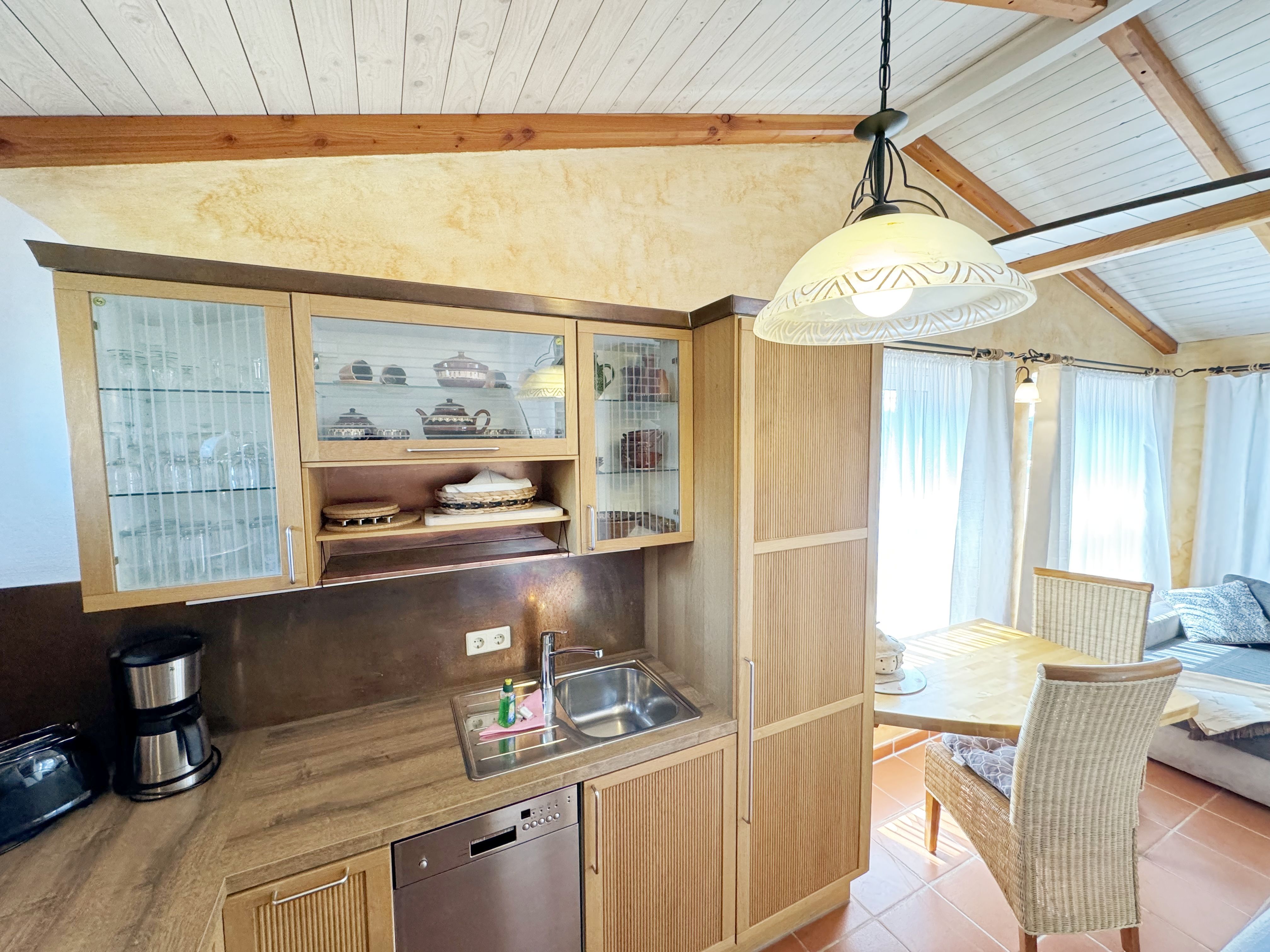 Das Nichtraucherferienhaus Thea umfasst ca. 48 m² und bietet Ihnen Platz für max. 2 Erwachsene. Der offene Wohnbereich ist mit einer Eckcouch, Couchtisch, Radio mit CD-Player, DVD-Player und einem Smart-TV ausgestattet. Auch auf einen Internetanschluss (WLAN) brauchen Sie im Urlaub nicht verzichten. Dieser ist inklusive für Sie. In Verlängerung schließt sich der Essplatz an. Die vollausgestattet Küchenzeile verfügt über einen Backofen, Ceranfeld mit Dunstabzugshabe, Geschirrspüler, Mikrowelle, Kühlschrank mit Eisfach, Kaffeemaschine, Toaster, Wasserkocher sowie diverse Küchenutensilien. Für gemütliche Abende, gerade in der kälteren Jahreszeit, sorgt ein Kamin. Das offene Schlafzimmer verfügt über ein Doppelbett (1,80 m x 2,00 m), Nachttischablagen sowie einen Kleiderschrank. Vom Wohnbereich gelangen Sie auf die bestuhlte Terrasse. Das Tageslicht-Bad wird durch eine Eckdusche, Handtuchwärmer, Fön, WC und Waschtisch abgerundet. Alle Räumlichkeiten sind mit einer Fußbodenheizung sowie Fliesen versehen worden. Mit einem eigenen und mitgebrachten Schlafplatz sind max. 2 Haustiere gegen eine Gebühr gern gesehene Gäste. Im separaten Waschhaus können Sie gegen eine Kasse des Vertrauens eine Waschmaschine und einen Trockner nutzen. Ihre mitgebrachten oder auch geliehenen Fahrräder können Sie am Haus abstellen. Ein PKW-Stellplatz mit Ladestation befindet sich auf dem Grundstück. Die Erstausstattung eines Wäschepaketes (komplette Bettwäsche, 1 Duschhandtuch, 1 kleines Handtuch) können Sie bis 14 Tage vor Anreise gegen einen Aufpreis dazu buchen oder durch eigene ergänzen. Ab 2 gebuchten Paketen erhalten Sie einmalig 1 Geschirrhandtuch und 1 Duschvorleger hinzu.