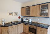 Küchenzeile mit Mikrowelle, Herd mit Ceranfeld und Backofen, Kühlschrank mit Gerierfach, Geschirrspüler und Kaffeemaschine