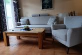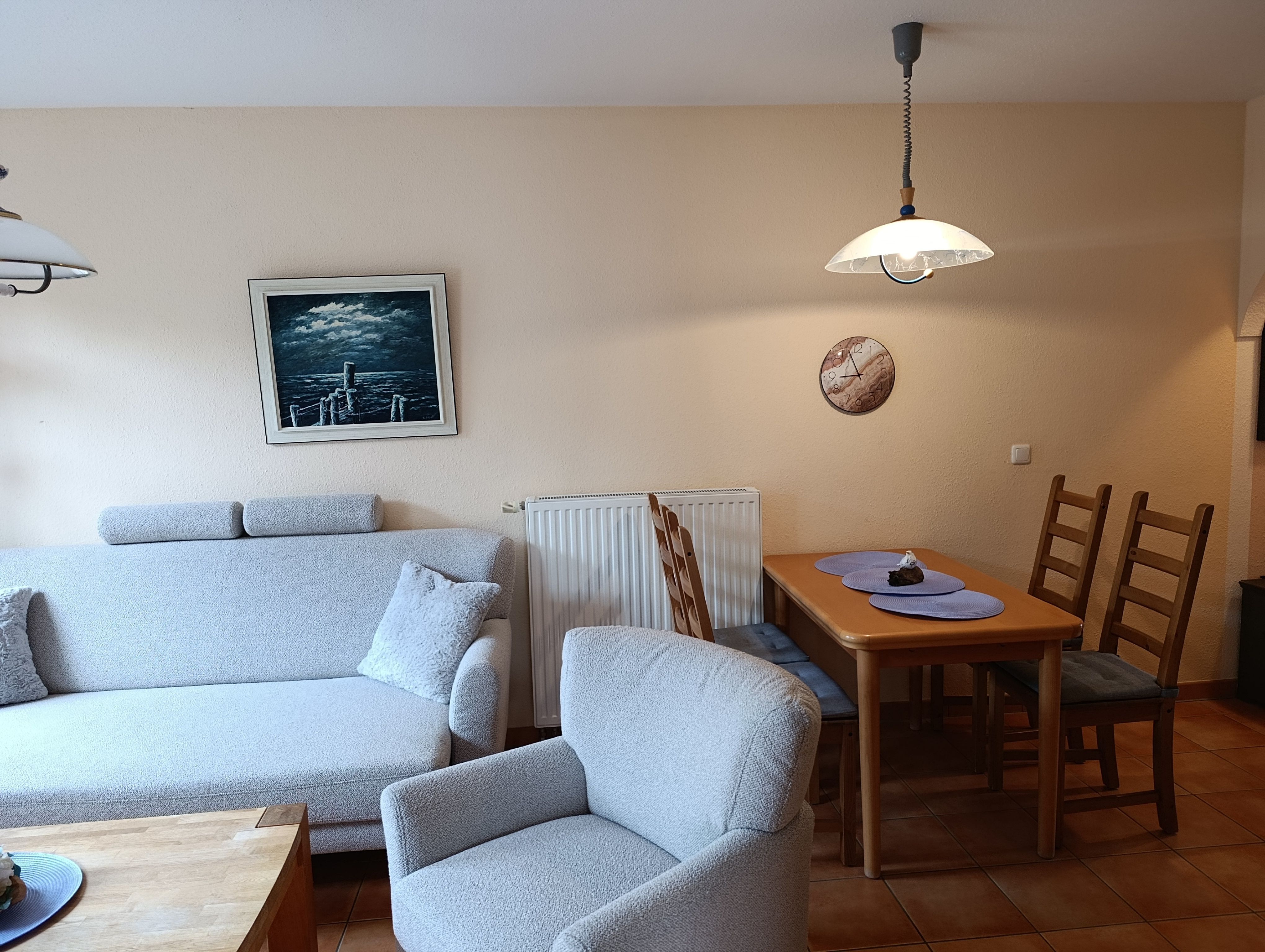Wohnzimmer mit Sitzecke, Couchtisch, Esstisch, Stühle, Anrichte, Küchenzeile, Kabel-TV und Radio
