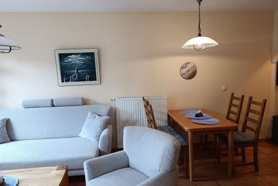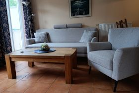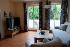 Nur 5 min vom Strand wohnen Sie in einer modern eingerichteten 3-Raum-Ferienwohnung. Die 55 qm große Wohnung liegt in der ersten Etage. Das Wohnzimmer ist mit einer Schlafcouch, Couchtisch, Sessel, Anrichte, Kabel-TV, Radio, Essbereich (Esstisch und 4 Stühle) und Küchenzeile ausgestattet. Im Schlafzimmer stehen ein Doppelbett und ein Kleiderschrank und im Gästezimmer zwei Betten und ein Kleiderschrank. Die Küchenzeile wurde sehr modern ausgestattet mit Mikrowelle, Kühlschrank, Kaffeemaschine, Geschirrspüler, Cerankochfeld, Backofen, Toaster und Wasserkocher. Das Bad mit Dusche/WC und der Flur mit Garderobe komplettieren die Wohnung. Der Balkon ist zur Südseite.