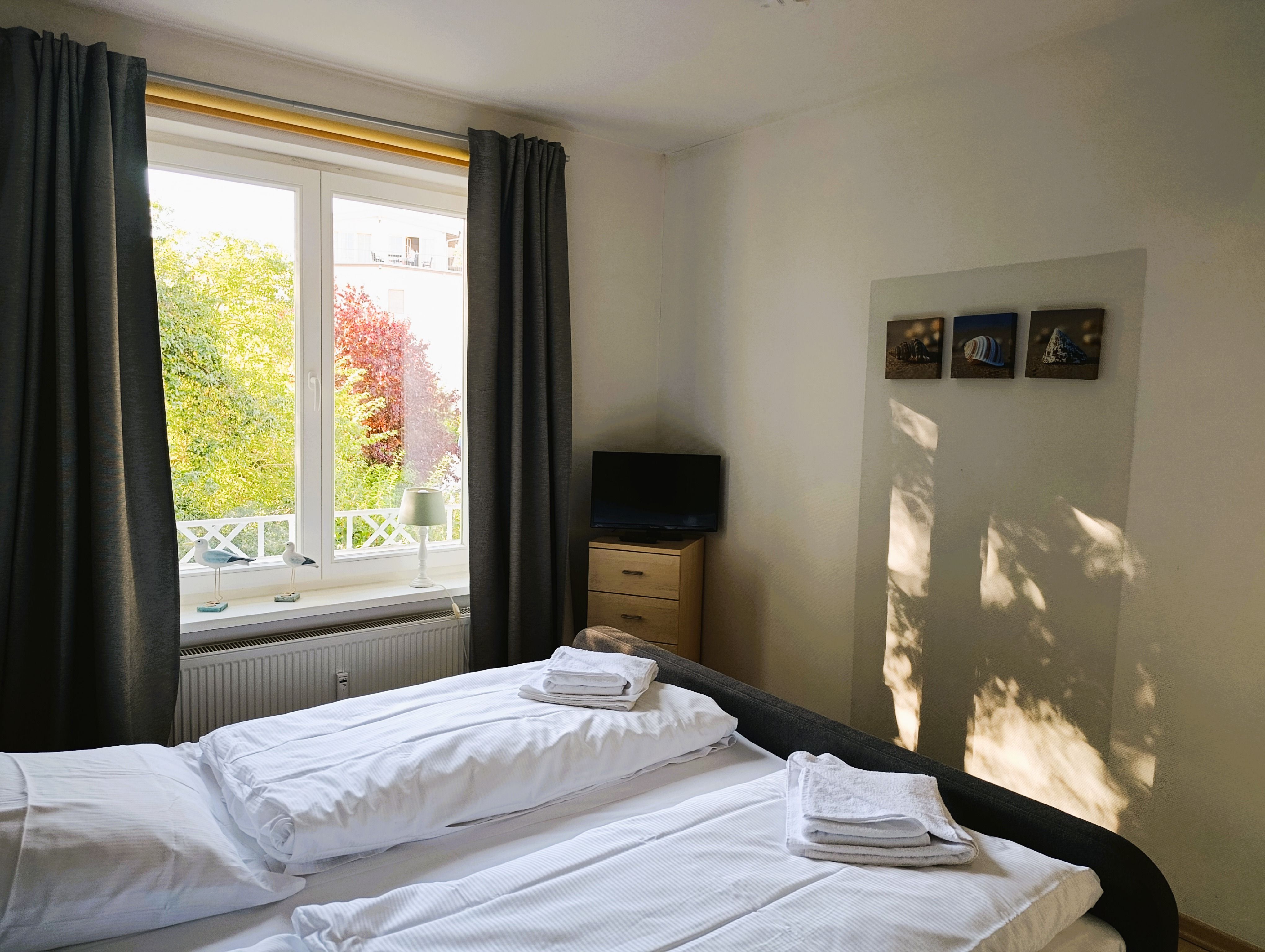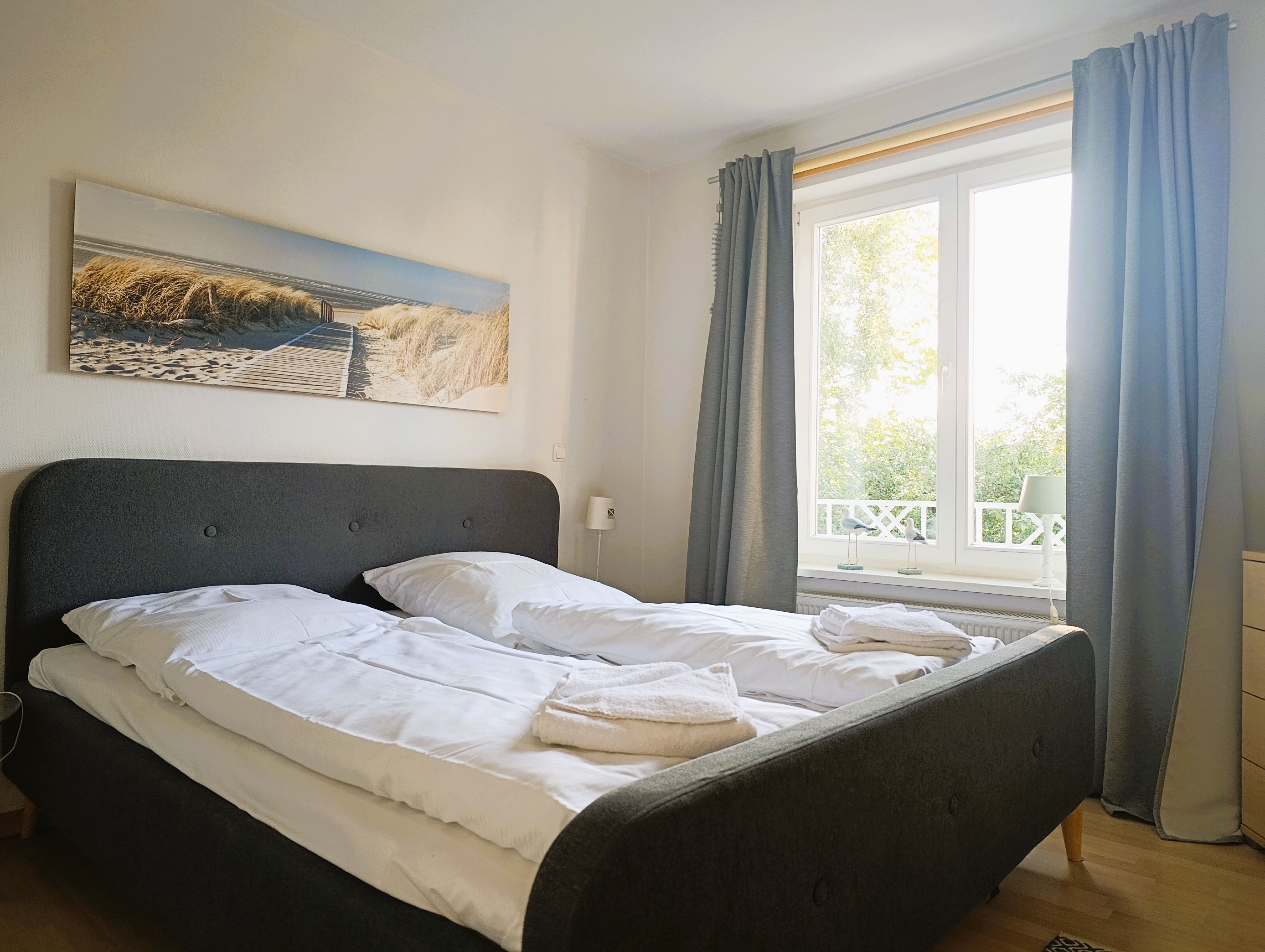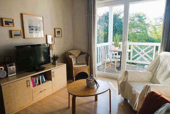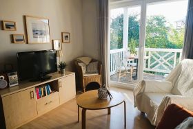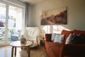 Nur 100 m vom Strand wohnen Sie in einer modern eingerichteten 2-Raum-Ferienwohnung. Die 45 qm große Wohnung liegt in der ersten Etage. Das Wohnzimmer ist mit einer Schlafcouch, Couchtisch, Anrichte, Regal, Kabel-TV, Radio, Essbereich (Tisch und Stühle) und Küchenzeile ausgestattet. Der Balkon geht zur Südseite. Im Schlafzimmer stehen ein Doppelbett und ein Kleiderschrank. Die Küchenzeile wurde sehr modern ausgestattet mit Mikrowelle, Kühlschrank, Kaffeemaschine, Herd mit Ceranfeld, Backofen, Toaster, Geschirrspüler und Wasserkocher. Das Bad mit Dusche und WC komplettiert die Wohnung.