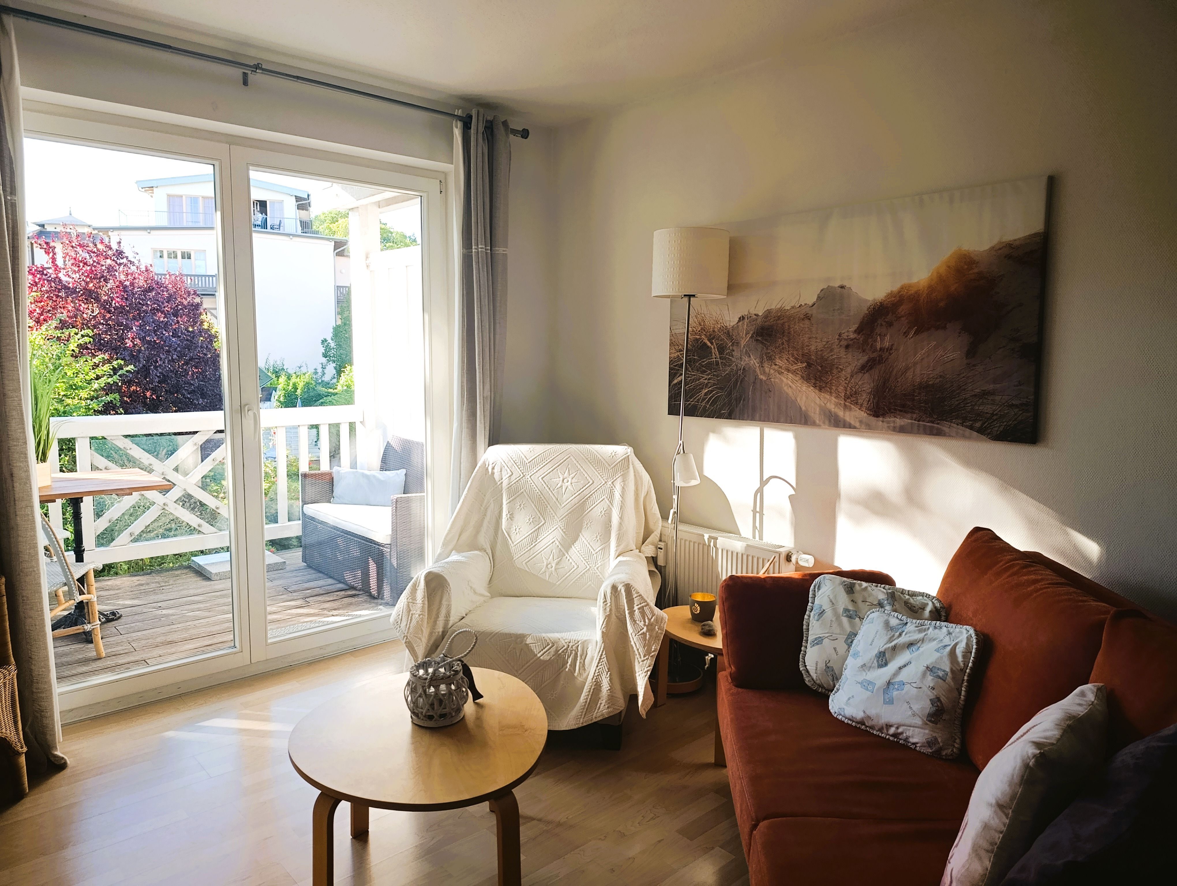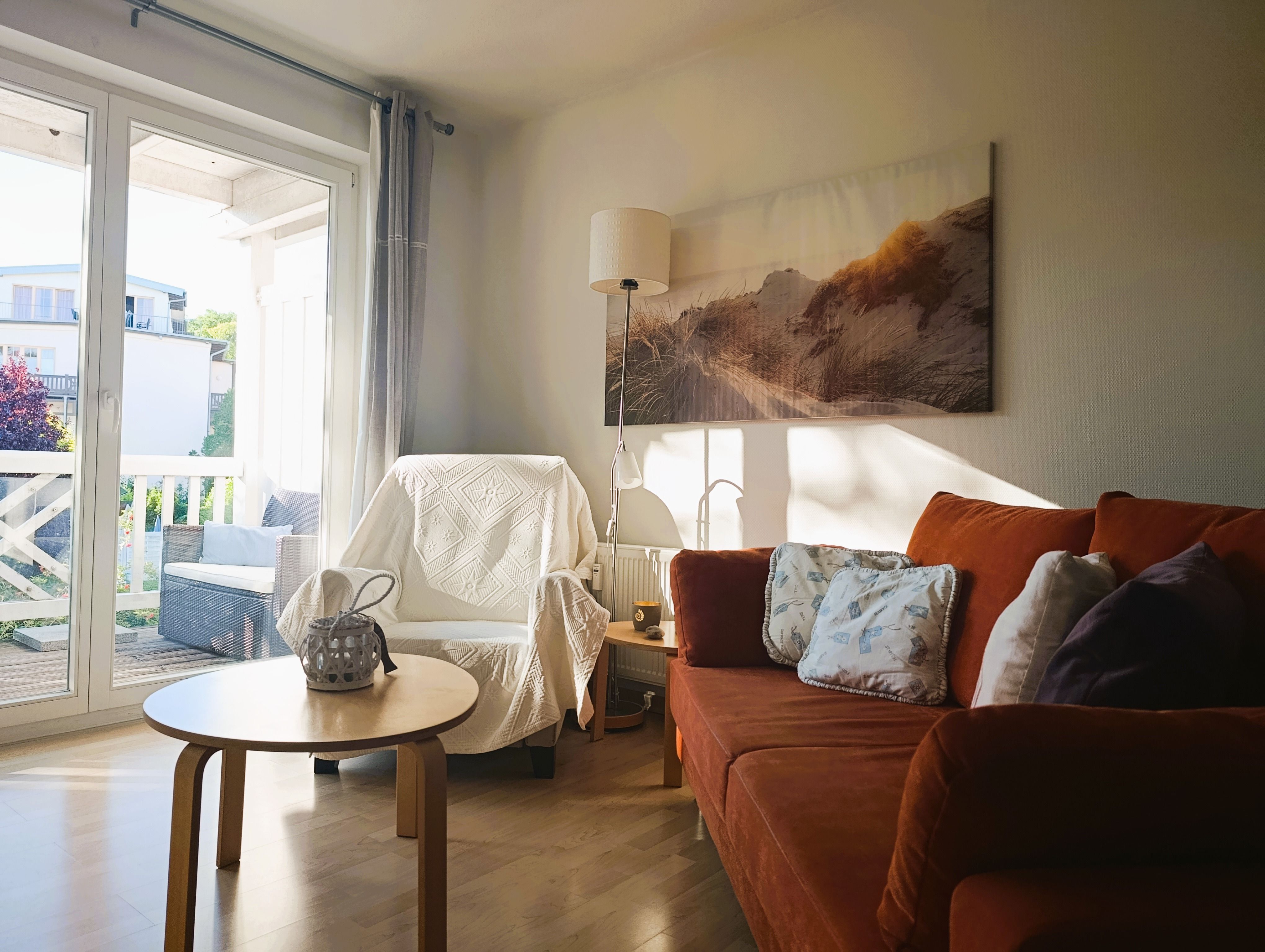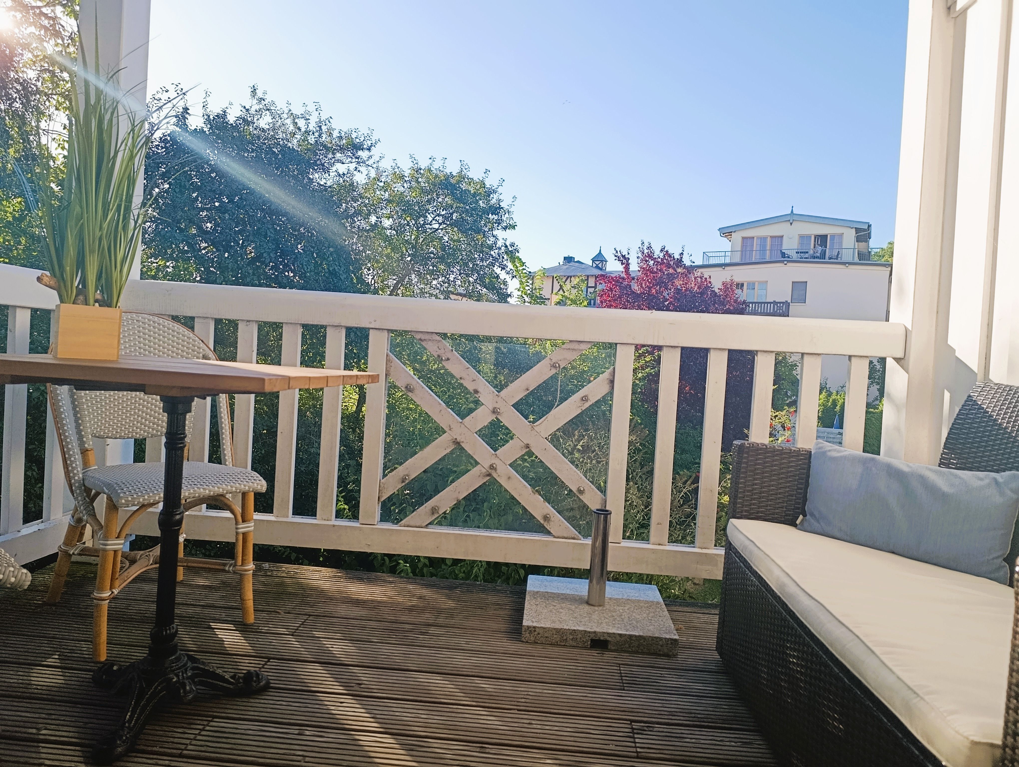 Nur 100 m vom Strand wohnen Sie in einer modern eingerichteten 2-Raum-Ferienwohnung. Die 45 qm große Wohnung liegt in der ersten Etage. Das Wohnzimmer ist mit einer Schlafcouch, Couchtisch, Anrichte, Regal, Kabel-TV, Radio, Essbereich (Tisch und Stühle) und Küchenzeile ausgestattet. Der Balkon geht zur Südseite. Im Schlafzimmer stehen ein Doppelbett und ein Kleiderschrank. Die Küchenzeile wurde sehr modern ausgestattet mit Mikrowelle, Kühlschrank, Kaffeemaschine, Herd mit Ceranfeld, Backofen, Toaster, Geschirrspüler und Wasserkocher. Das Bad mit Dusche und WC komplettiert die Wohnung.
