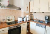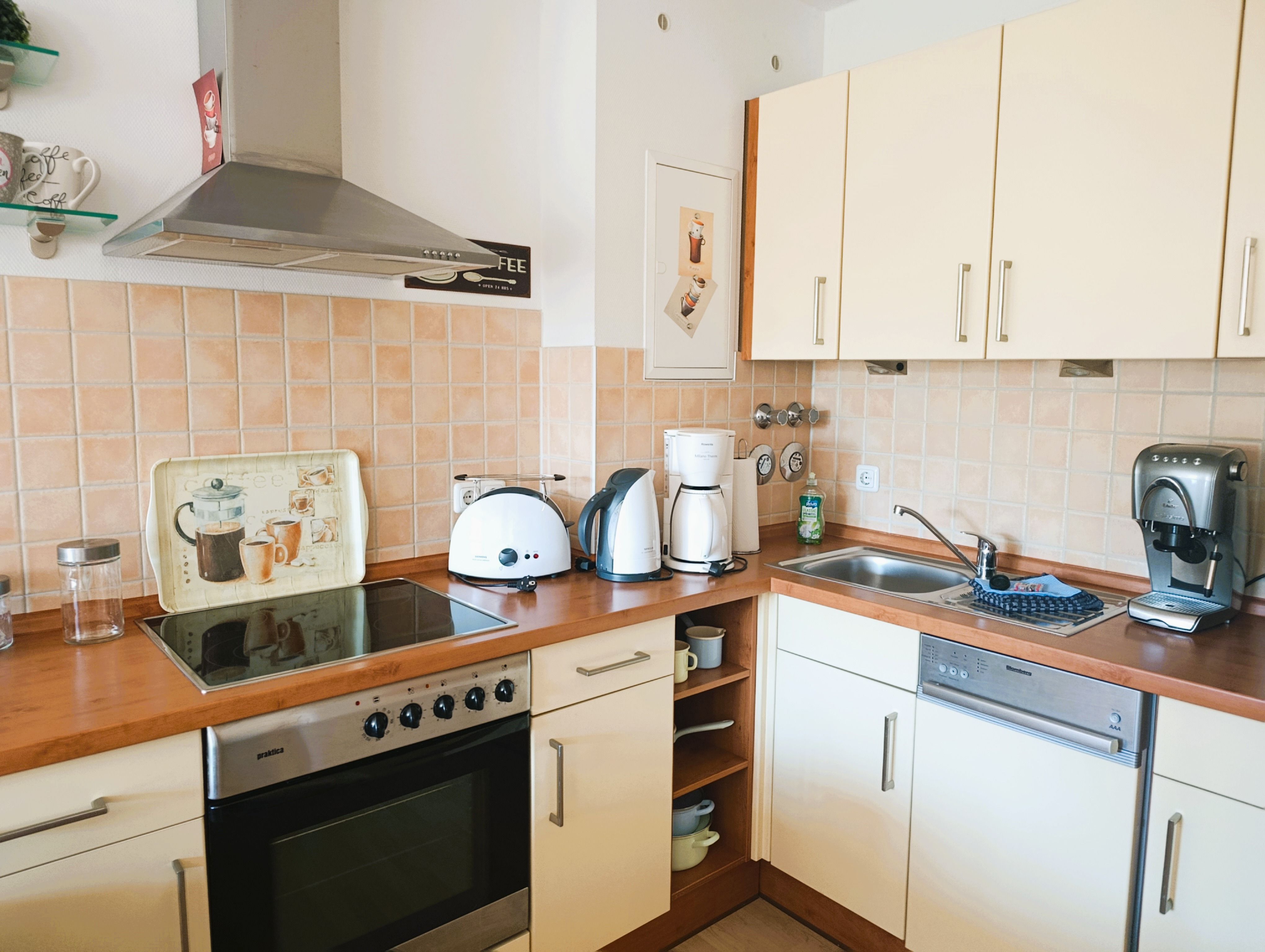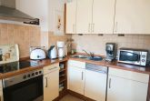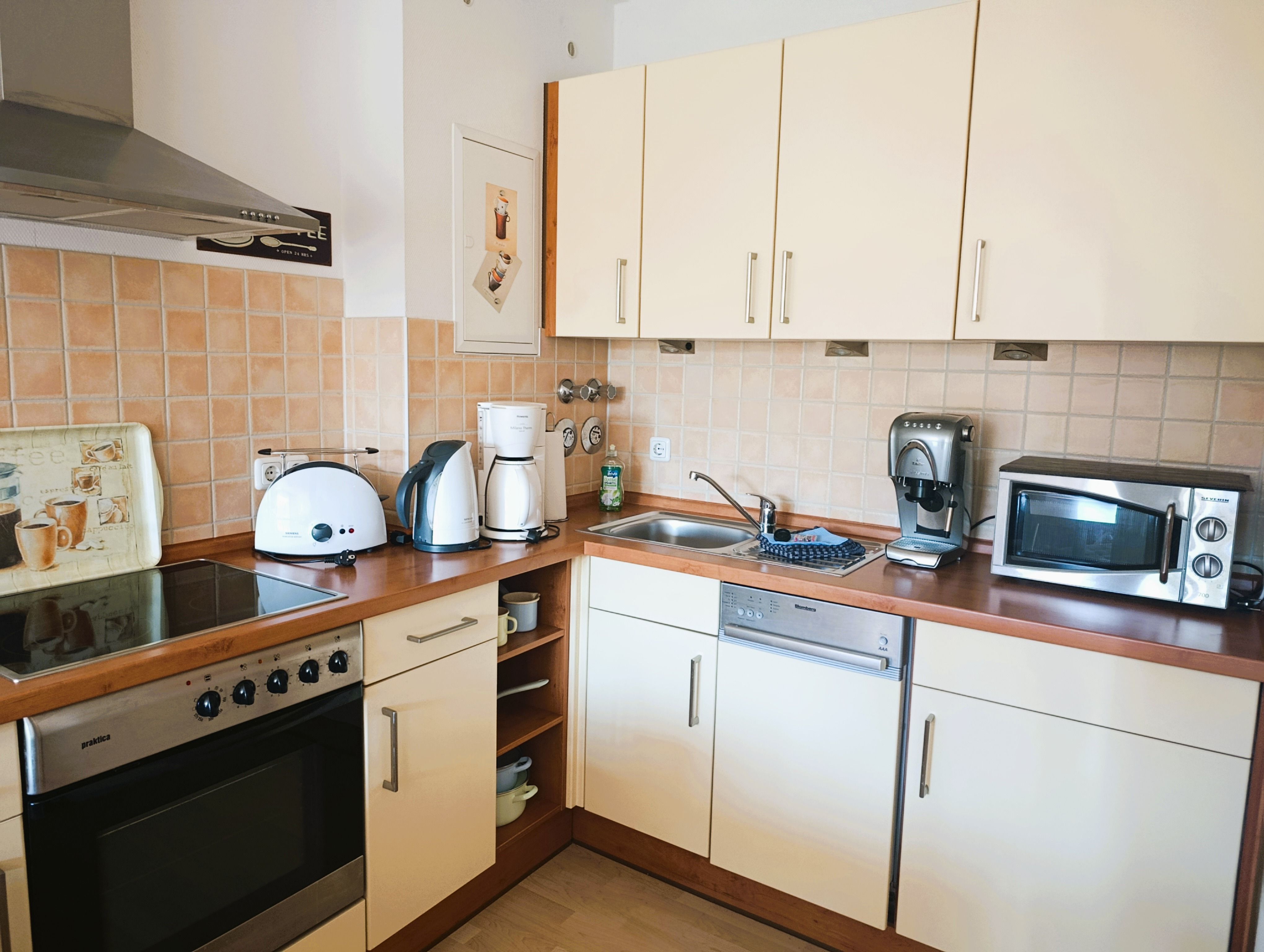Küchenzeile mit Mikrowelle, Kühlschrank mit Gefrierfach, 4-Platten-Herd mit Backofen, Geschirrspüler, Toaster,
