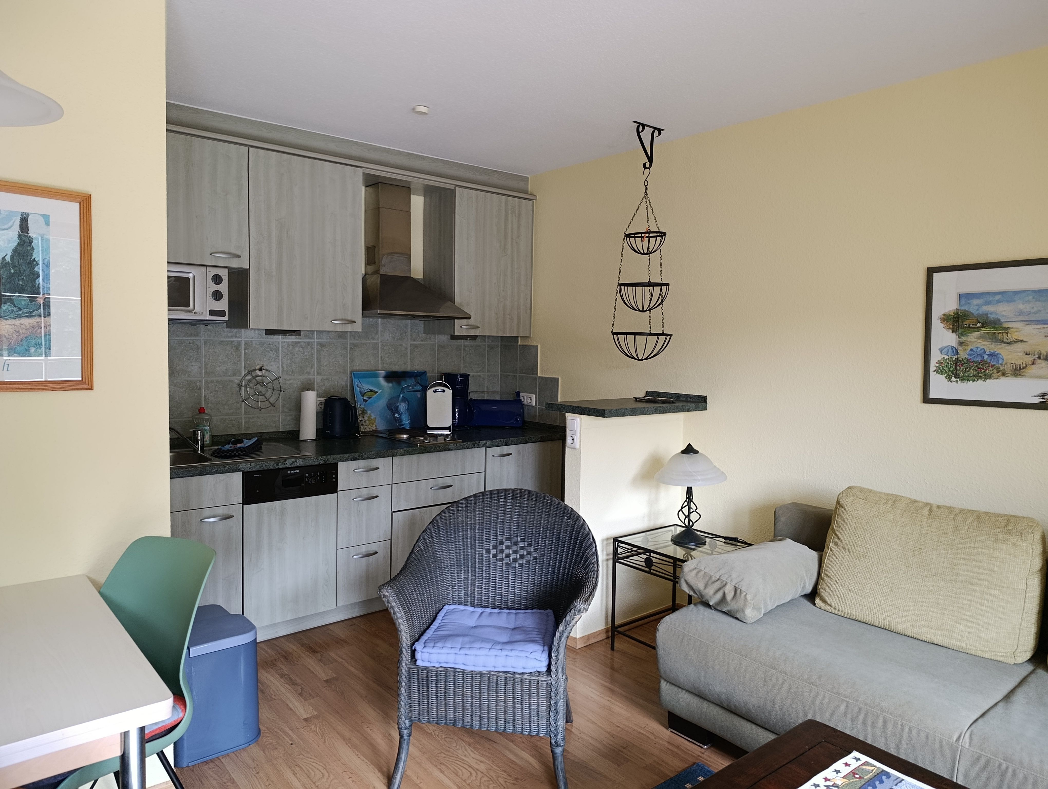 Wohnzimmer mit Schlafcouch, Esstisch, Küchenzeile, Radio und Kabel-TV