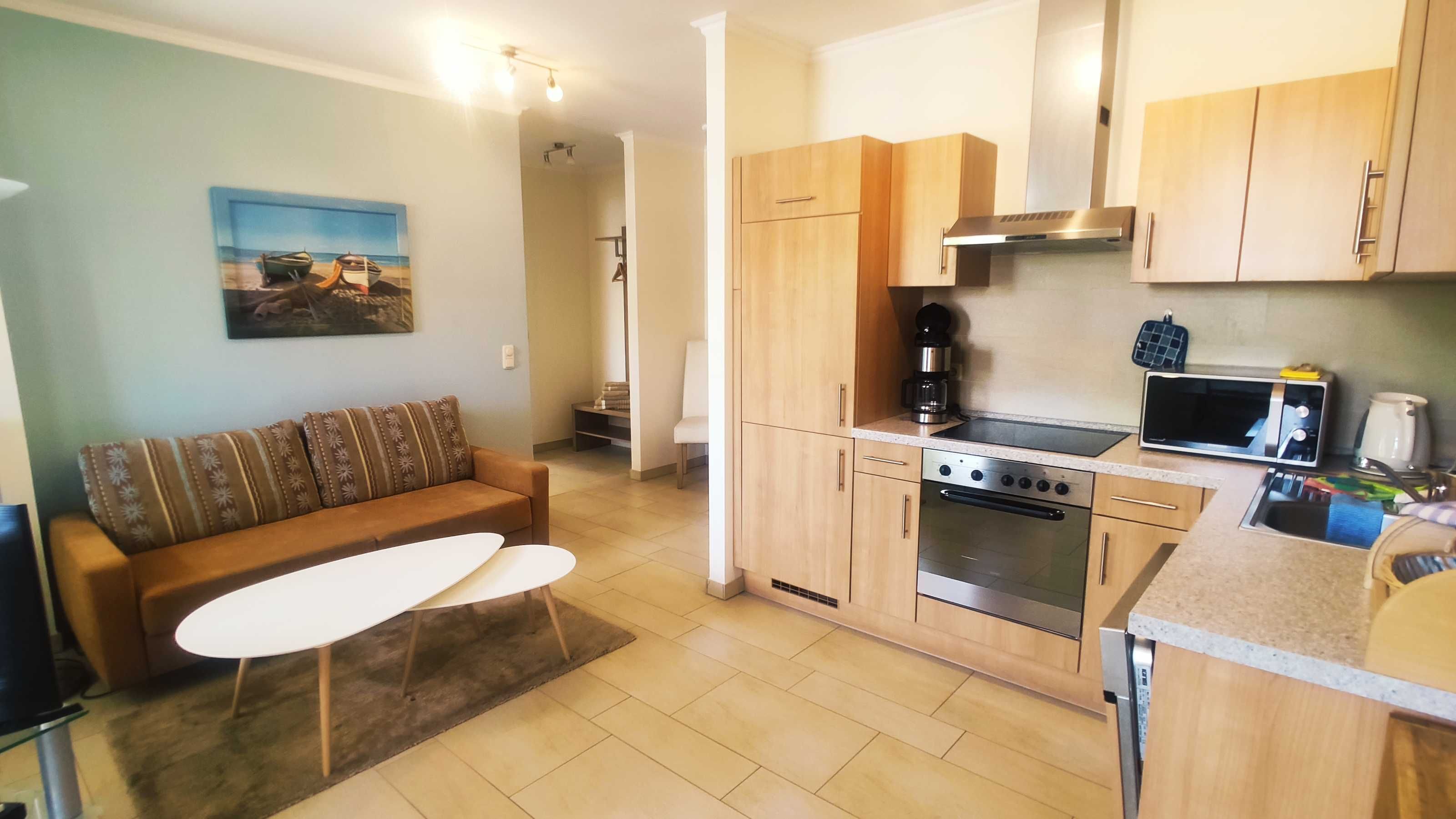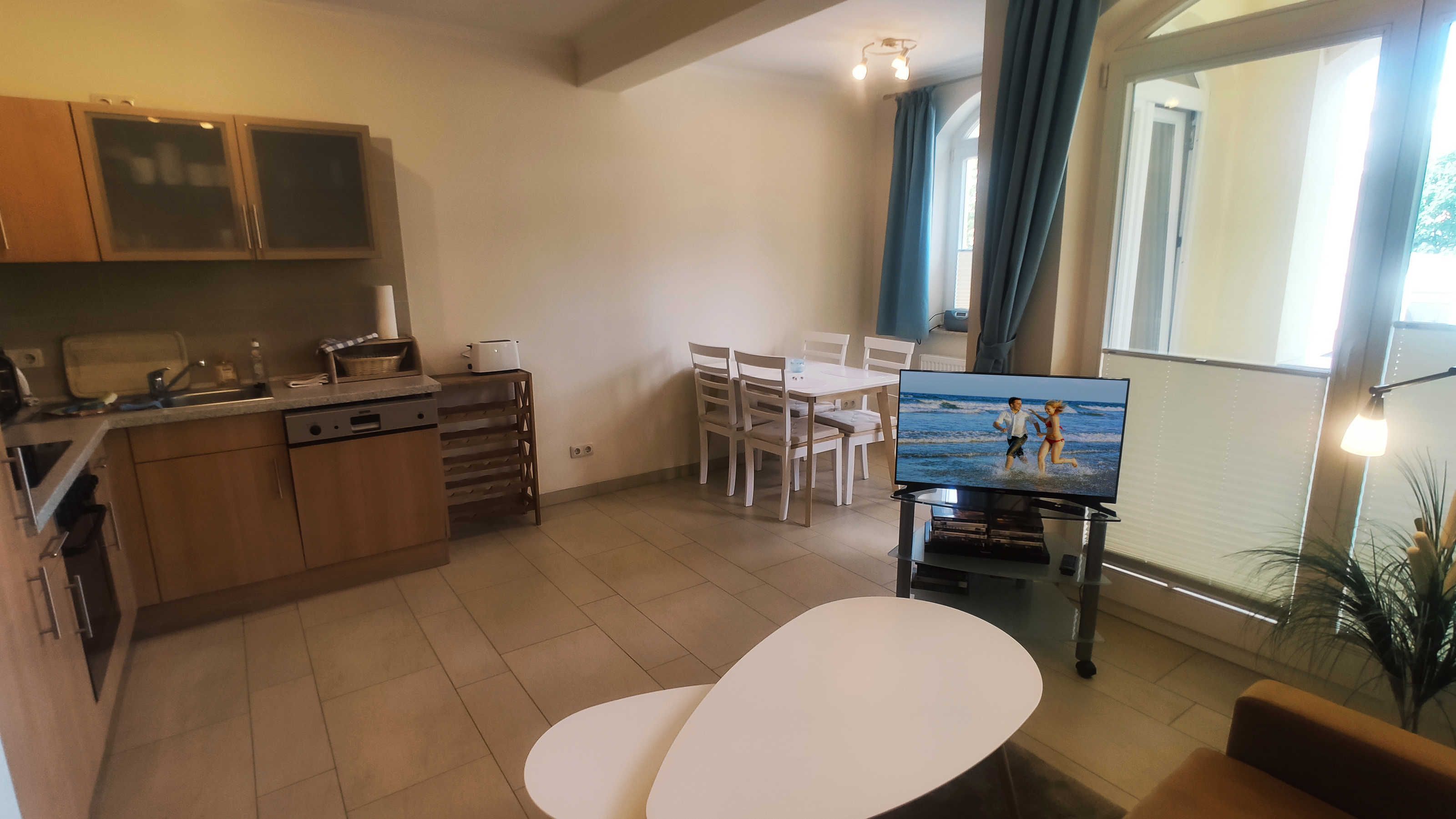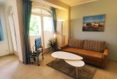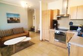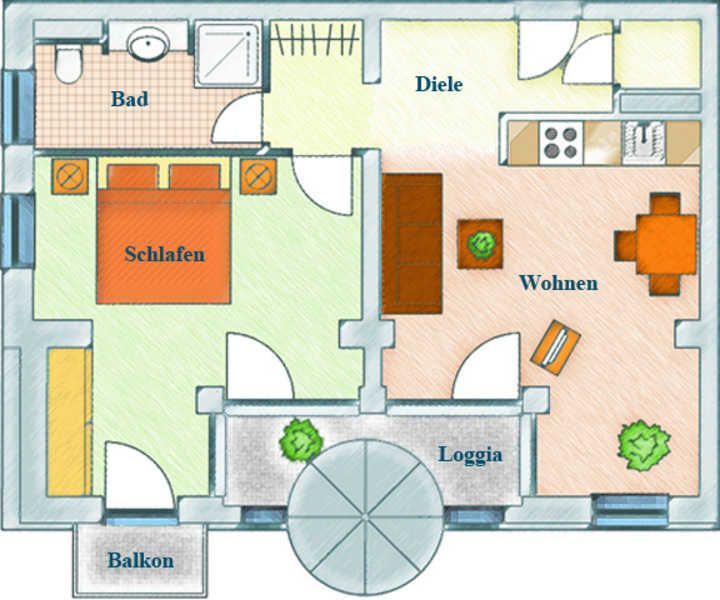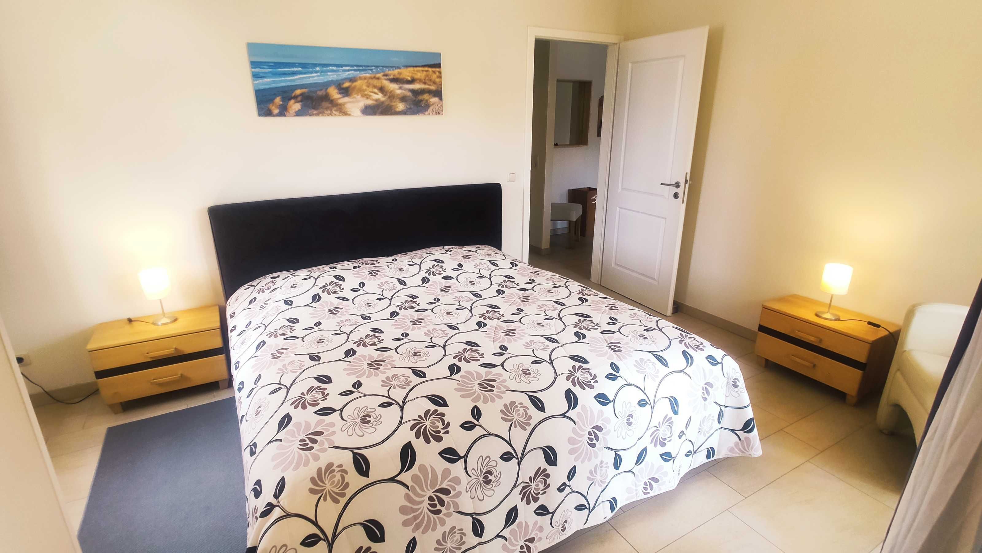 2-Zimmer-Ferienwohnung im Obergeschoss, bestehend aus Wohnzimmer (Fernsehcouch, TV, Essecke), Schlafzimmer (Ehebett mit getrennten Matratzen), Küche (Mikrowelle, Geschirrspüler), Bad mit WC/Dusche, Balkon und Loggia zur Westseite.